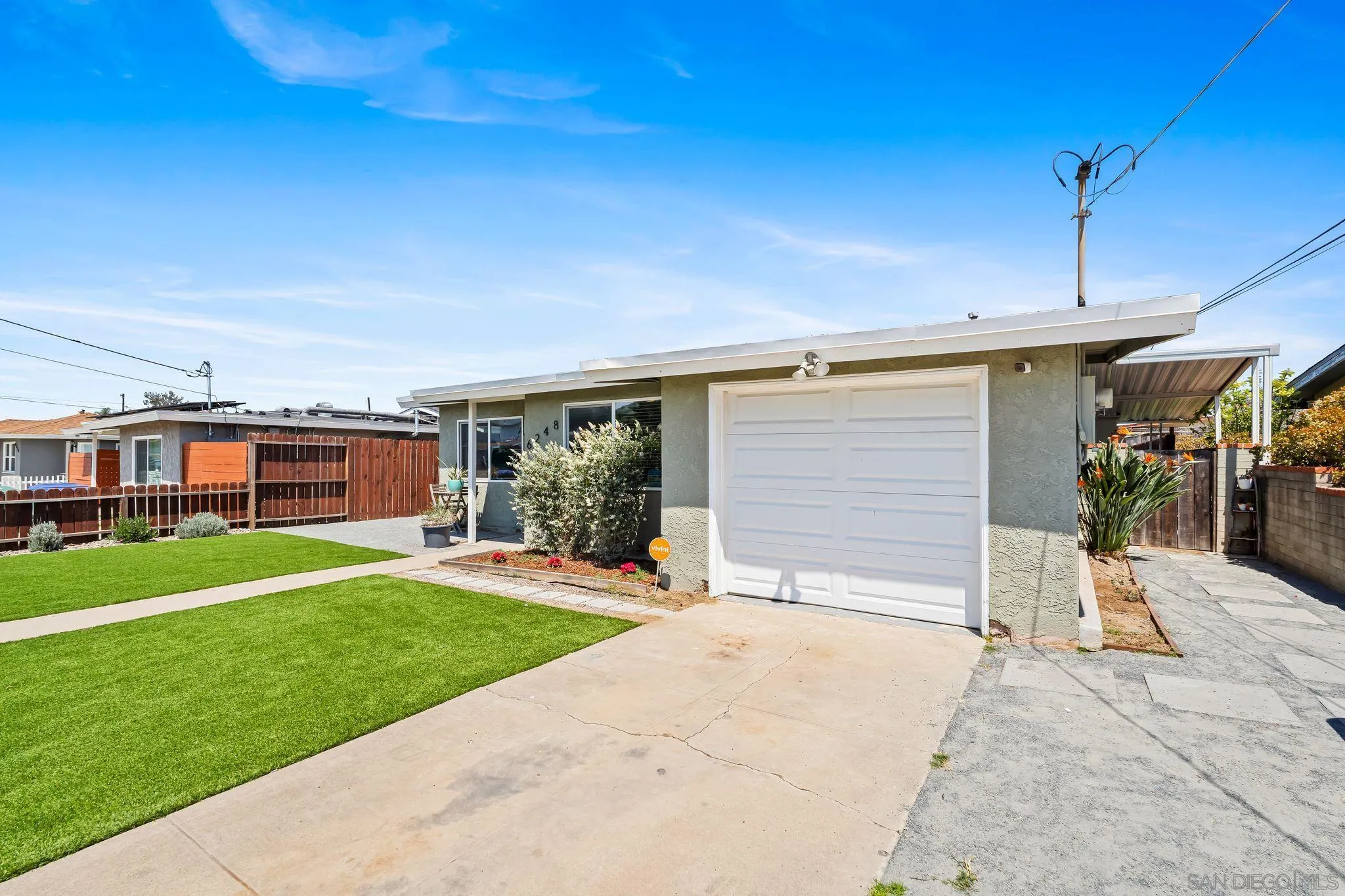 Welcome home to this charming, updated 2-bedroom, 1-bathroom single-story detached residence! Perfectly situated on one of the best lots in 92115, this home offers immediate comfort and style. Step inside and discover a sizable living area that flows seamlessly into an open-plan kitchen with a breakfast nook and stainless steel appliances. Enjoy modern conveniences including brand-new mini-split HVAC systems, fresh paint throughout, and updated flooring. The primary suite easily accommodates a king-size bed and boasts ample closet space. The secondary bedroom, also generously sized, features private exterior access to a delightful side patio complete with a beautiful brick wood-burning fireplace/BBQ area. Both the front and back yards boast new turf, with the backyard being a true gem – level, pristine, and the perfect place for parties, family gatherings, or sunbathing. This property is fantastic just the way it is, ready for you to enjoy. As an incredible bonus, imagine the possibilities this level lot, full of opportunity, holds! Easily add more square footage by utilizing the single-bay garage, or explore the potential of constructing an ADU. Don't miss this exceptional opportunity to own a beautiful home with fantastic future potential!
