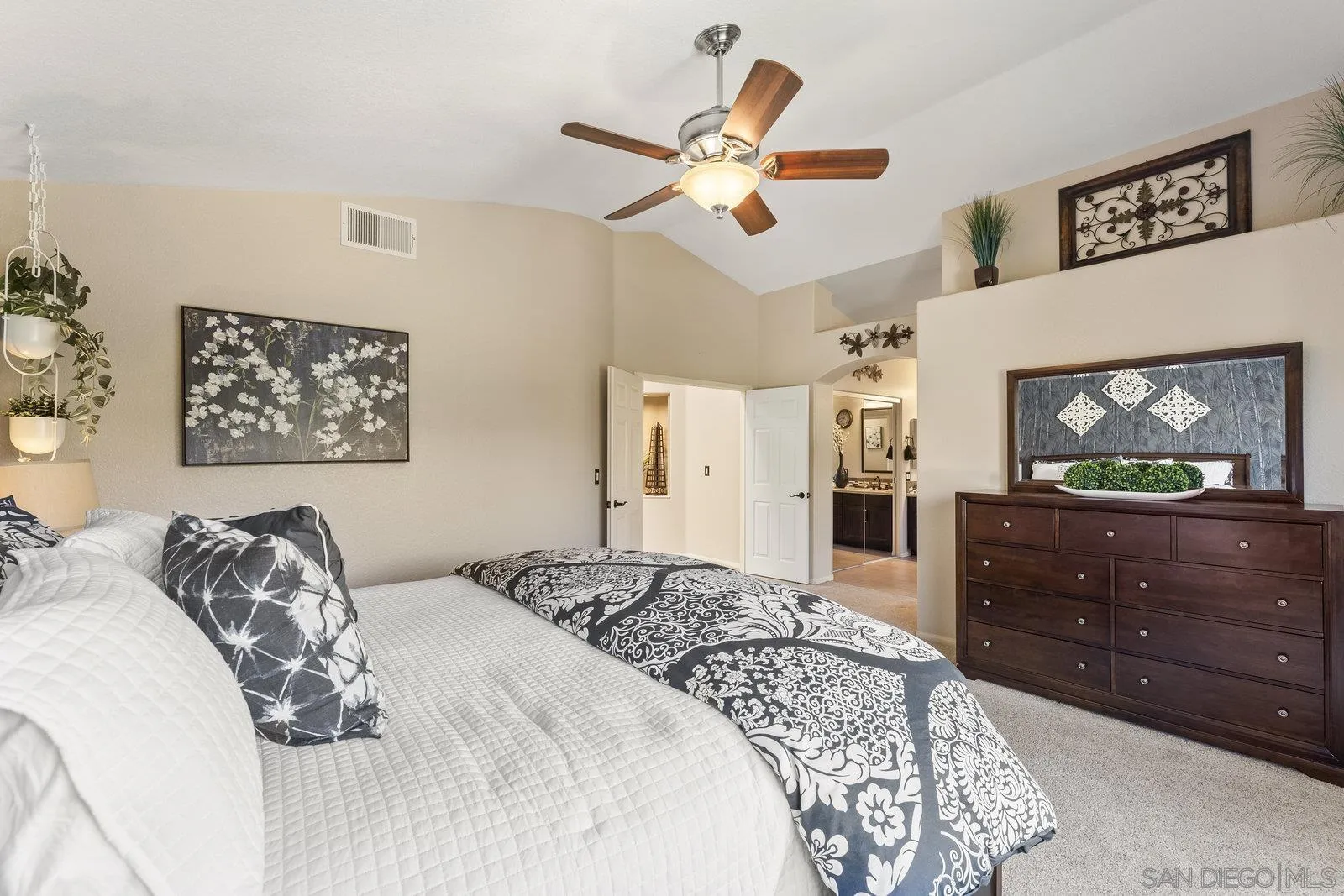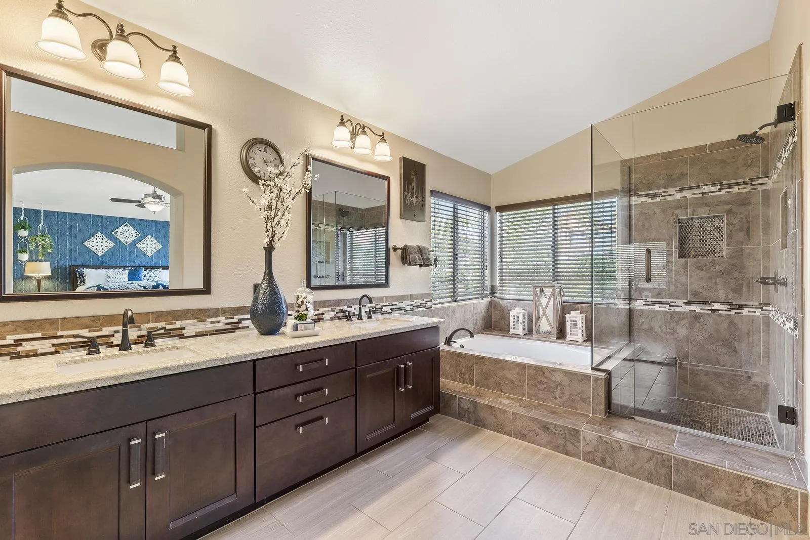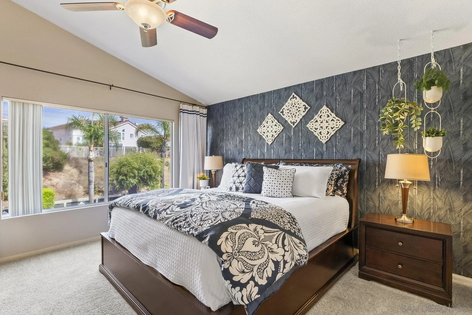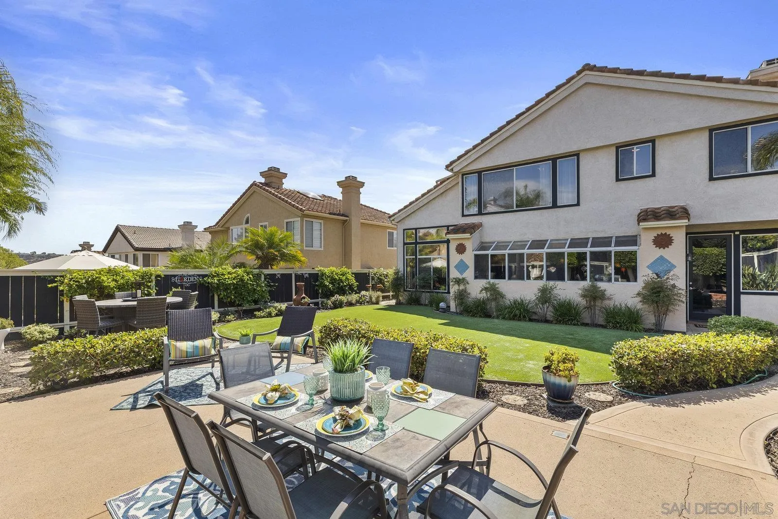 Welcome to this inviting home in the highly sought-after Park Village community. A bright and open floor plan with vaulted ceilings and large windows creates a welcoming atmosphere filled with natural light. The main level includes a full bath and versatile office or flex room, perfect for guests or working from home. The kitchen features granite counters, stainless steel appliances, rich wood cabinetry, and greenhouse windows looking out to the backyard. Upstairs, spacious bedrooms provide comfort and privacy, while the primary suite is a true retreat with a step-in shower, soaking tub, dual vanities, and a walk-in closet. The living areas are designed for both everyday living and entertaining, with a cozy fireplace and seamless flow between spaces. Step outside to a private backyard oasis with multiple seating areas, mature landscaping, and plenty of space to relax or host gatherings. A built-in BBQ makes outdoor dining and entertaining easy, while lush greenery and shade from mature trees create a tranquil setting. Additional highlights include owned solar for energy efficiency, and a three-car garage. Park Village is known for its welcoming community feel, nearby trails and open space, top-rated Poway Unified schools, and convenient access to shopping, dining, and freeways. Experience the perfect balance of comfort, convenience, and the vibrant lifestyle that makes Park Village so desirable.