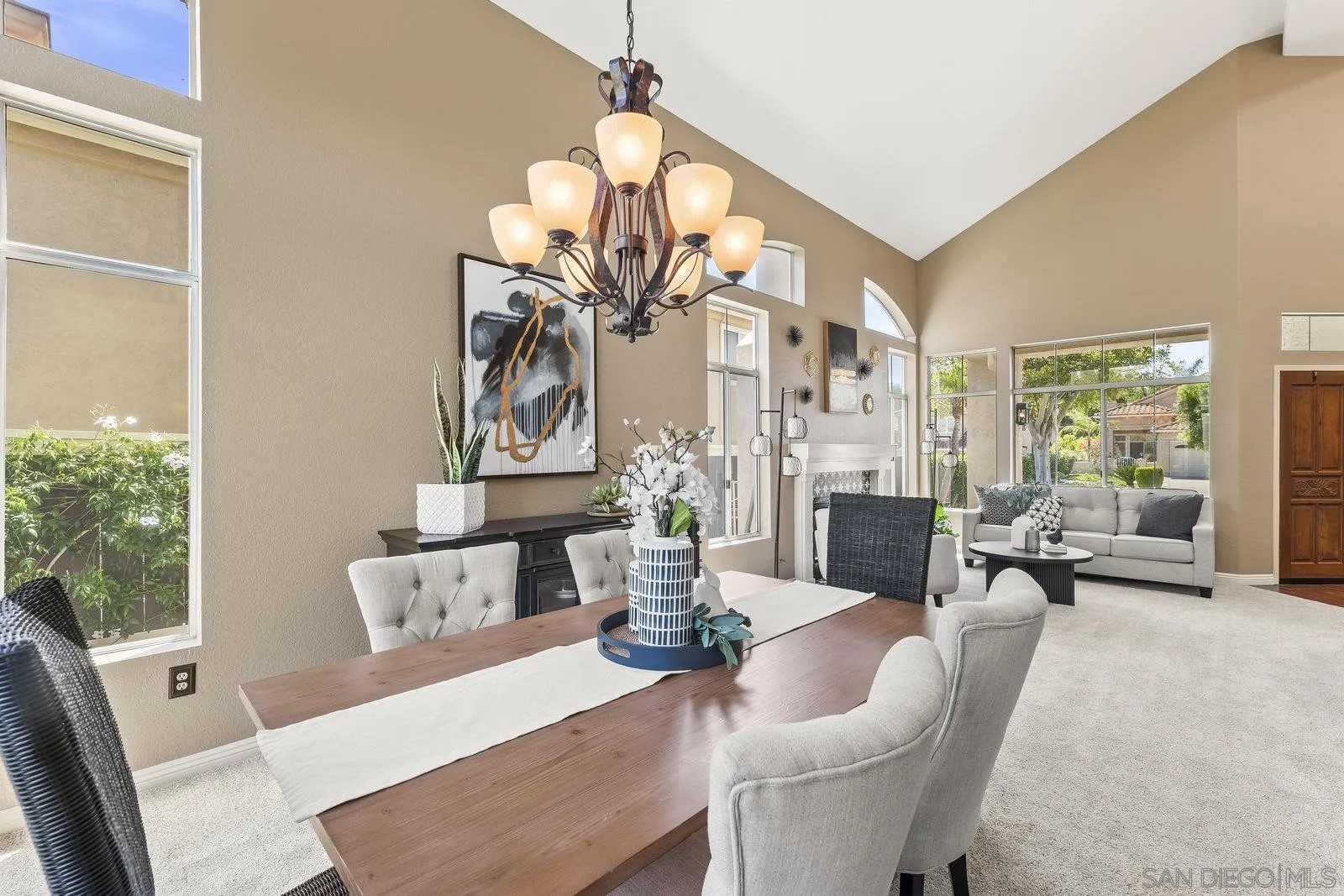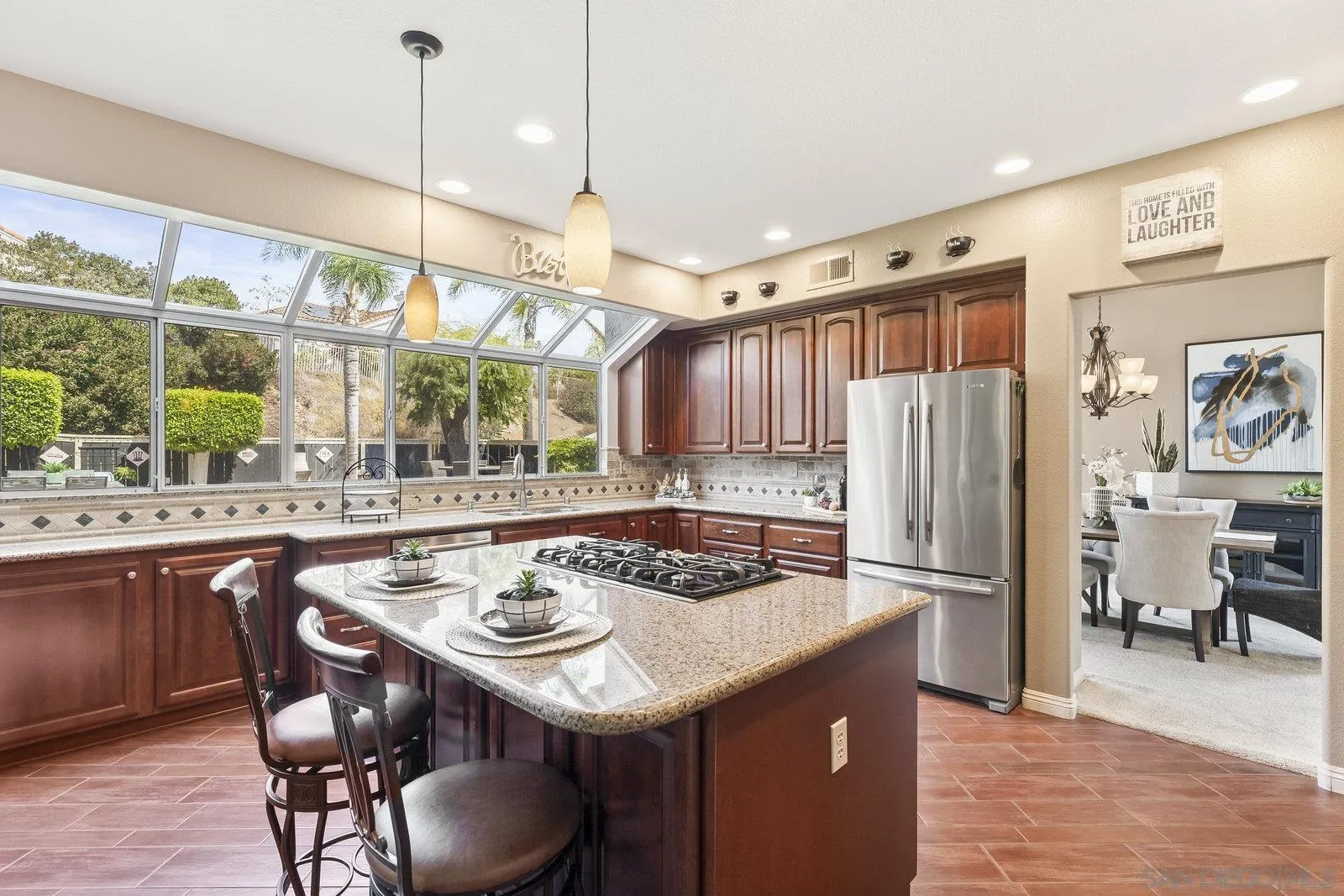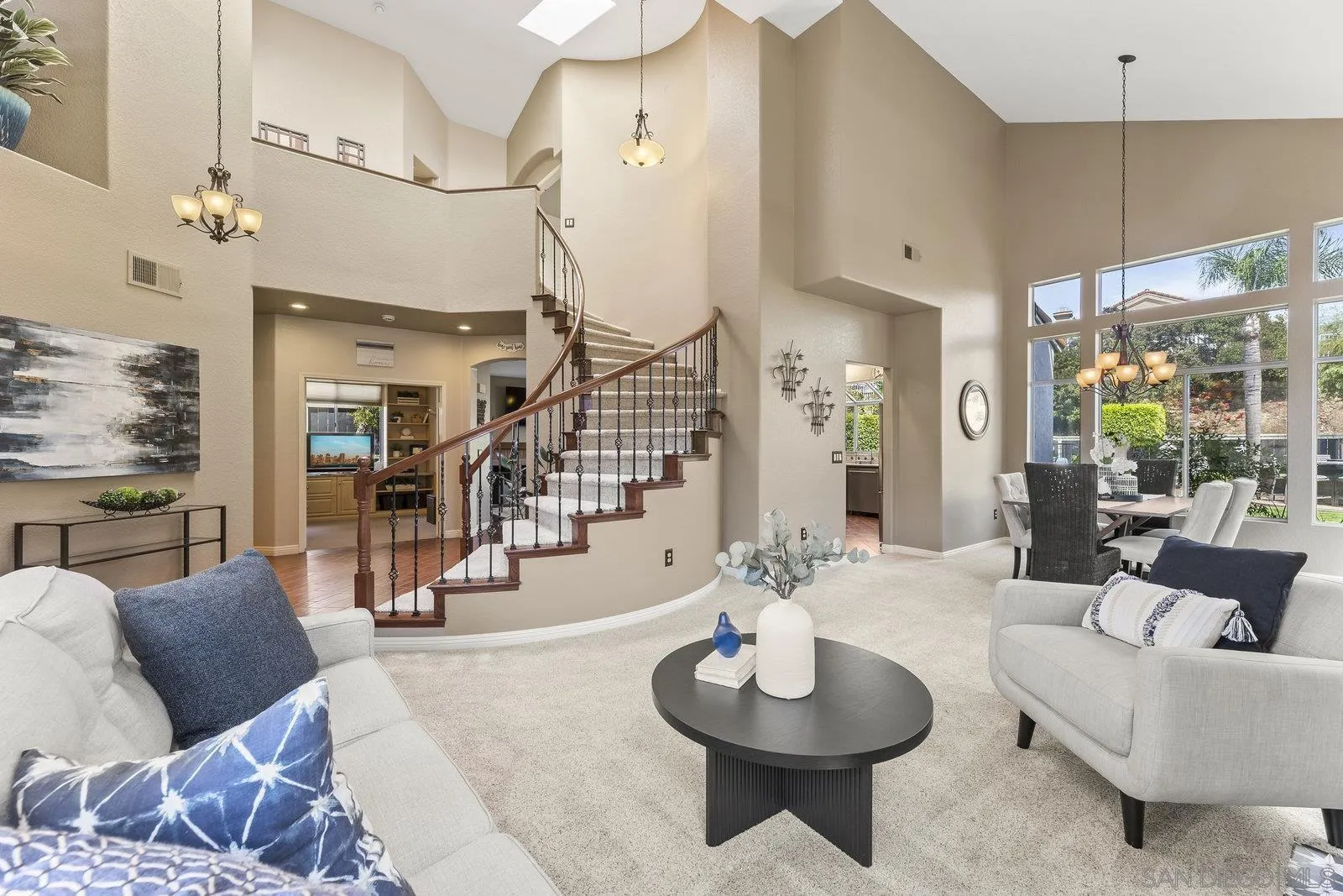Welcome to this inviting home in the highly sought-after Park Village community. A bright and open floor plan with vaulted ceilings and large windows creates a welcoming atmosphere filled with natural light. The main level includes a full bath and versatile office or flex room, perfect for guests or working from home. The kitchen features granite counters, stainless steel appliances, rich wood cabinetry, and greenhouse windows looking out to the backyard. Upstairs, spacious bedrooms provide comfort and privacy, while the primary suite is a true retreat with a step-in shower, soaking tub, dual vanities, and a walk-in closet. The living areas are designed for both everyday living and entertaining, with a cozy fireplace and seamless flow between spaces. Step outside to a private backyard oasis with multiple seating areas, mature landscaping, and plenty of space to relax or host gatherings. A built-in BBQ makes outdoor dining and entertaining easy, while lush greenery and shade from mature trees create a tranquil setting. Additional highlights include owned solar for energy efficiency, and a three-car garage. Park Village is known for its welcoming community feel, nearby trails and open space, top-rated Poway Unified schools, and convenient access to shopping, dining, and freeways. Experience the perfect balance of comfort, convenience, and the vibrant lifestyle that makes Park Village so desirable.