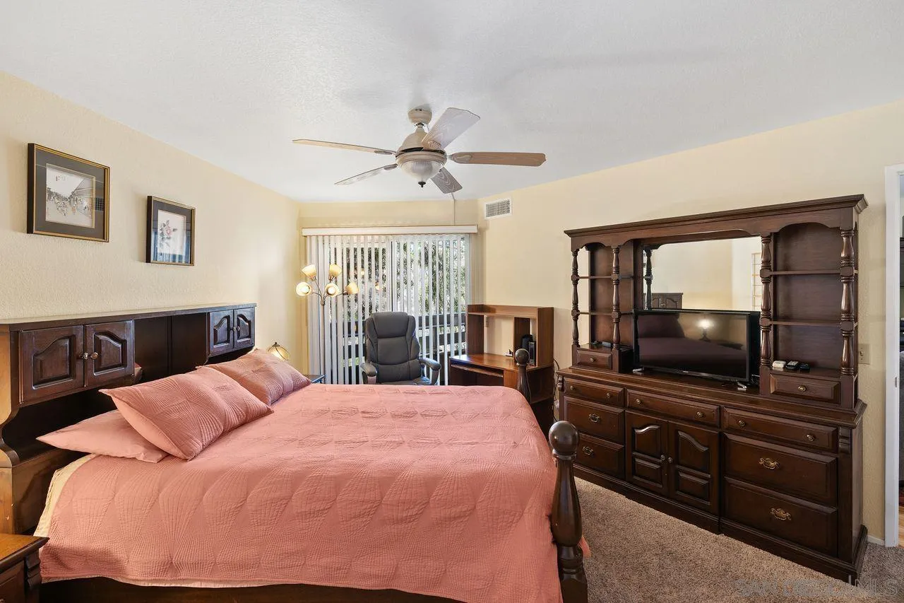 Welcome to this charming Fashion Valley condo offering the perfect combination of comfort, convenience, and style. Thoughtfully designed for easy living, this beautifully maintained 2BR/2BA home features a rare direct entry from the parking area—your tandem garage is just across the hall, only steps from your front door with no stairs at all. Inside, the inviting floor plan provides separate bedrooms and baths on opposite sides for privacy, ideal for guests or roommates. The kitchen showcases gorgeous cherry cabinets soaring to the ceiling, granite countertops, and ample storage, while the bathrooms have been tastefully updated, including a huge walk-in shower with a convenient seat and glass enclosure. Attractive laminate and carpeted flooring flow throughout, complemented by indoor stackable laundry, a cozy fireplace, and a spacious shaded patio perfect for outdoor relaxation. This well-appointed community offers a heated saltwater pool, fully equipped workout room, and beautiful tree-lined streets in a resort-like setting. Perfectly situated just minutes from Fashion Valley Mall, beaches, fine dining, golf courses, and downtown San Diego, this home combines an unbeatable location with practical design and modern upgrades. Optional Purchase: Home may be sold fully furnished, including linens, housewares, and décor, offering a truly turnkey opportunity for effortless move-in.