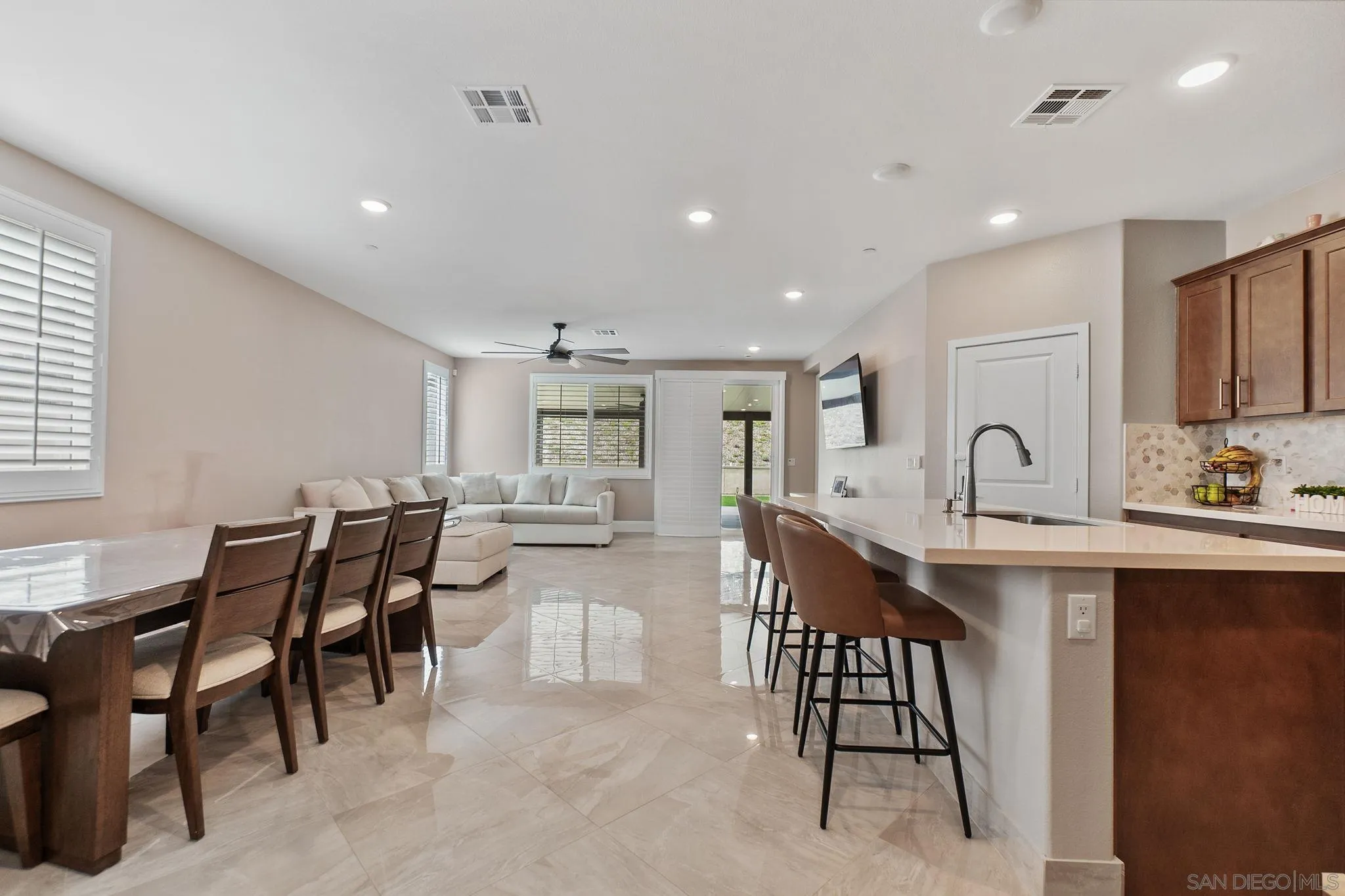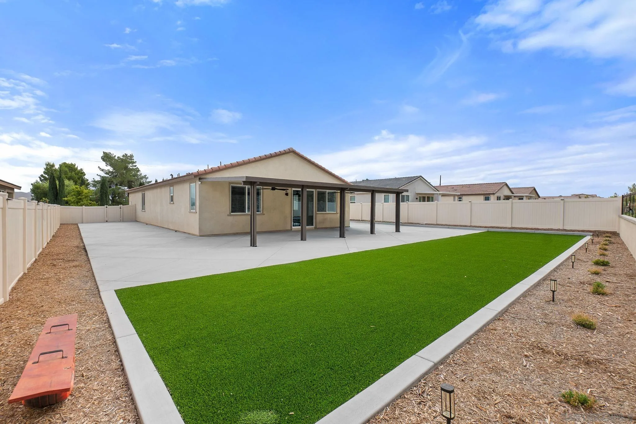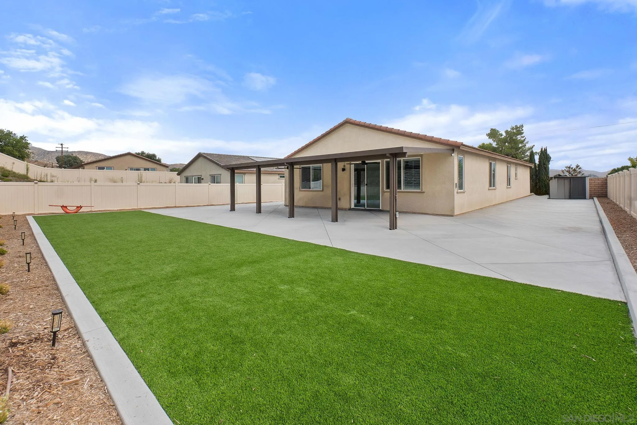 Welcome to this beautiful family home, less than a year old and in pristine, like-new condition! The Smart Choice: Skip the long build time, construction noise, and hidden costs—this home has already been upgraded and perfected for you. This beautiful residence boasts over $100,000 in premium upgrades, saving you significant time and expense. Exquisite, gleaming tile flooring flows throughout, complemented by an elegant kitchen backsplash. Enjoy pure, softened water with a top-tier water softener system. The expanded side yards with refined walkway, and property separation elevate curb appeal and functionality. The backyard is an entertainer’s paradise, featuring diamond-cut cement, low-maintenance turf, and a stucco-coated block matching wall/vinyl enclosing the yard for privacy and safety, all with a beautiful view of the mountain. Unwind on the upgraded patio with a 15 ft deep cover, complete with two cooling fans and six ambient lights. The garage dazzles with durable epoxy flooring, and an advanced 8-camera security system ensures peace of mind. Freshly painted interiors with upgraded sleek shutters on every window, and modern fans in every room create a turnkey home. With ample space for RV parking (HOA will approve, 12–16 ft wide to accommodate most RVs with ease) and room to add a pool, this expansive lot offers unmatched versatility. Nestled on one of the largest lots in the community—over 12,000 sq ft—Why wait and spend thousands on upgrades when this home has it all? Move in today and enjoy the cost savings of these professionally completed enhancements.
