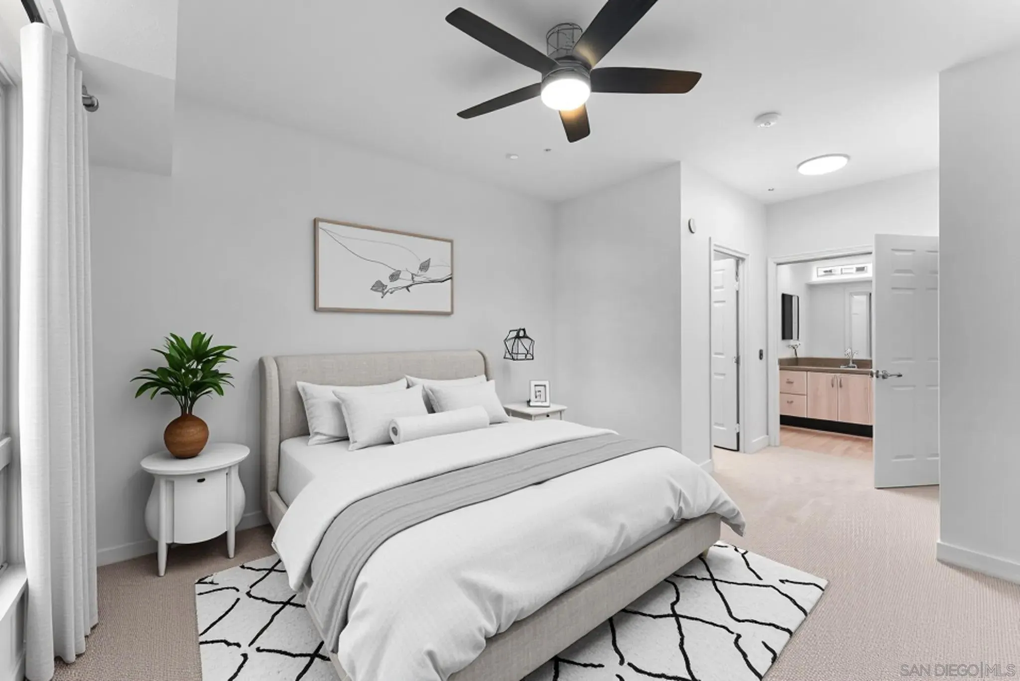 Welcome to this stunning 2-bed Union Square penthouse with a loft, offering stylish living. The bright living room features dramatic 18-foot ceilings, a cozy fireplace, and a private balcony, while a spiral staircase leads to a loft with direct access to a spacious rooftop deck—perfect for entertaining or relaxing.Positioned on the top floor with no neighbors above or on either side, this home offers unmatched privacy. Recent upgrades include brand-new carpet, fresh paint, and updated light fixtures, making it completely move-in ready. Amenities include 2 parking spaces with storage, fitness center, spa, sauna, EV charging station, and more. Located just moments from Balboa Park, Petco Park, Gaslamp, and an endless selection of dining and shopping. With a Transit Score of 79 and easy freeway access, commuting and exploring the city is a breeze.