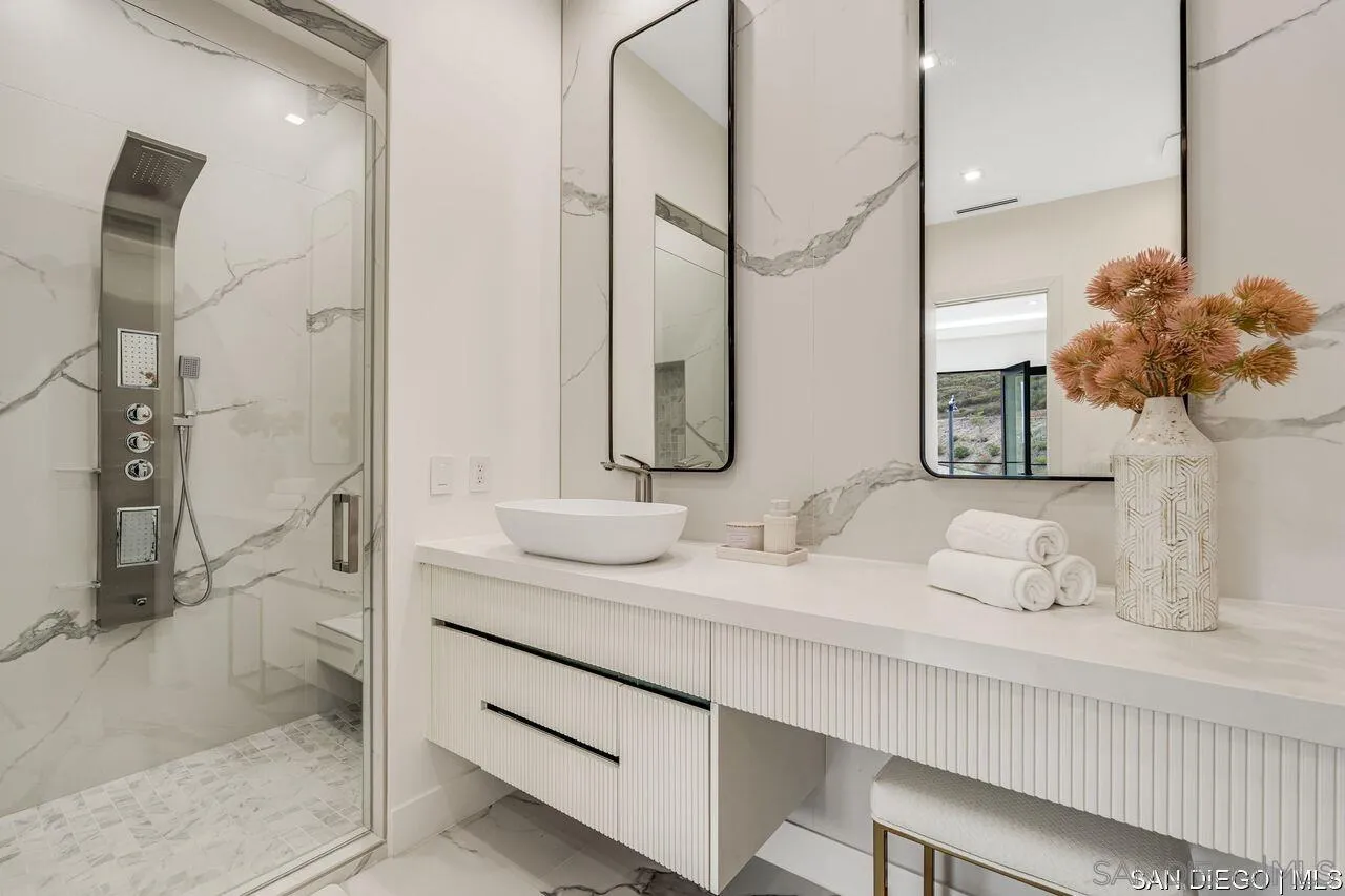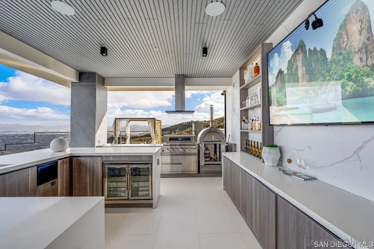 Welcome to your dream home, a 6-bedroom, 6.5-bathroom masterpiece perched at the highest peak of the prestigious Cielo community in Rancho Santa Fe. Nestled in a quiet cul-de-sac, this 8,700 sq. ft. new construction blends modern luxury with breathtaking panoramic views. Step through the grand entrance and into a world of elegance, marked by a stunning double staircase and sunlit open-concept spaces. Floor-to-ceiling glass doors seamlessly connect indoor and outdoor living, while granite and porcelain finishes add a touch of sophistication throughout. The gourmet kitchen is a chef's delight, featuring top-of-the-line appliances, a spacious island with bar seating, and ample space for entertaining. The grand primary suite is a true retreat, complete with a private balcony, cozy fireplace, and breathtaking sunset views. Each additional en suite bedroom is thoughtfully designed with custom closet cabinetry for maximum comfort and privacy. The property also includes a versatile 1-bedroom, 1-bathroom ADU with a private entrance, ideal for guests, a home office, or extra living space. Step outside to the ultimate entertainer's backyard, boasting a grand pool, hot tub, covered bar, built-in grill with pizza oven, and a cozy fire pit, all set against stunning vistas. Additional highlights include an elevator, a spacious 4-car garage, a golf cart garage, a private driveway, and 65 solar panels on a custom-designed metal roof. Located in a gated community with 24-hour guard service, this home offers both security and access to top-tier amenities, including clubhouses, shopping, gyms,