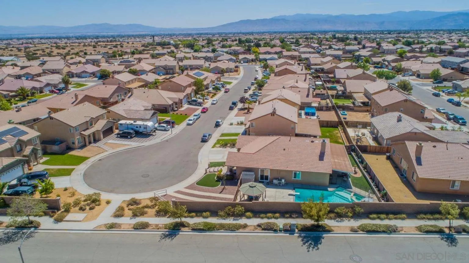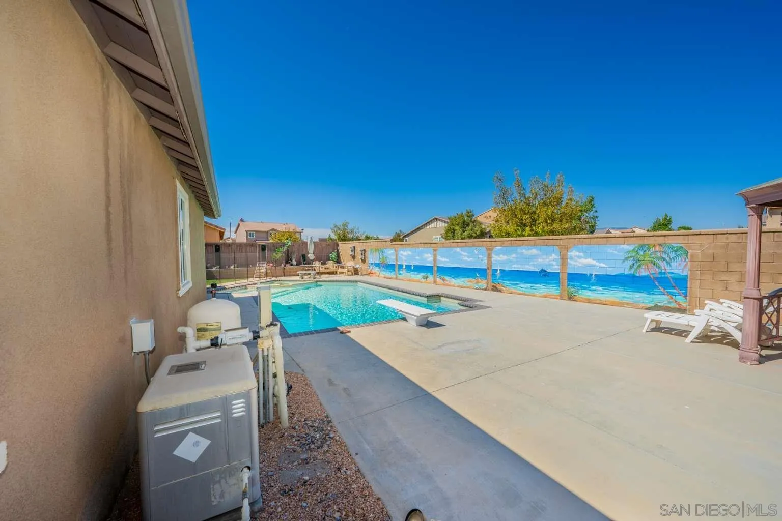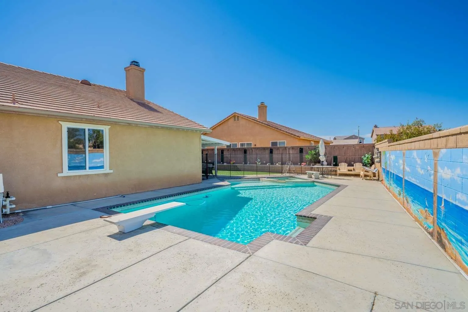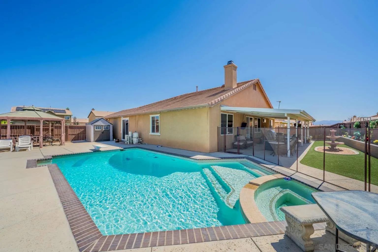 Welcome to this stunning single-story pool home located at the end of a quiet Hesperia cul-de-sac with RV parking. Built in 2005, this pride-of-ownership property offers 2,364 sq. ft. of living space on a 10,397 sq. ft. lot with 4 bedrooms and 2 bathrooms. Inside, you’ll find a spacious formal living and dining room with tile flooring, plus a versatile office or optional 5th bedroom with custom French doors. The open-concept kitchen features granite countertops, a center island, stainless steel appliances, and a dining area that flows into the living room with a cozy fireplace. The primary suite includes a huge walk-in closet, and a bathroom with dual sinks, soaking tub, and separate shower, while three additional bedrooms and a guest bath with double sinks provide plenty of space for you and your guests. The backyard is perfect for entertaining with a sparkling pool, Jacuzzi, covered patio, fountain, gazebo, low maintenance landscaping turf and rock, lighting, large shed, and a beautiful 45-ft custom wall mural. Additional highlights include recessed lighting, ceiling fans in every room, tinted windows, an insulated garage door, attic stairs, and two sliding glass doors for easy outdoor access. Sun Run Solar 5.98 kW system installed in 2021. Conveniently located near schools, parks, restaurants, and with quick freeway access, this home truly has it all don’t miss the chance to make it yours!