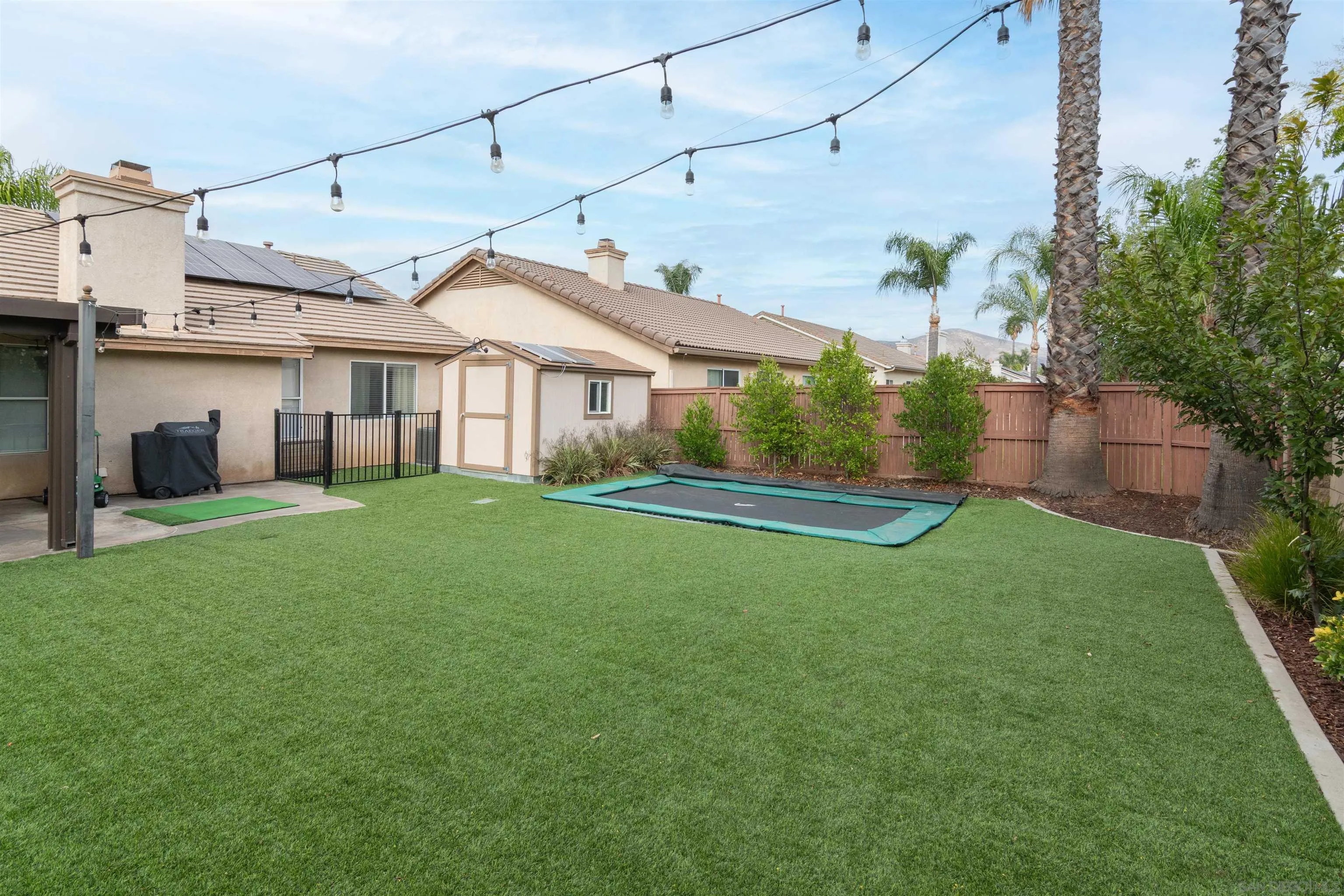 Welcome to 31867 Crecy Drive! A beautifully updated single-story retreat where comfort, convenience, and modern living come together. Step inside this 3 bed, 2 bath home offering light-filled living with vaulted ceilings, flexible office nook, new crown molding, fireplace, custom shutters with a lifetime warranty, and a custom designed walk-in closet. Every detail has been thoughtfully upgraded to make this home truly move-in ready. Dream Kitchen: Cook and entertain with ease in a modern kitchen featuring quartz countertops, white shaker cabinetry, a new Samsung Bespoke Smart Refrigerator with beverage center, Samsung Smart dishwasher, and a premium Puronics Hydronex whole-home water softener with Alkaline reverse osmosis filtration in the kitchen. Outdoor Living: Relax and entertain in a spacious backyard retreat complete with Alumawood covered patio, low-maintenance turf lawn, built-in ground trampoline, cozy firepit for sunset views, raised garden beds, a producing lemon tree, gated dog run, and an insulated shed; the perfect space for entertaining, gardening, or unwinding under the stars. Smart & Efficient Upgrades: Includes a ChargePoint 240-volt Smart Flex EV charger in the garage, new LED ceiling fans, and the added peace of mind of solar panels on the roof producing energy for long-term efficiency and savings for the home. Located in the desirable Temecula School District with quick access to both the I-15 and I-215, this home blends fresh finishes, thoughtful upgrades, and a prime location; offering the perfect balance of style, functionality, and convenience.