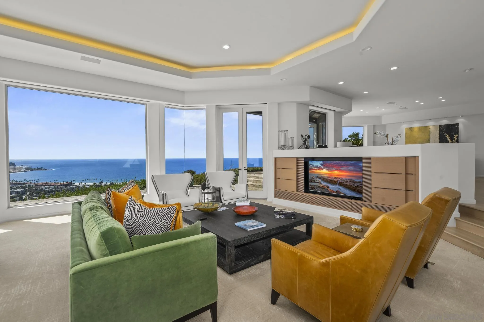 Dramatic, sweeping sunset and open sea views from the La Jolla hills south of La Jolla Cove to the La Jolla Beach & Tennis Club--and the whitewater of La Jolla Shores Beach and the North Shore-- are perfectly framed by renowned architectural designer, Ken Ronchetti, whose aesthetic sense of luxurious nonchalance invites maximum enjoyment of this spectacular panorama in a relaxed-while-opulent manner. Constructed with exceptional steel beaming and dozens of caissons, the unique architecture welcomes guests into a gate-guarded, secluded center courtyard with fireplace, water feature and two guest casitas leading to living areas including walls of glass to the views, recently renovated kitchen and baths, and a dazzling master suite embracing views to the marine environment outdoors. This important Prestwick Estates residence offers both exceptional stature and value for the most discerning clientele.