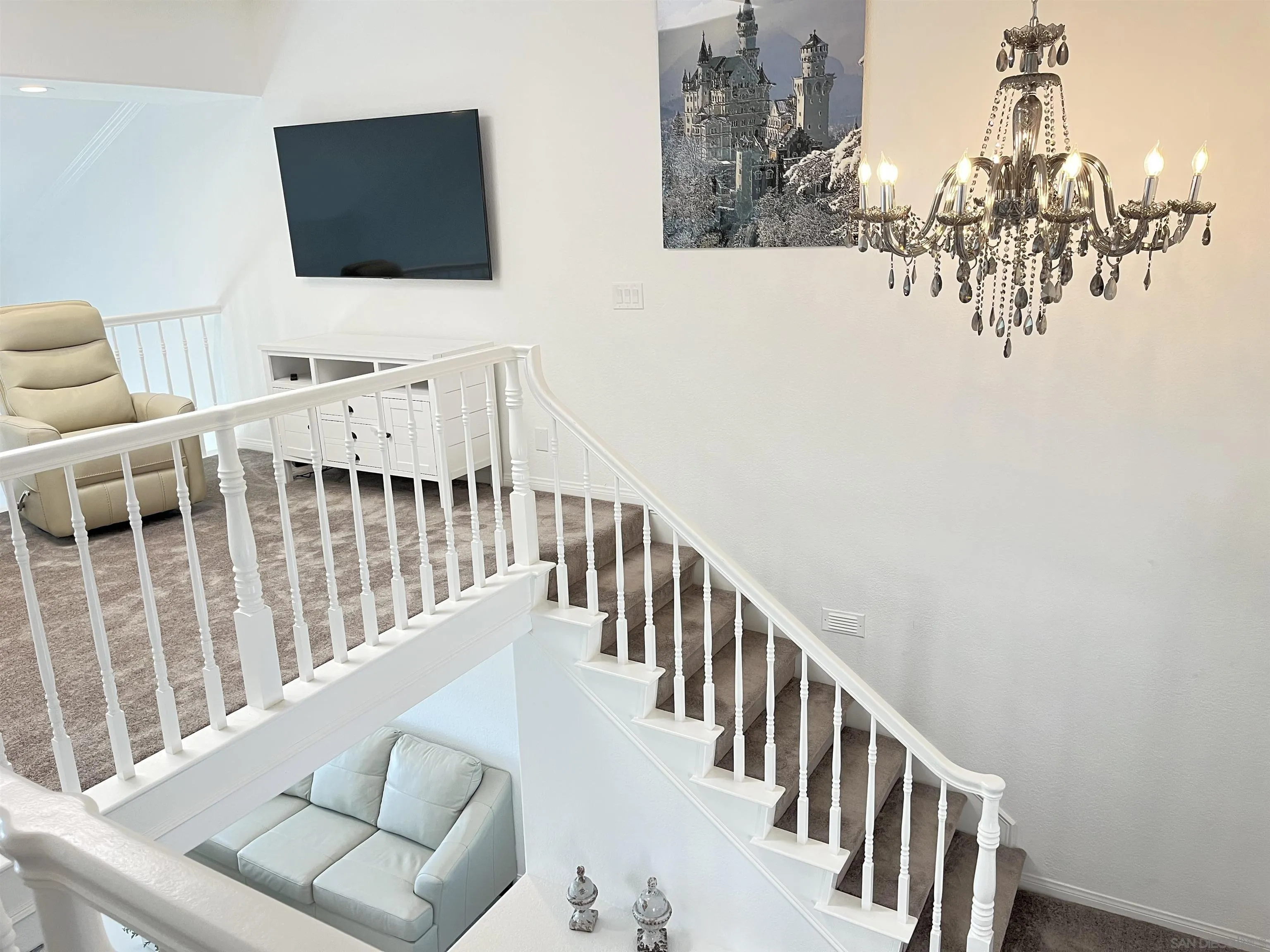 Best view in community! Discover this beautifully upgraded, turn-key home boasting stunning panoramic vistas. Views from living room, kitchen, breakfast/reading nook, and primary bedroom. Vaulted ceilings enhance the open living area, perfectly framing the view. Curl up with a book in the breakfast nook's built-in seating, warmed by a unique 3-sided glass fireplace shared with the living room. Upstairs, a sun-drenched family room loft overlooks the main level. The primary bedroom offers a walk-out deck showcasing the city lights and rolling hills. Both bedrooms have nicely finished en-suite bathrooms. Enjoy seamless indoor-outdoor living on the patio yard, enclosed in glass to maximize the breathtaking views and occasional visits from local mule deer, courtesy of the adjacent Aliso Creek trails.