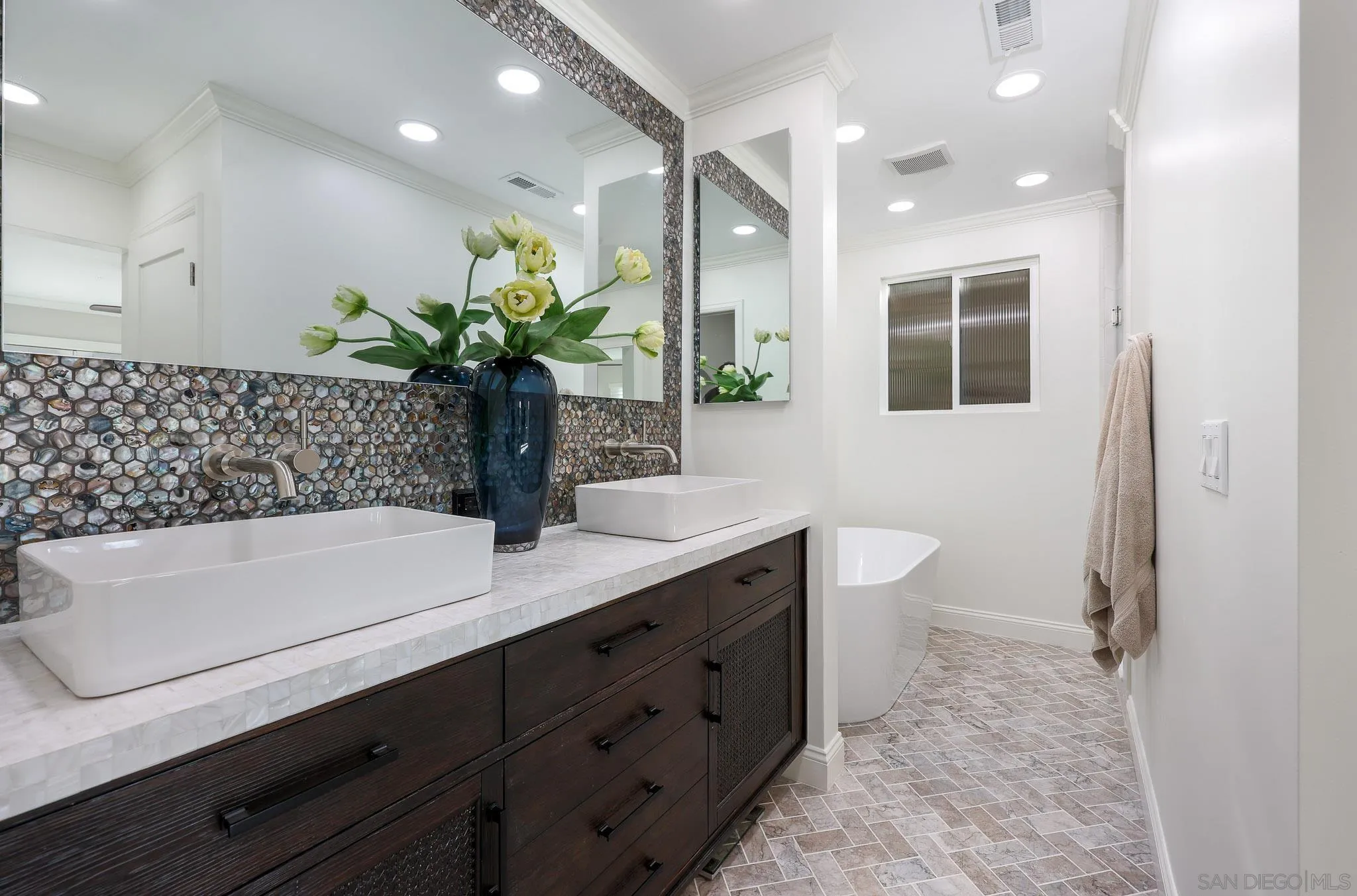 Incredible panoramic western sunset views and a walkable location—steps from dining, shops, parks, farmers markets, and community events in Downtown La Mesa—are only the beginning of what this home offers. From the water-wise landscaping to the solid mahogany entry, every detail reflects intention, craftsmanship, and pride. Inside, warmth and character define the home. Upstairs, crown moulding, custom wainscoting, and diagonal hardwood floors create a timeless feel. The kitchen features custom shaker cabinetry, quartzite countertops, an oak butcher-block island, Bosch appliances, a copper farmhouse sink, a walk-in pantry, and designer lighting. The upgraded balcony, finished with porcelain tile and cable railings, provides a peaceful place to unwind. The upper bath brings spa-inspired comfort with pebble flooring, an Italian vessel sink, a custom concrete countertop, and Tommy Bahama glass tile. Downstairs, luxury vinyl plank and upgraded moulding continue the cohesive design. The primary suite includes a freestanding soaking tub, walk-in shower, marble flooring, backlit mirrors, and a walk-in closet. Utility spaces are equally thoughtful, featuring a mahogany-appointed laundry/mud room, a fireclay sink, and additional storage in both the semi-finished attic and crawl space. Modern upgrades include owned solar, 200-amp service, a tankless water heater, and newer HVAC. The expansive lot offers space for gardens, outdoor dining, or potential ADU exploration. With a garage and extra driveway parking, the home is ready for guests, hobbies, and comfortable everyday living.