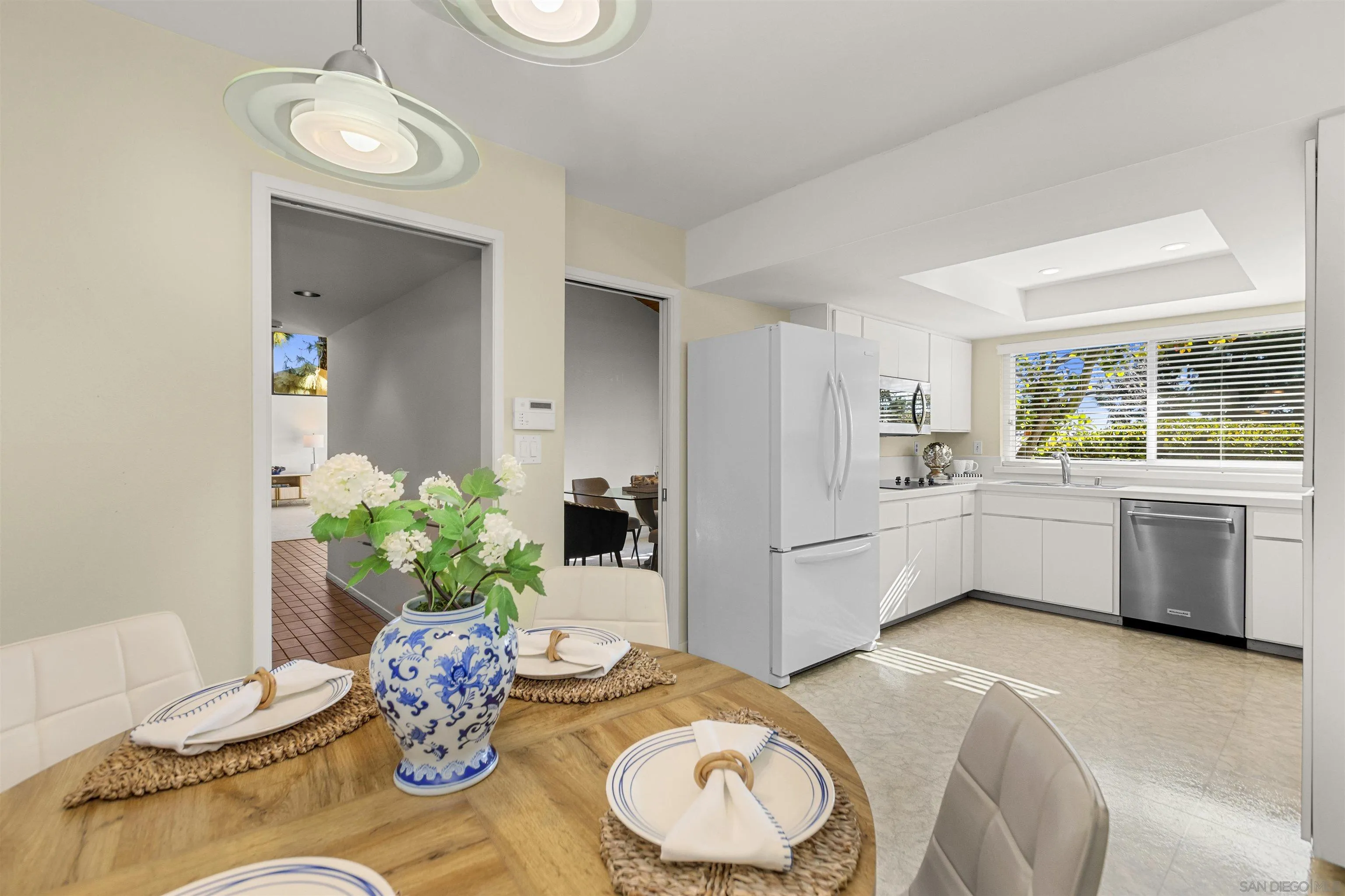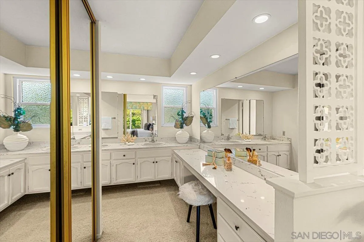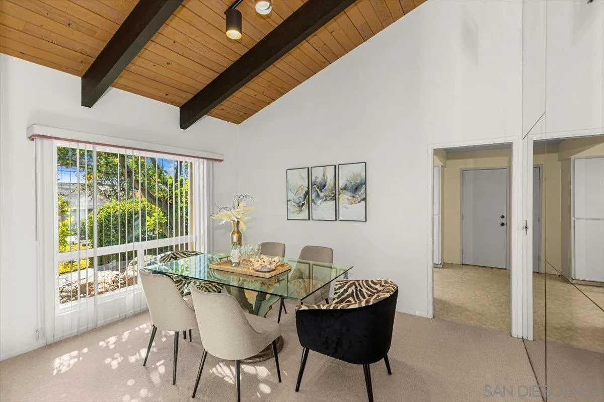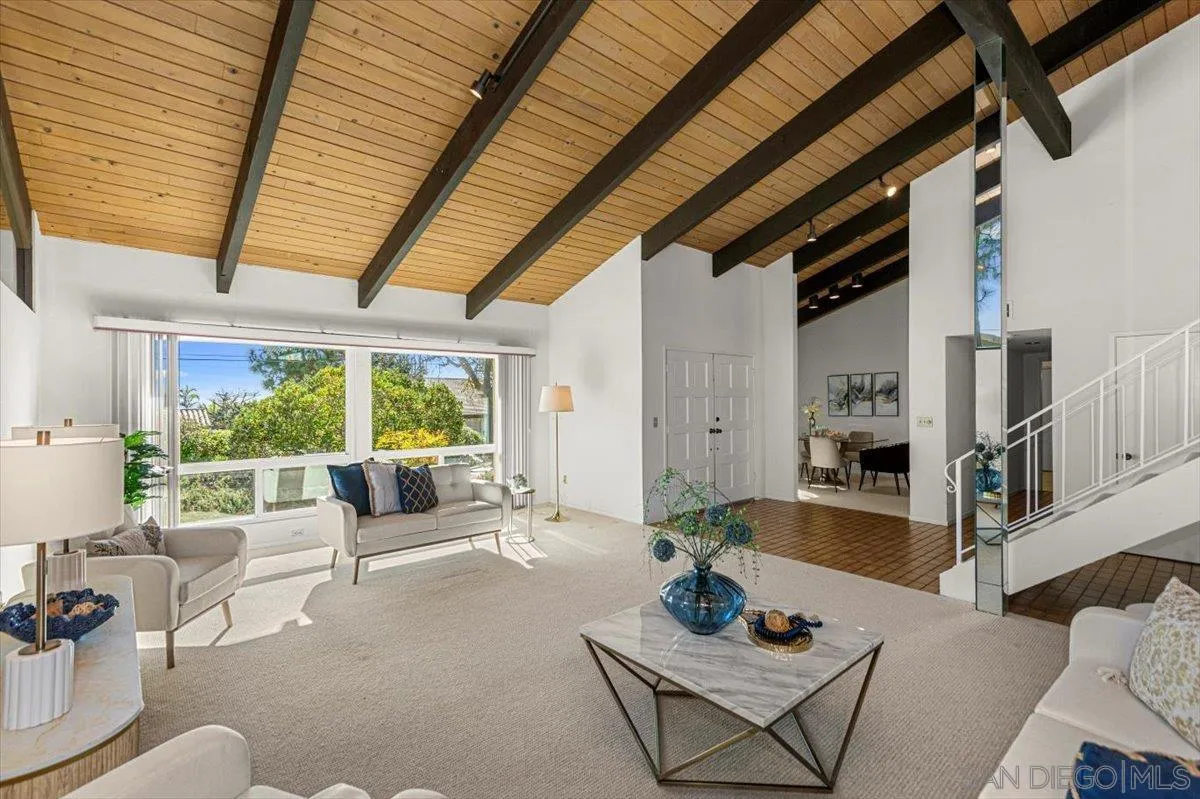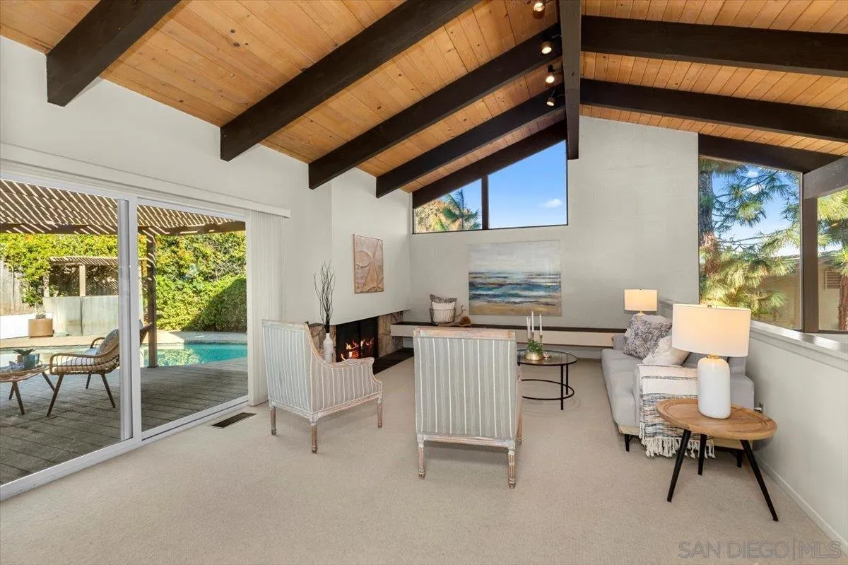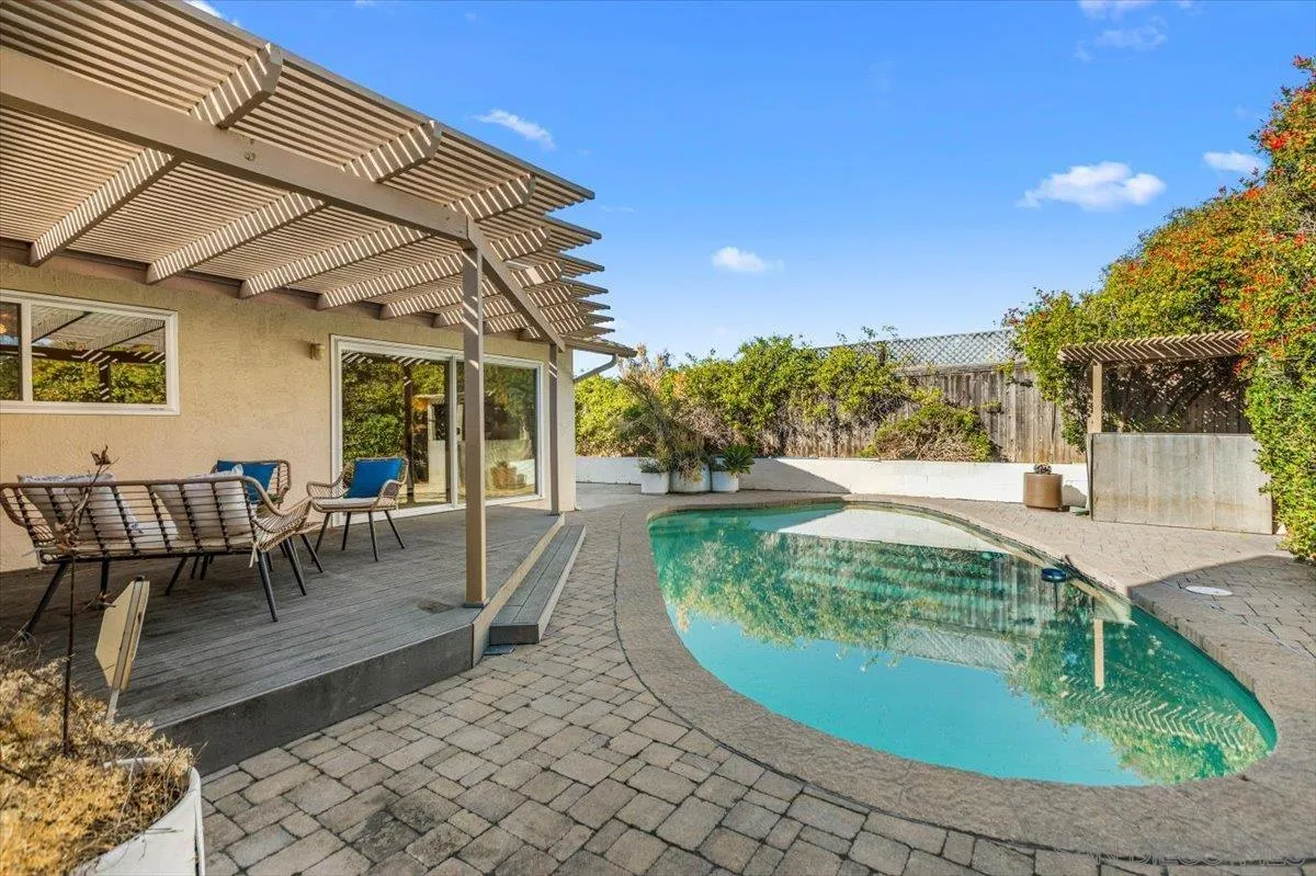 This exceptional 4-bedroom, 2.5-bath home is located in the highly sought-after Del Cerro community and sits on a generous lot backing to peaceful open space on one of the most coveted locations in the neighborhood. Inside, the spacious open-concept layout showcases soaring mid-century inspired tongue and groove ceilings, newer dual-pane windows, and expansive French sliders that provide a seamless connection to the private backyard. Step outside to enjoy a covered patio with Trex decking, a stunning pool surrounded by stylish brick pavers, and mature landscaping perfect for entertaining or relaxing summer days. Additional upgrades include newer kitchen appliances, slab countertops, and a newer roof. With convenient access to dining, shopping, parks, and top-rated schools, this home offers the very best of San Diego living. Don’t miss this incredible opportunity!