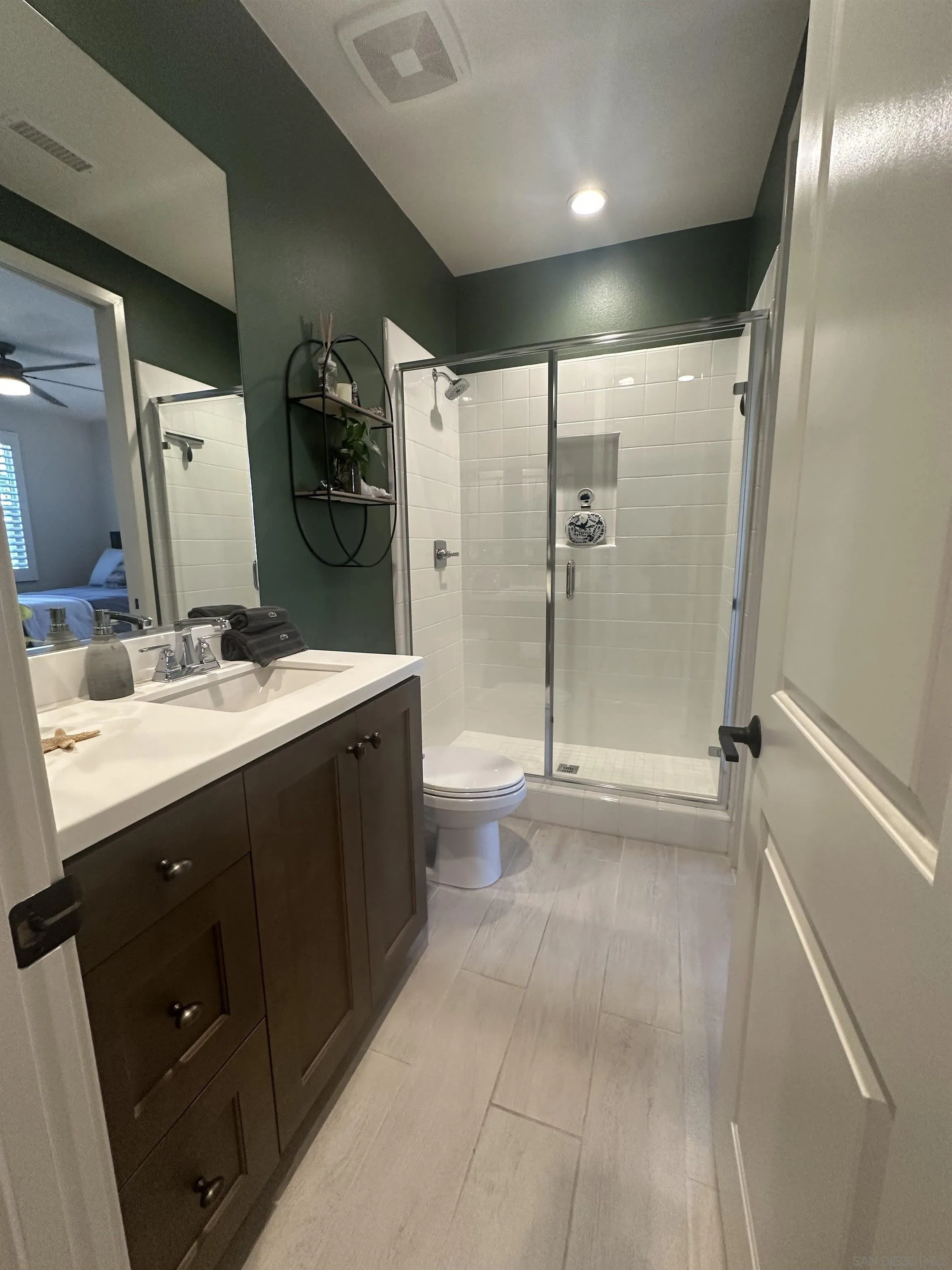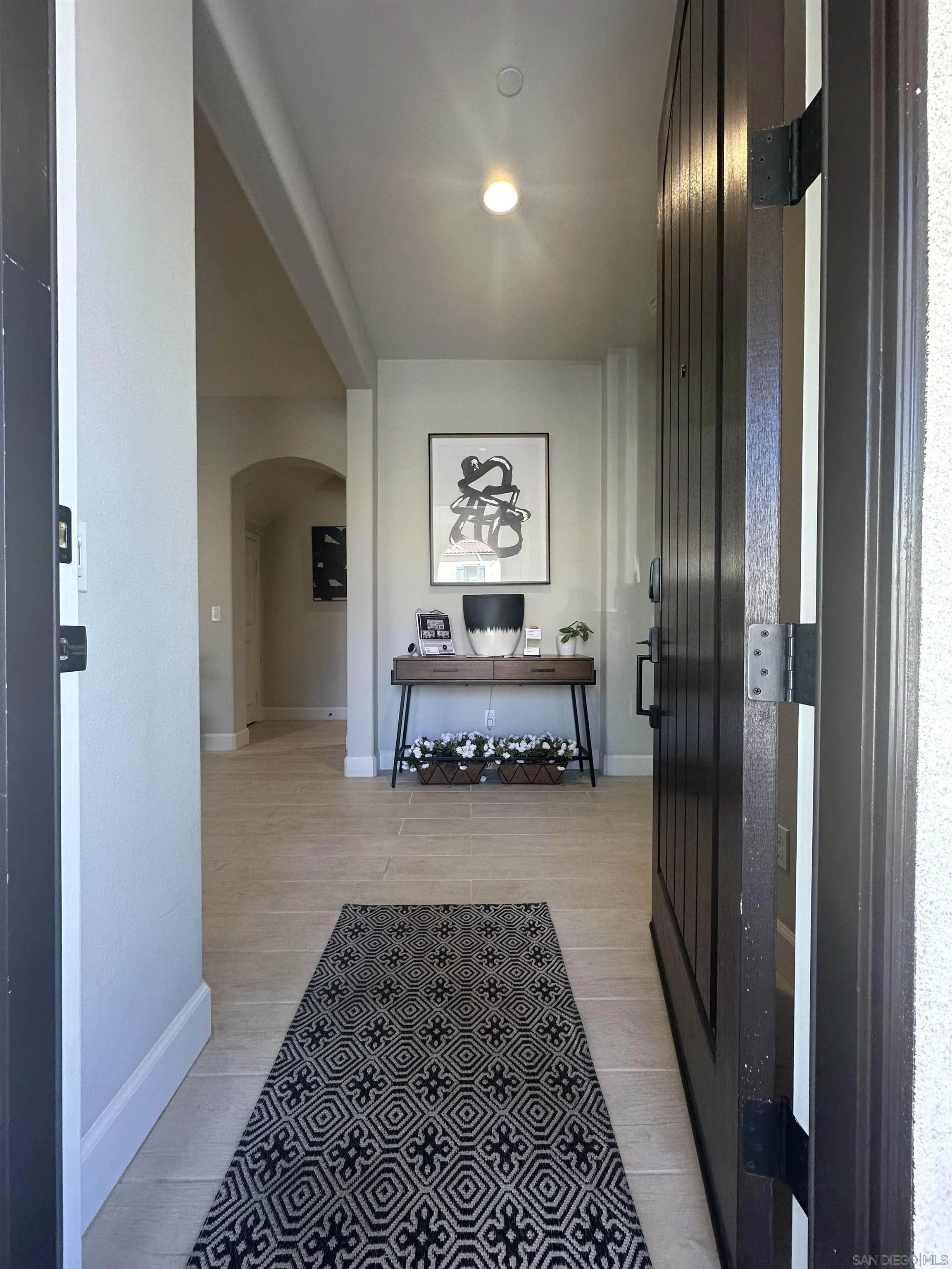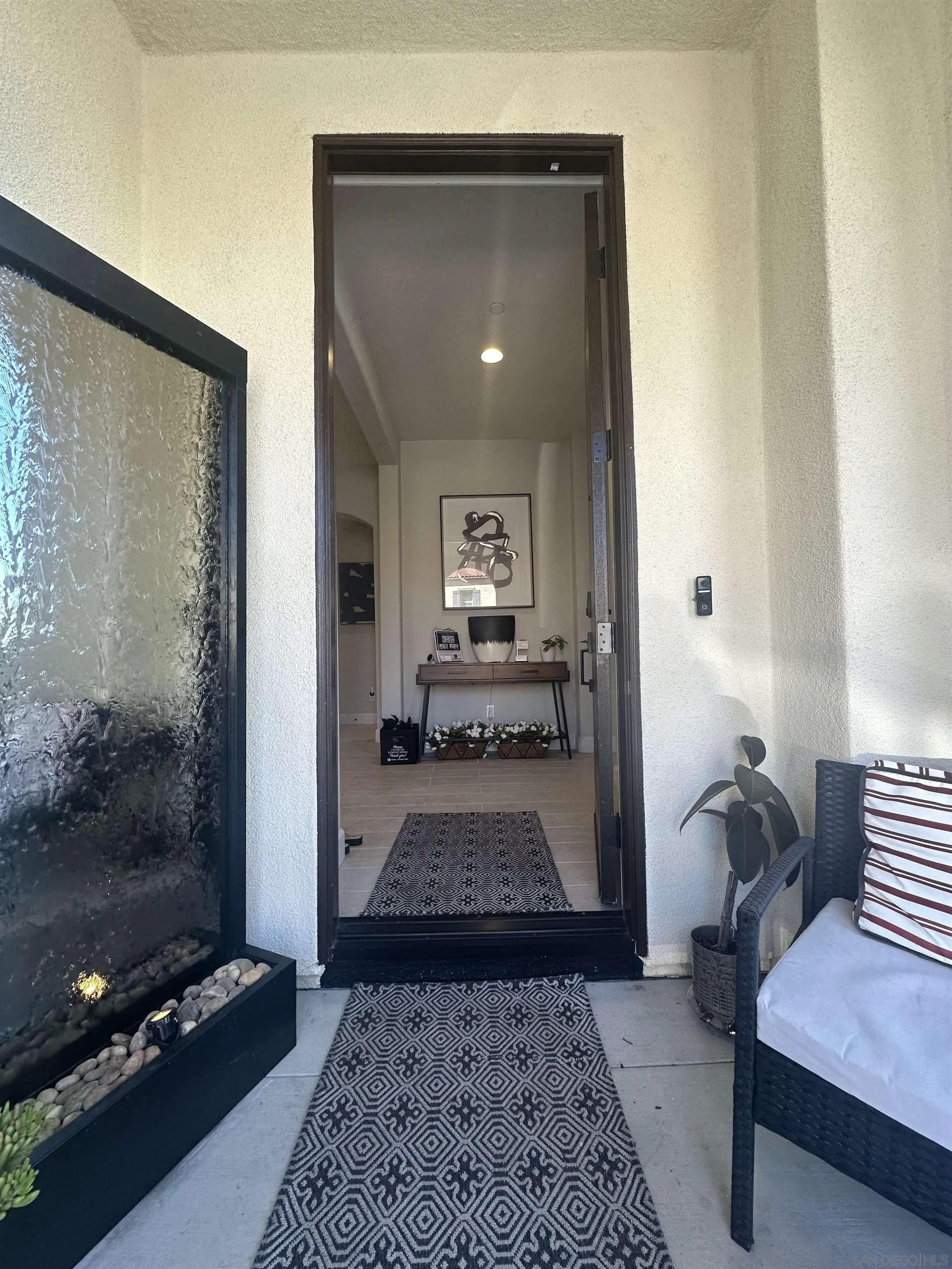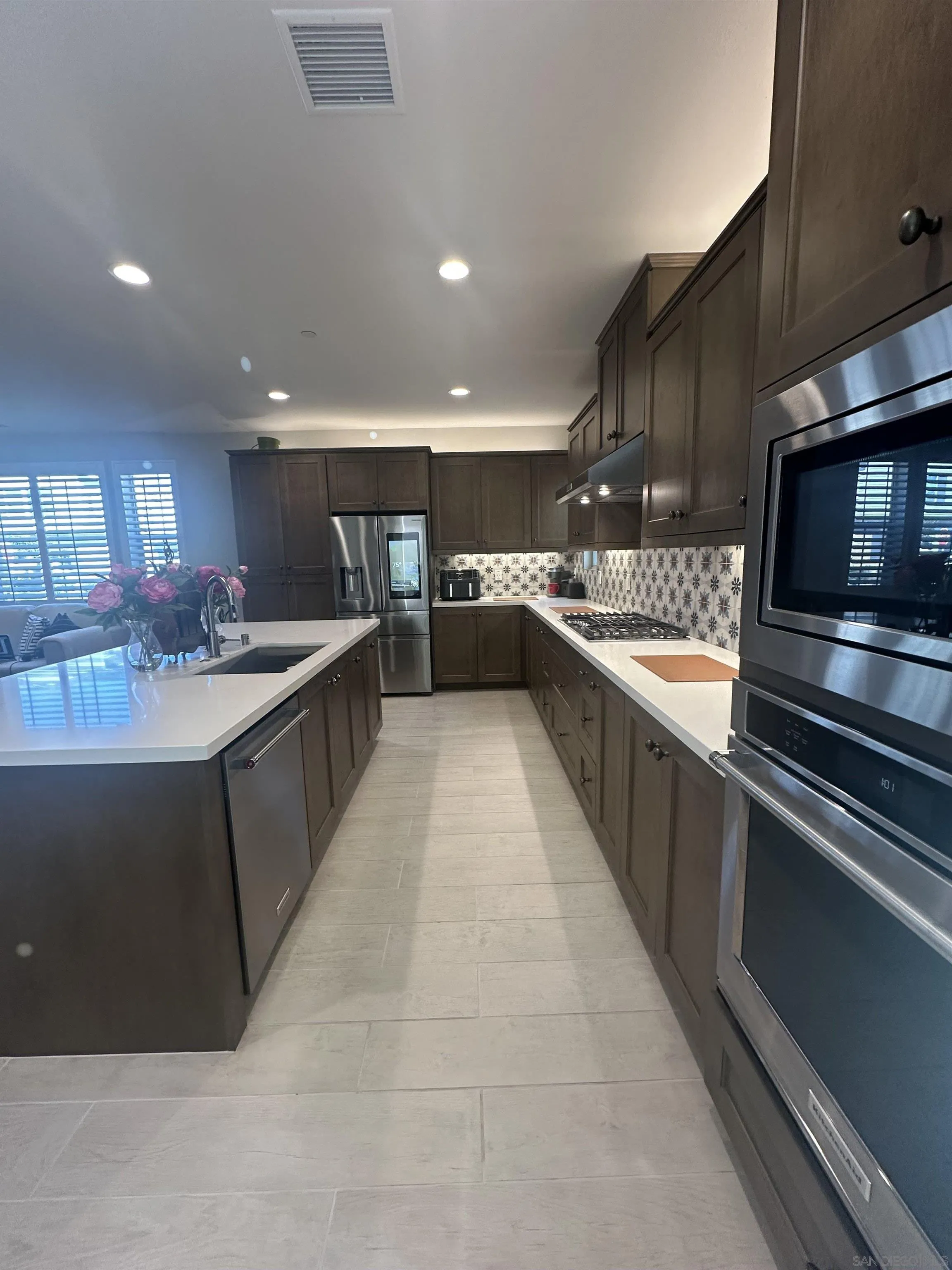 Introducing a rare, modern, upscale residence behind the gates of Vientos at Rancho Tesoro, blending elevated design, comfort, and lifestyle. This highly upgraded, open-concept home features premium finishes, custom paint, upgraded baseboards, and designer ceiling fans. The chef-inspired kitchen features KitchenAid stainless-steel appliances, Caesarstone countertops, a decorative tile backsplash, stained driftwood shaker cabinetry with a pull-out pantry, a 5-burner gas cooktop, a built-in oven/microwave, a commercial-style hood, and custom floating shelves. Porcelain tile flooring, double-padded Berber carpet, Hunter Douglas Hybrid shutters, Provenance woven shades, and insulated walls enhance privacy. Downstairs, a bedroom with a pocket door creates a private en suite with a custom tile shower and a mirrored wardrobe. Paid solar with a backup battery and an epoxy-finished 2-car garage with overhead storage. Enjoy community amenities such as a pool, playground, BBQ area, and a private outdoor lounge with an industrial ceiling fan, perfect for morning coffee, gardening, or relaxing in your jacuzzi. Nearby, highly rated schools, shops, restaurants, grocery stores, fitness studios, and cafés are easily accessible via SR-78 and I-15, connecting to Carlsbad, Encinitas, Escondido, and beyond. Over 50% of the community is open space with 18 miles of trails, making outdoor activities part of daily life.