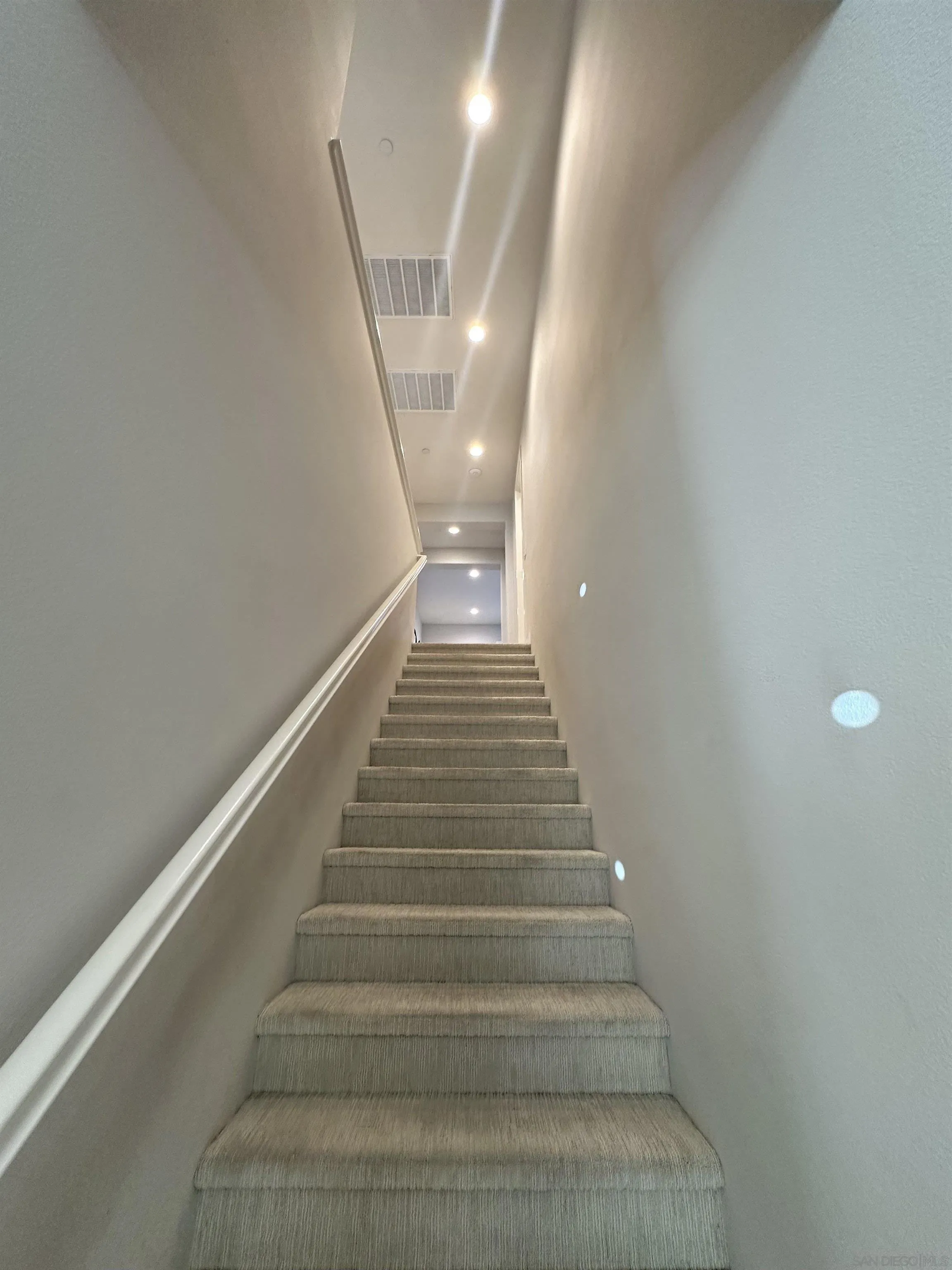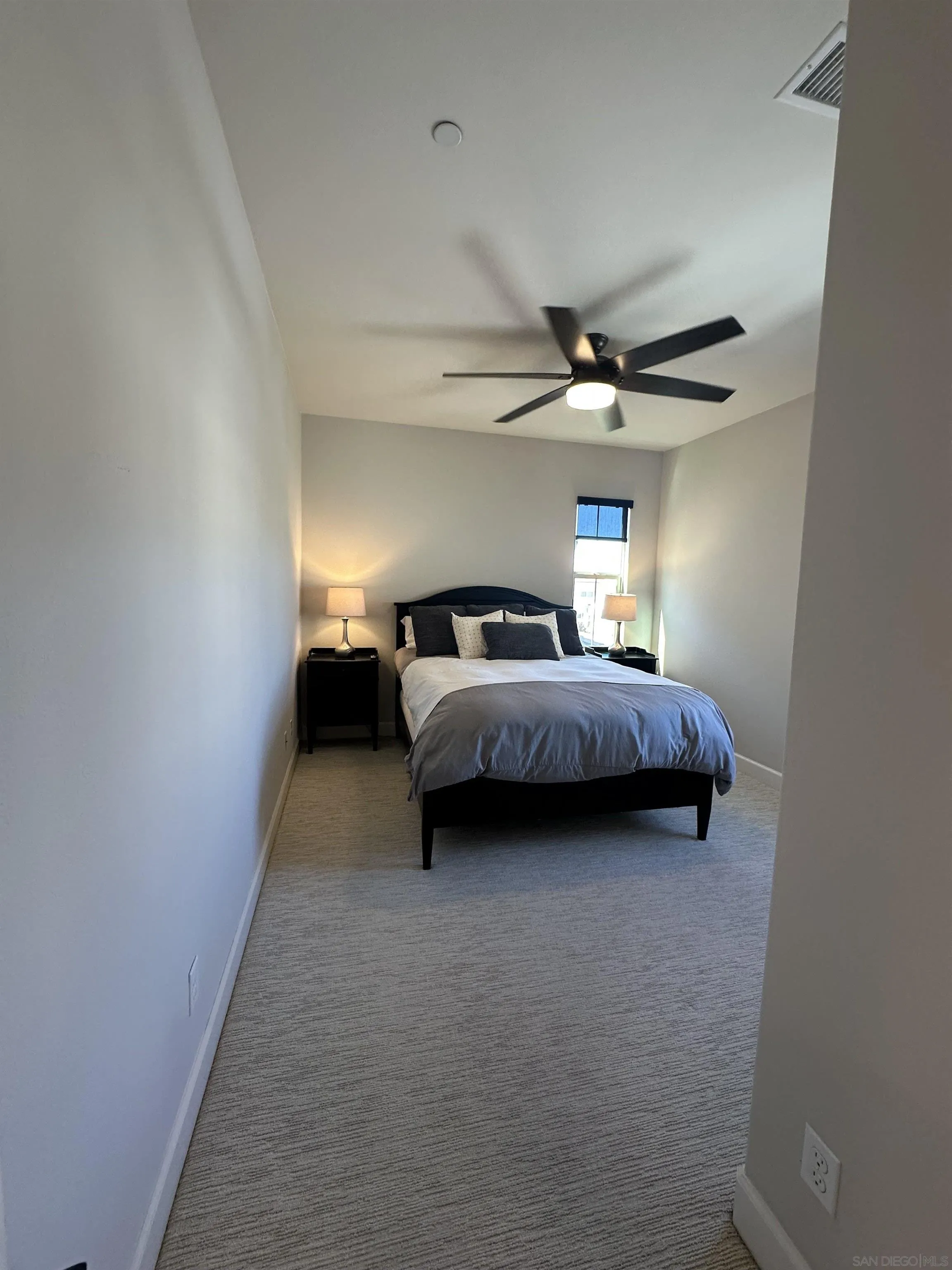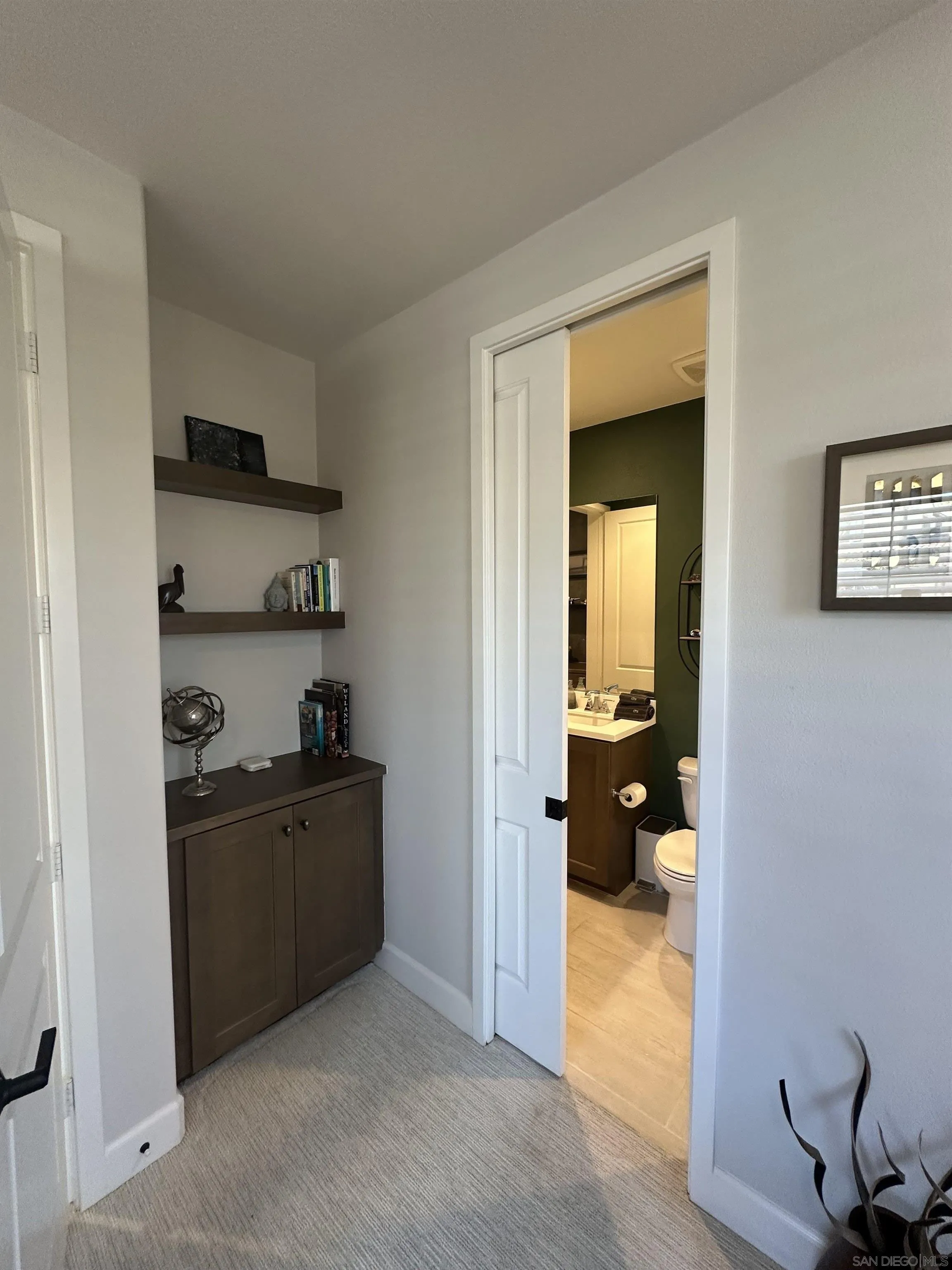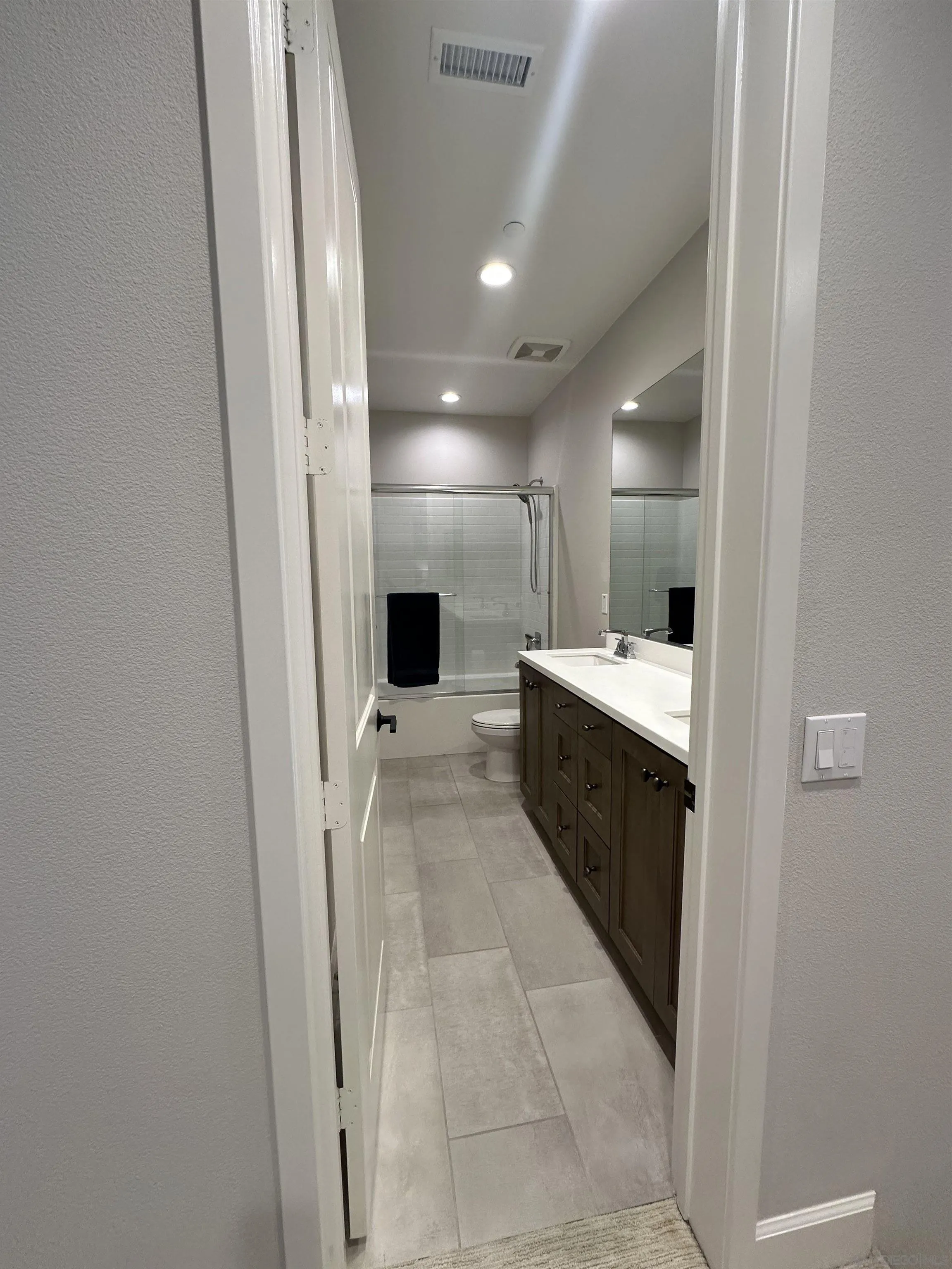 Introducing a rare, modern, upscale residence behind the gates of Vientos at Rancho Tesoro, blending elevated design, comfort, and lifestyle. This highly upgraded, open-concept home features premium finishes, custom paint, upgraded baseboards, and designer ceiling fans. The chef-inspired kitchen features KitchenAid stainless-steel appliances, Caesarstone countertops, a decorative tile backsplash, stained driftwood shaker cabinetry with a pull-out pantry, a 5-burner gas cooktop, a built-in oven/microwave, a commercial-style hood, and custom floating shelves. Porcelain tile flooring, double-padded Berber carpet, Hunter Douglas Hybrid shutters, Provenance woven shades, and insulated walls enhance privacy. Downstairs, a bedroom with a pocket door creates a private en suite with a custom tile shower and a mirrored wardrobe. Paid solar with a backup battery and an epoxy-finished 2-car garage with overhead storage. Enjoy community amenities such as a pool, playground, BBQ area, and a private outdoor lounge with an industrial ceiling fan, perfect for morning coffee, gardening, or relaxing in your jacuzzi. Nearby, highly rated schools, shops, restaurants, grocery stores, fitness studios, and cafés are easily accessible via SR-78 and I-15, connecting to Carlsbad, Encinitas, Escondido, and beyond. Over 50% of the community is open space with 18 miles of trails, making outdoor activities part of daily life.