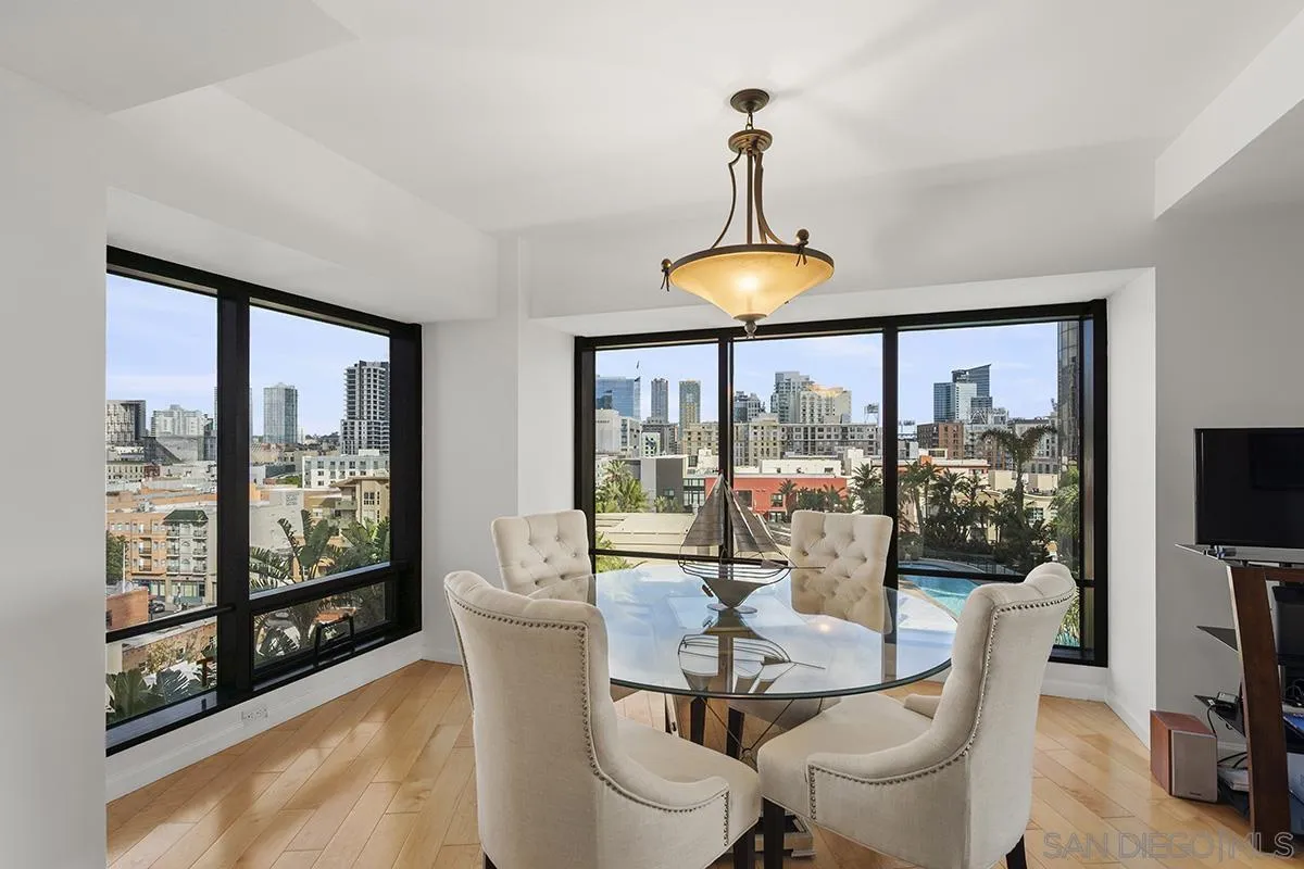 From your private balcony at Harbor Club, one of downtown San Diego's most sought-after addresses, you'll enjoy views of the Convention Center, the city skyline, and the building's lush tropical gardens and pool below. This is the kind of home that draws you in the moment you walk through the door. Sunlight pours through walls of windows, warming the hardwood floors and filling the open living space with an effortless glow. It's the kind of room where a quiet dinner at home feels just as special as a night out. And with the Gaslamp Quarter, the Marina, and Petco Park all just steps away, you'll have plenty of both. The kitchen keeps you part of the conversation while you cook, with clean white surfaces that make everything feel fresh and simple. When the day winds down, the primary suite becomes your own private escape with sliding glass doors open to the balcony, and the en-suite bath with a travertine walk-in shower and deep soaking tub. Living at Harbor Club means having the best of downtown San Diego right at your doorstep, with the feeling of a true retreat waiting for you every time you come home.