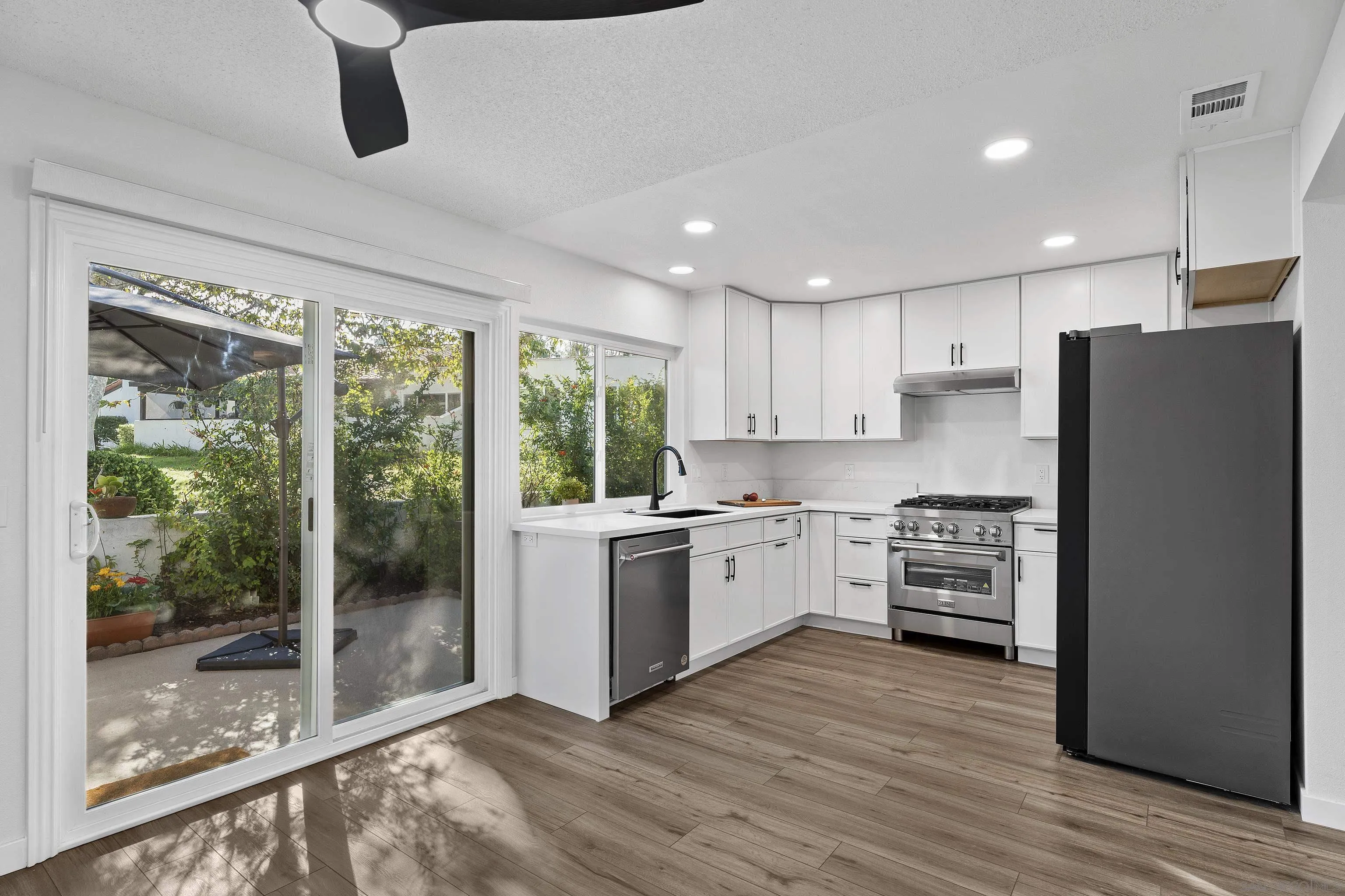 Discover a stunningly remodeled patio home in the vibrant “705 Haciendas” section of Seven Oaks, Rancho Bernardo. Enjoy a tight-knit 55+ community with a top-tier community center offering daily activities. Enter through a private courtyard and a beautifully refinished original front door to freshly painted rooms and clean, sleek ceilings. The modern kitchen features high-end appliances, sleek cabinets, quartz counters, and new recessed lighting. The expansive great room with vaulted ceilings includes a versatile dining area and a spacious living room with an 18-foot sliding patio doors opening to a private back patio with scenic views. Both bedrooms boast new windows and mirrored closet doors, while luxury vinyl plank flooring adds warmth throughout. Two spa-inspired bathrooms, one with an attached laundry room, elevate the experience. Don’t miss your chance to own this gem! ** Free one week accommodations in a Cabo San Lucas resort with successful closing by May 30, 2026 offered as a Seller Concession to help enable a smooth transition to your new home.