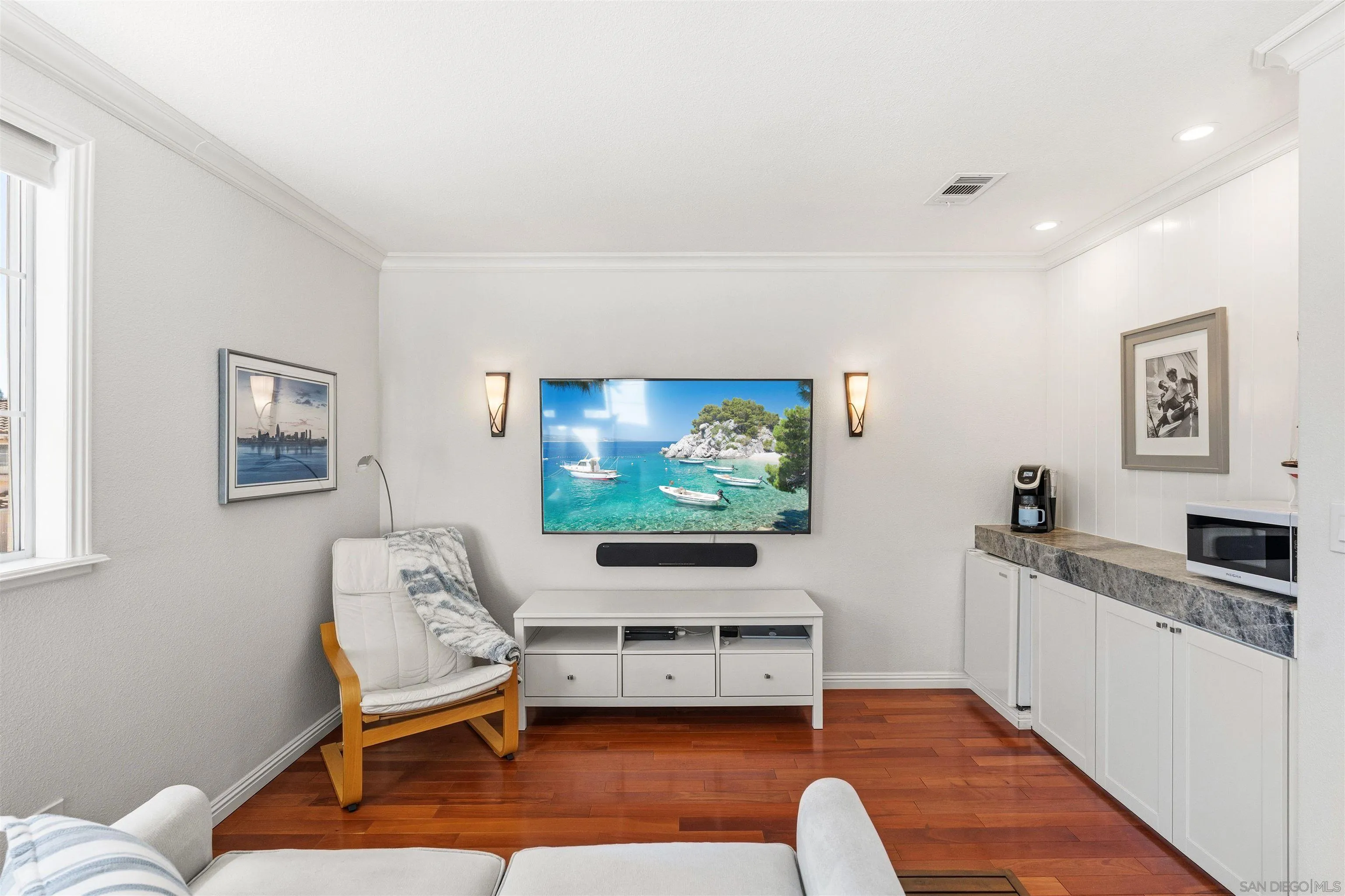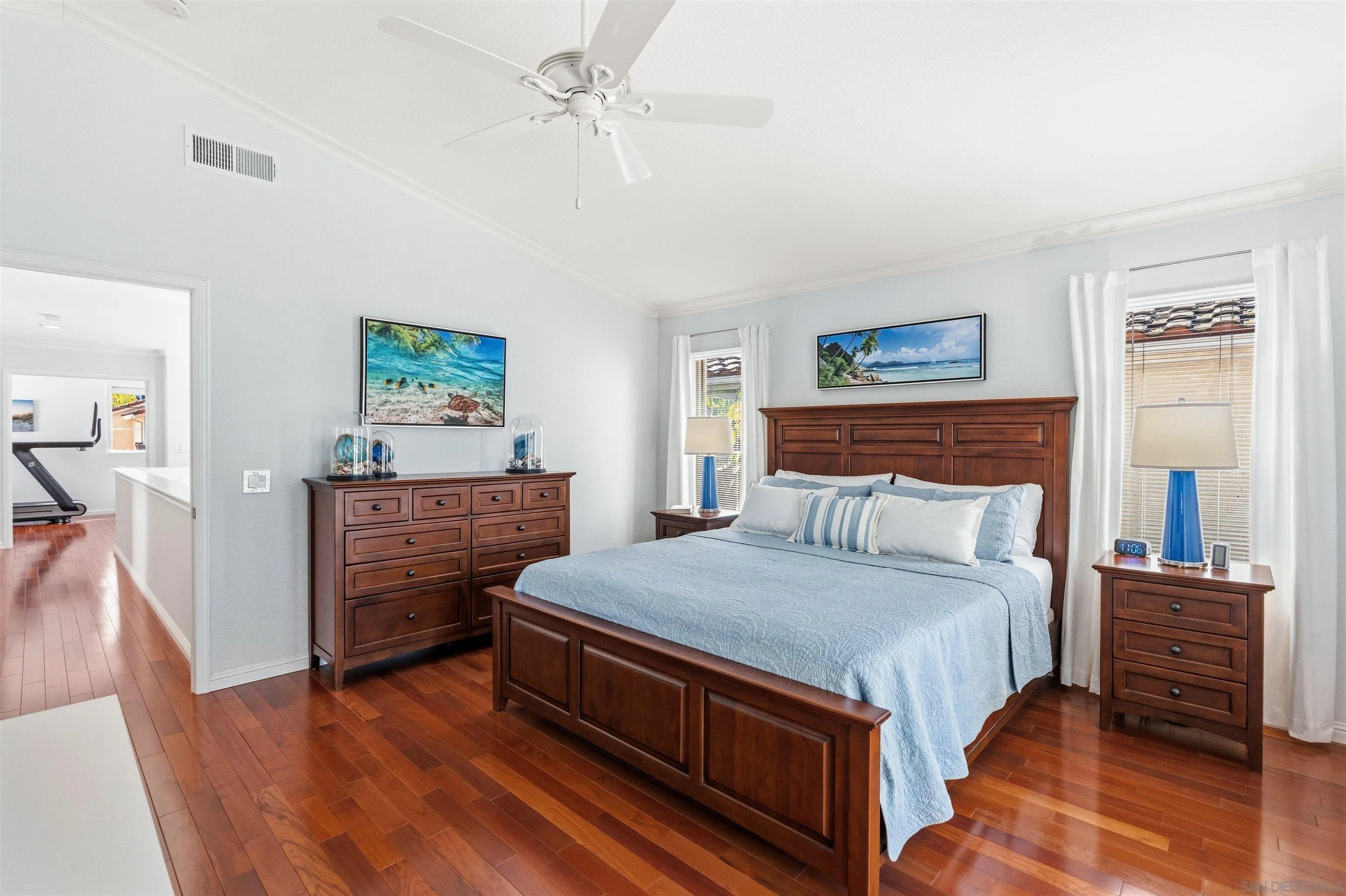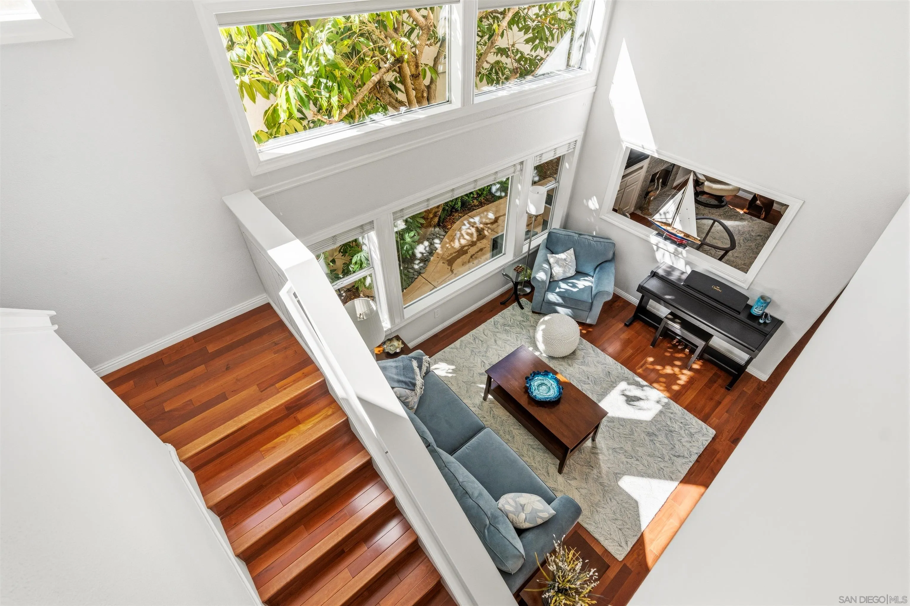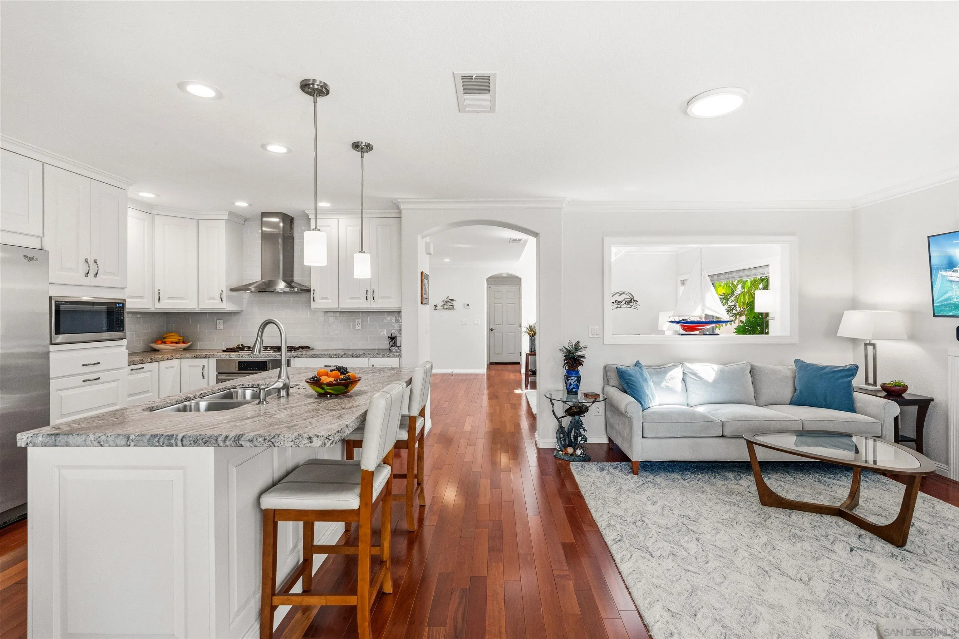 Seller will entertain offers between $1,375,000-$1,425,000. Beautifully renovated Scripps Ranch home backing to a peaceful greenbelt, offering approximately 1,903 sq ft with 3 bedrooms and 2.5 baths. Located in the desirable Huntington community with pool, spa, and ample guest parking, this thoughtfully updated residence also includes a versatile third bedroom above the garage that works perfectly as a guest room, office, or bonus space... Warm and inviting interiors showcase Bolivian Rosewood hardwood floors throughout, crown molding, and new recessed lighting. The remodeled kitchen features new cabinetry, leathered granite countertops, classic subway tile backsplash, and newer appliances, opening comfortably to the main living areas for easy everyday living and entertaining. Anchoring the family room is a granite-faced gas fireplace that can convert to wood burning with a gas starter, adding warmth and character. Upstairs, the main suite offers a relaxing retreat with a private balcony ideal for enjoying beautiful sunset views, along with a walk-in closet with built-ins and a remodeled bath featuring a spa tub. An updated hall bath includes dual sinks, tile flooring, and charming clapboard detailing.