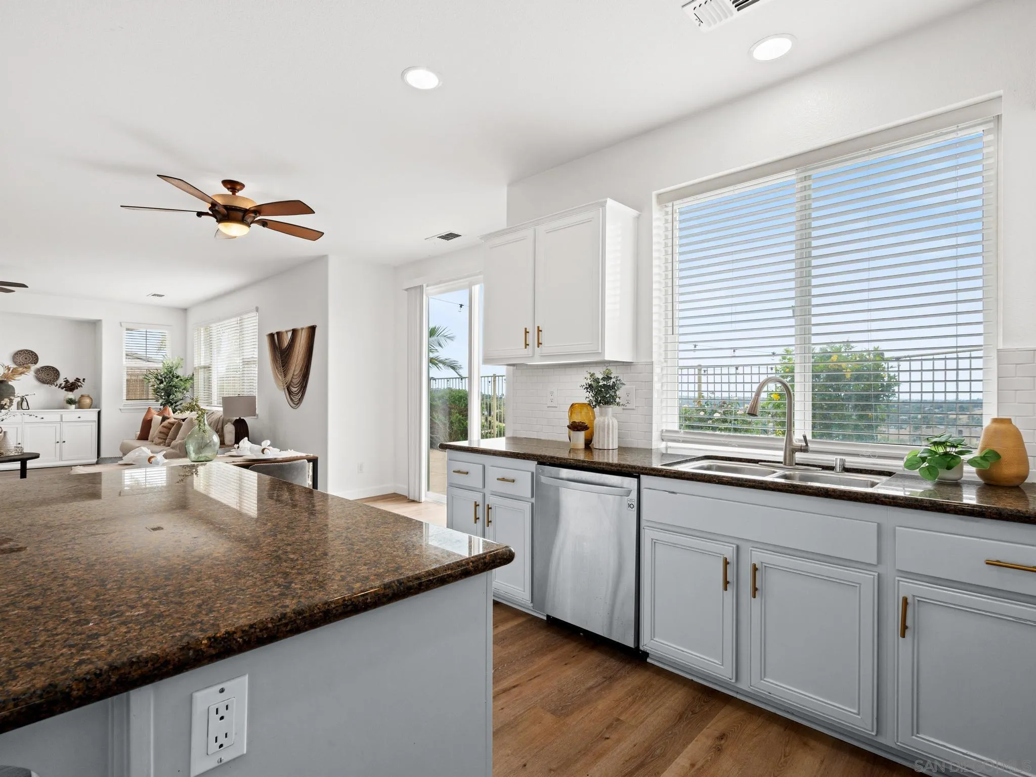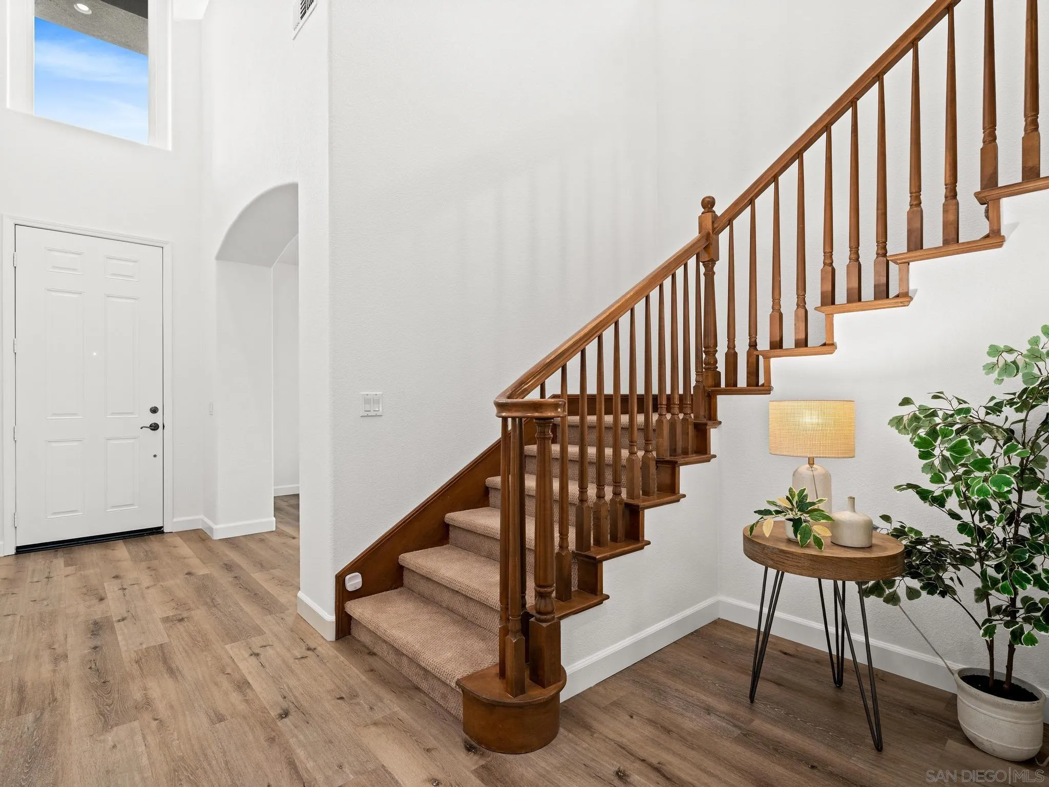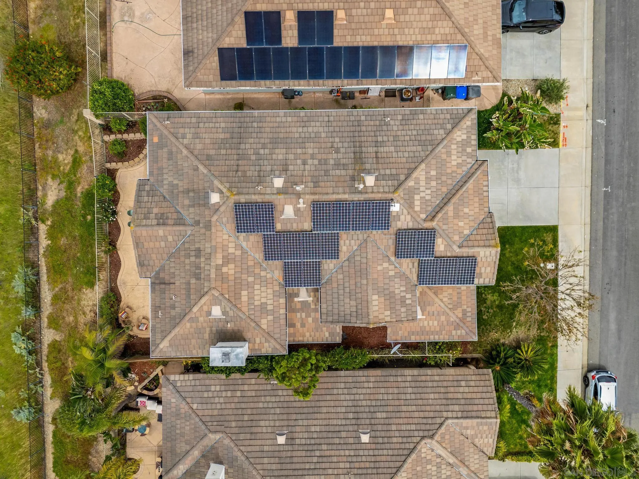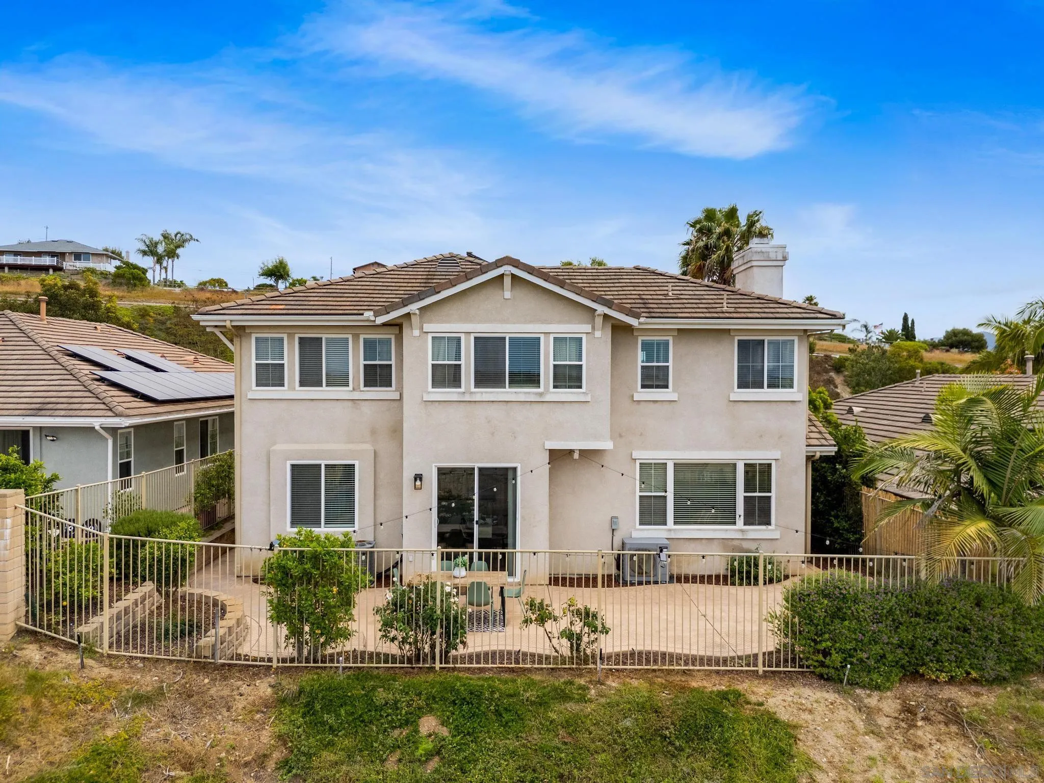 Welcome to this exceptional residence in the highly desirable Santa Fe Hills community of San Marcos, where timeless architecture meets modern comfort and coastal breezes. A grand entry with soaring ceilings sets the tone, complemented by elegant architectural details including graceful arches and expansive living spaces. The versatile downstairs room offers endless possibilities as a guest suite, executive office, or playroom. A formal dining room flows seamlessly into a spacious open-concept great room, ideal for both everyday living and entertaining. The gourmet kitchen is designed for the culinary enthusiast, featuring abundant counter space, a generous center island, and a walk-in pantry, perfectly positioned to overlook the main living area. Upstairs, the oversized primary suite is a true retreat, offering a private sitting area, space for a home office, a large walk-in closet, dual vanities, and a luxurious soaking tub.Three additional generously sized bedrooms share a beautifully remodeled bath, while a spacious upper-level landing provides added flexibility and abundant storage. Additional upgrades include newer HVAC and fully paid solar for enhanced efficiency. Enjoy serene views stretching toward the ocean, accompanied by refreshing coastal breezes—an ideal blend of comfort, style, and Southern California living.