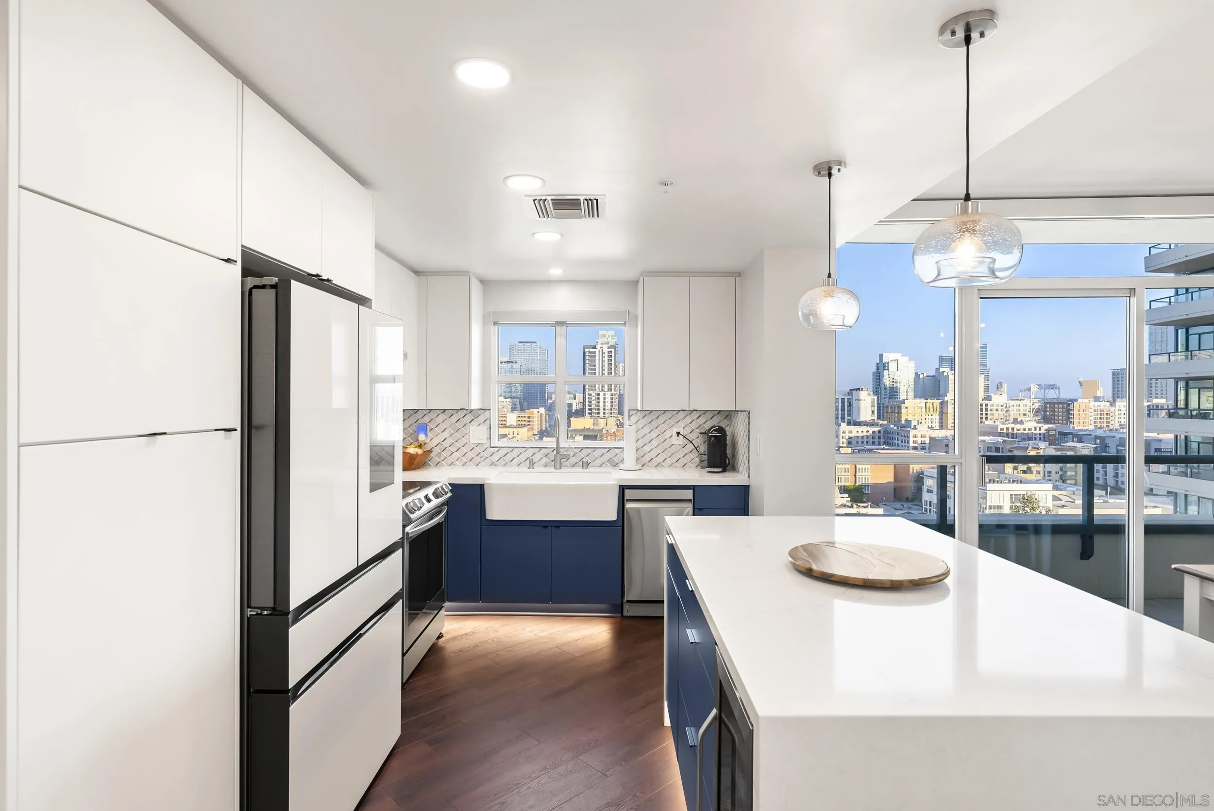 Panoramic Bay, Ocean, and City views take center stage in this beautifully remodeled Marina District residence. This spacious 2-bedroom, 2-bath home features two private view patios perfectly positioned for stunning water vistas and seamless indoor-outdoor living. Over $200,000 in upgrades (2023) include custom cabinetry, continuous flooring, and updated lighting and plumbing. The designer kitchen offers quartz countertops, stylish tile, a generous pantry, and high-end smart appliances. Additional highlights include a custom walk-in closet, fireplace, blackout shades, and two secured parking spaces with EV chargers. A rare, turnkey, view-focused opportunity in the heart of the Marina District.