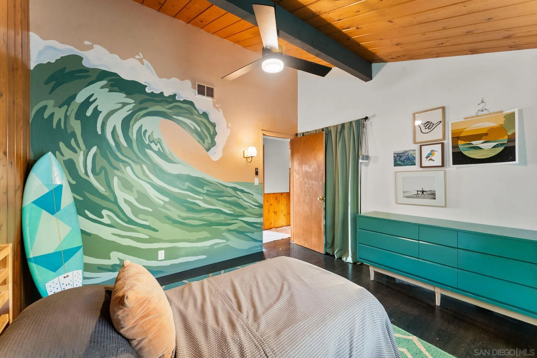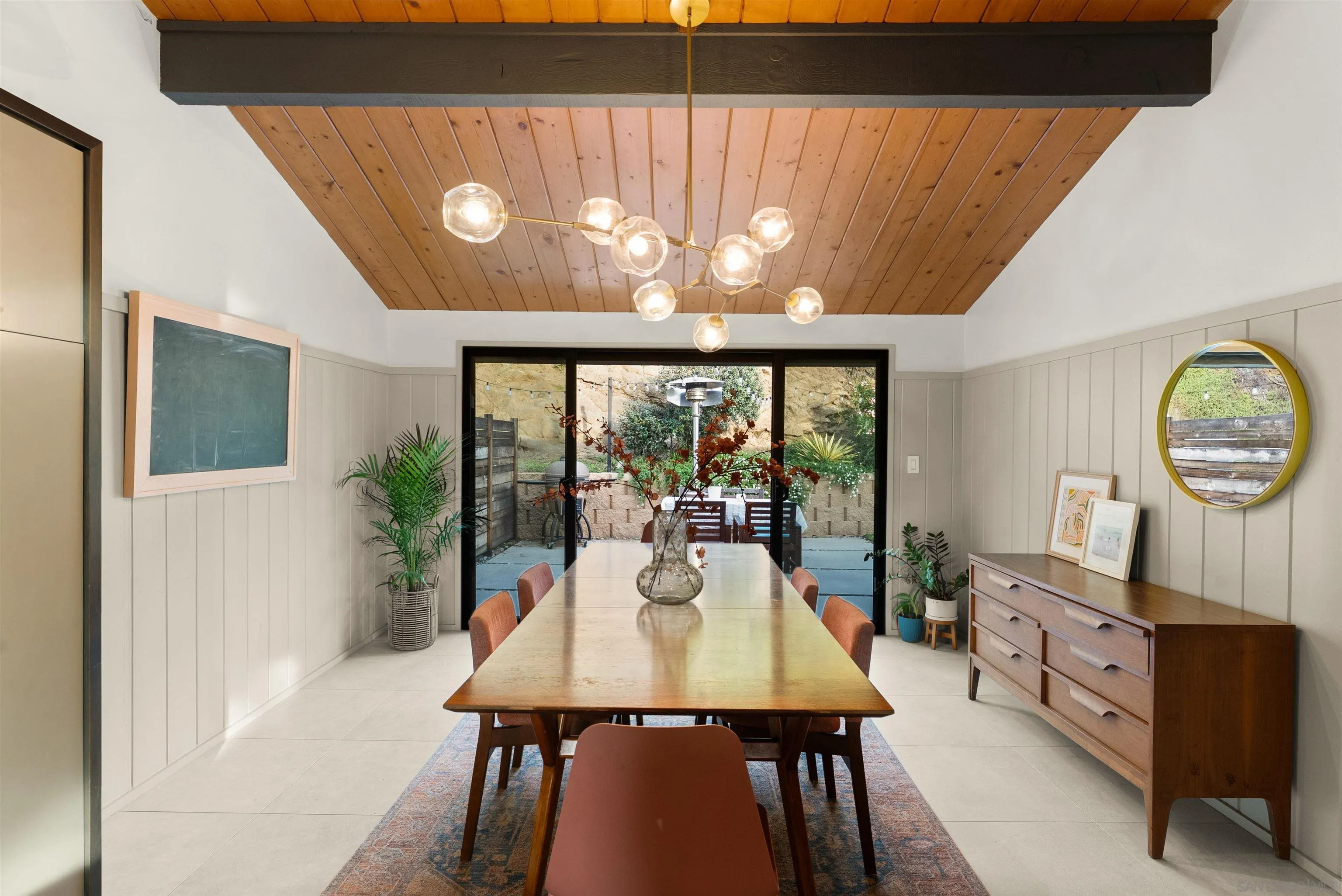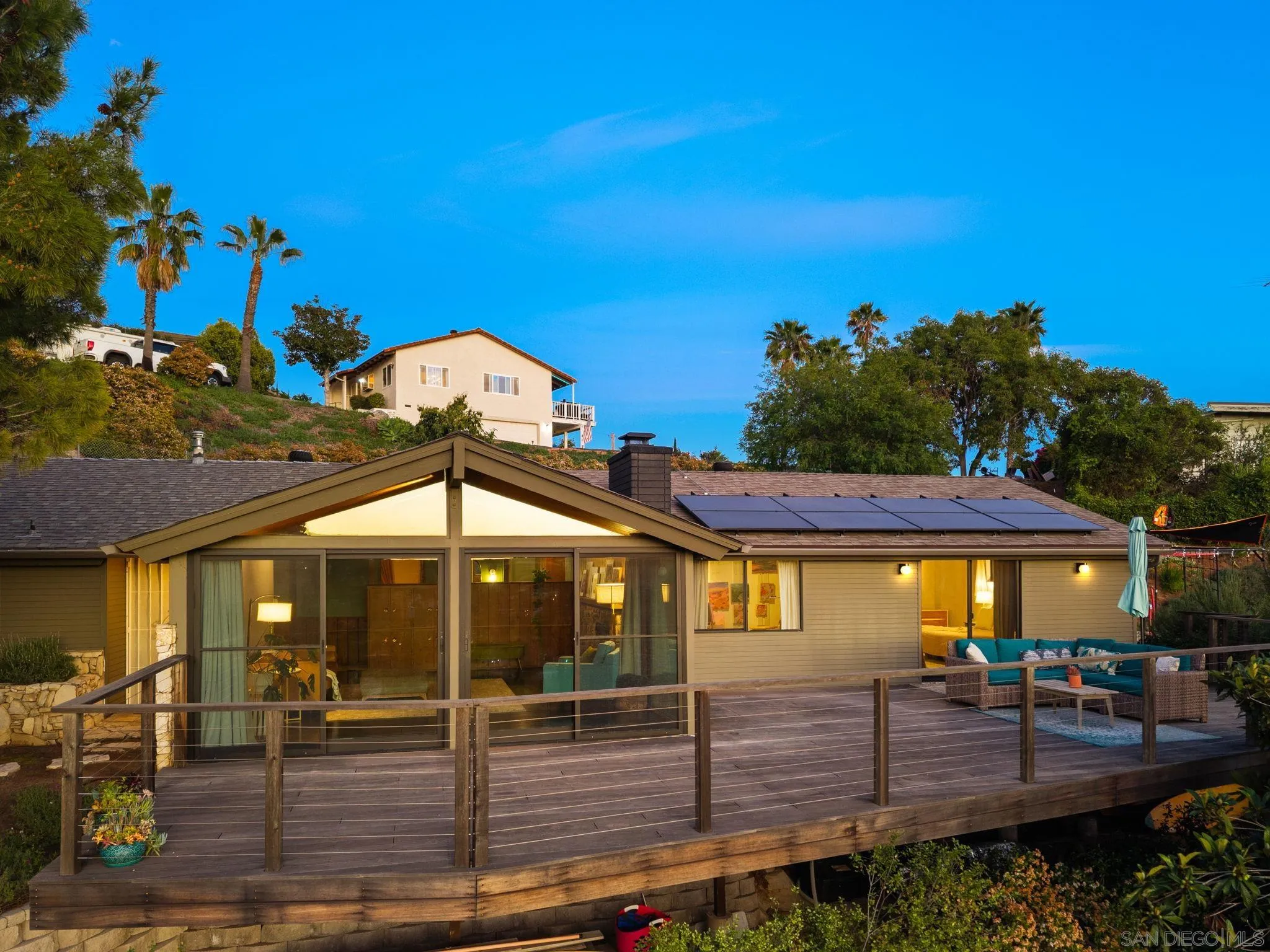 Mid-century modern hillside retreat with panoramic sunset and valley views. Extensively remodeled, this home blends timeless design with modern upgrades and seamless indoor-outdoor living. Vaulted wood plank ceilings and expansive glass bring in abundant natural light, while the living room’s stone fireplace opens to a wraparound deck—perfect for entertaining or enjoying San Diego sunsets. Designer kitchen with custom cabinetry, matte quartz countertops, brass hardware, statement backsplash, and premium KitchenAid appliances, including a concealed panel dishwasher. The primary suite features vaulted ceilings, engineered wood flooring, and direct deck access. Spacious bonus/flex room ideal for office, guests, or studio. Exterior highlights include Hardie siding, Milgard windows and doors, leased solar, drought-tolerant landscaping, fruit trees, and multiple outdoor living areas. Privately set in a natural setting yet just minutes from city amenities.