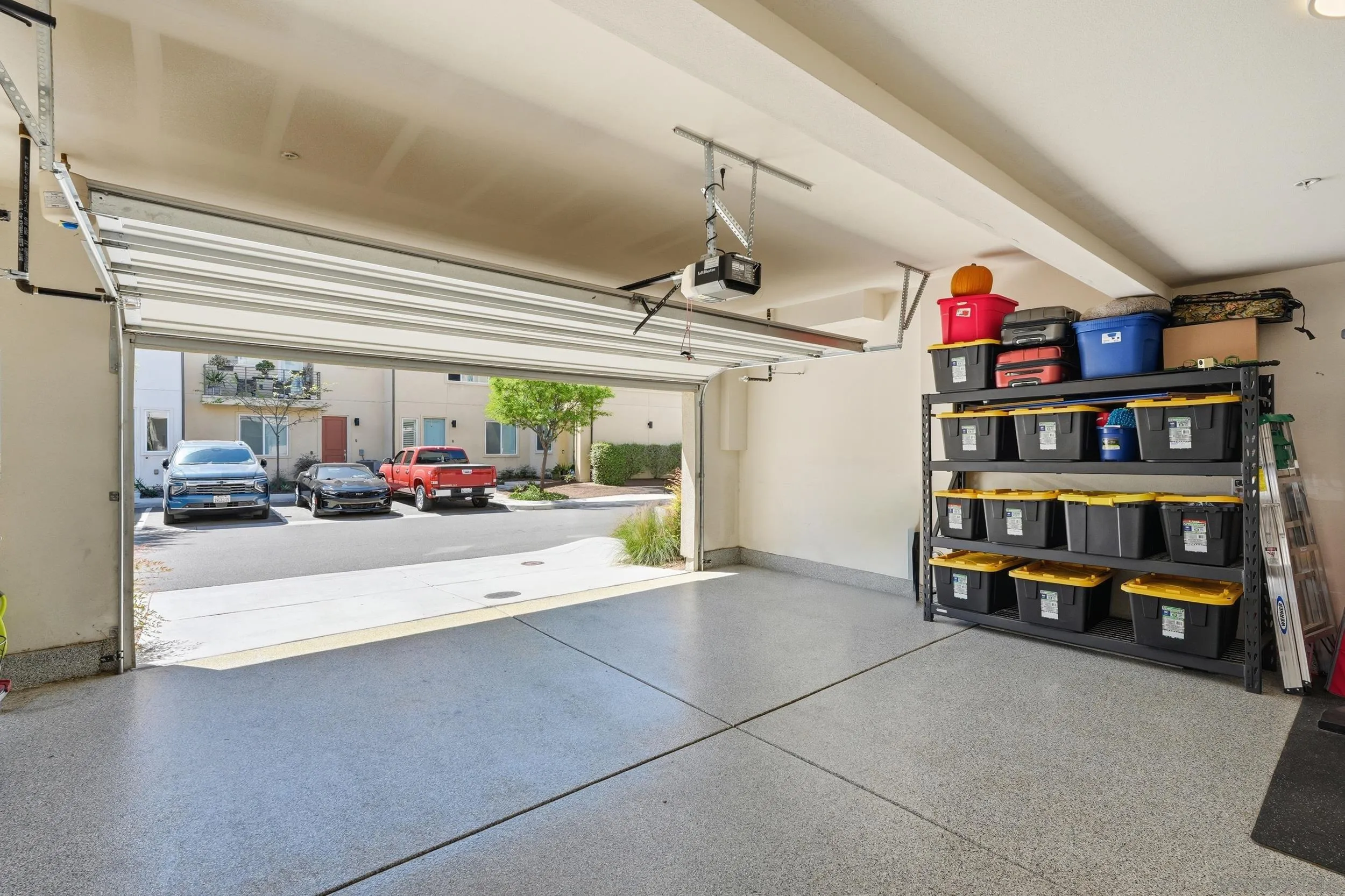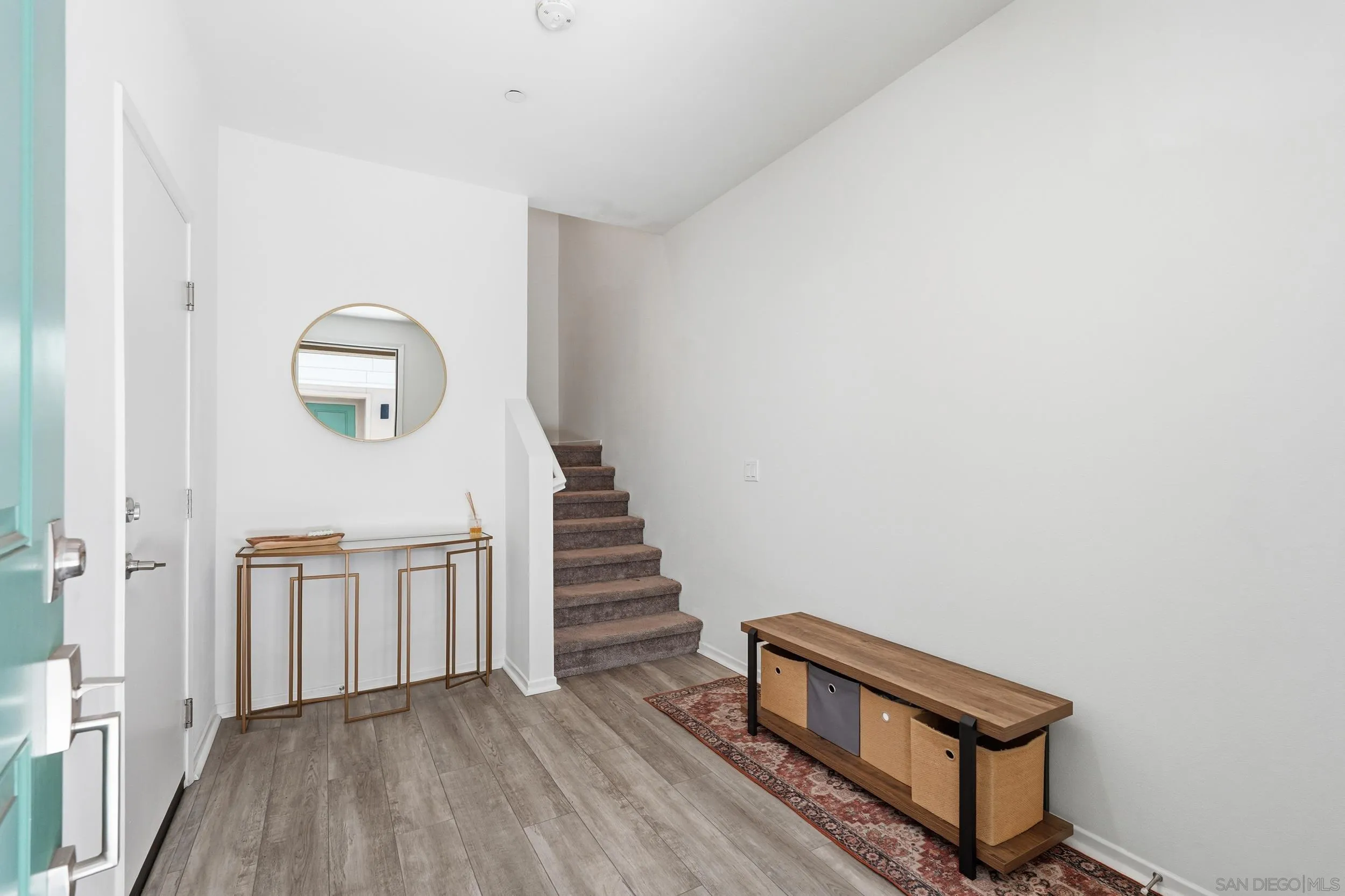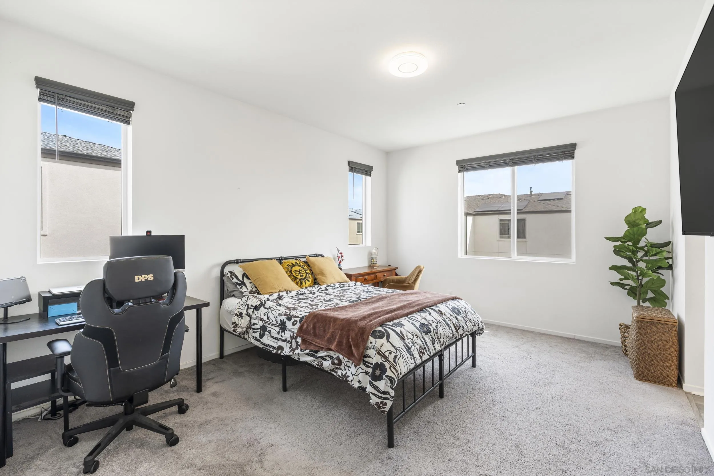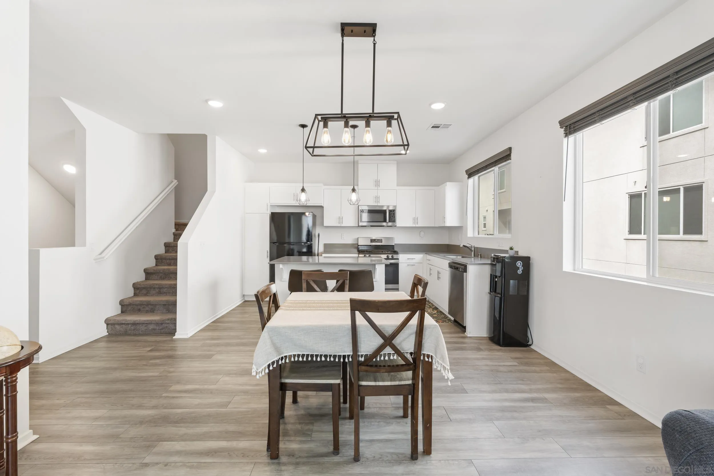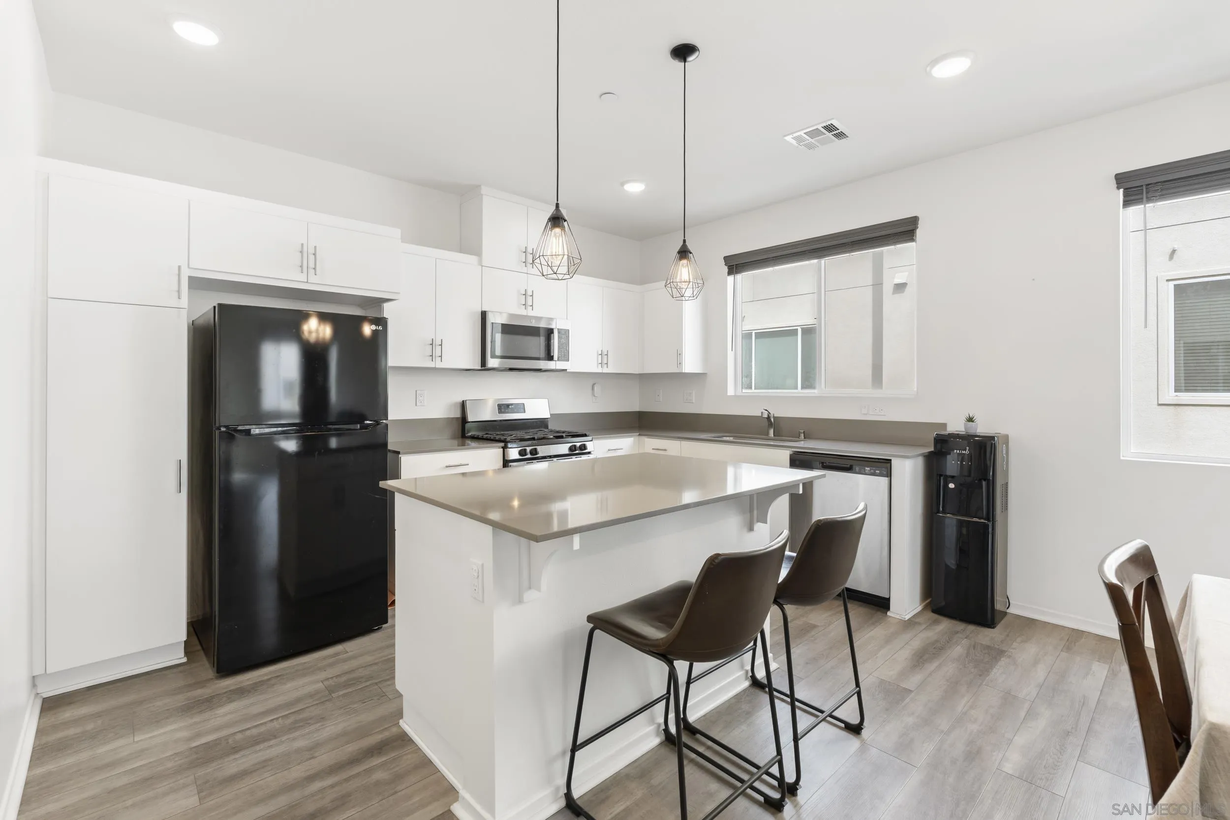Step into this bright, beautifully updated 1,321 sq ft townhome and feel instantly at home. Featuring an open-concept design, high ceilings, and abundant natural light, this modern three-story condo offers the perfect blend of style and everyday comfort. The spacious living room flows seamlessly into the dining area and open kitchen. Built in 2021, the home has a clean, contemporary feel throughout. The kitchen is equipped with stainless-steel appliances—including a gas range and built-in microwave—along with a generous pantry and a large breakfast bar, making meal prep easy and enjoyable. A sliding glass door opens to your private balcony, perfect for relaxing with a view of the community grounds. Upstairs, you’ll find two generously sized bedrooms, each with its own bathroom, plus a full-size stacked washer and dryer for convenience. Additional highlights include an attached two-car garage with built-in storage shelving and epoxy flooring, fresh neutral paint, wood-look flooring throughout, and contemporary lighting. The home is move-in ready with recent updates and low-maintenance living. Located in a highly convenient spot, you’re just minutes from the 905 and 805 freeways, making commuting effortless.