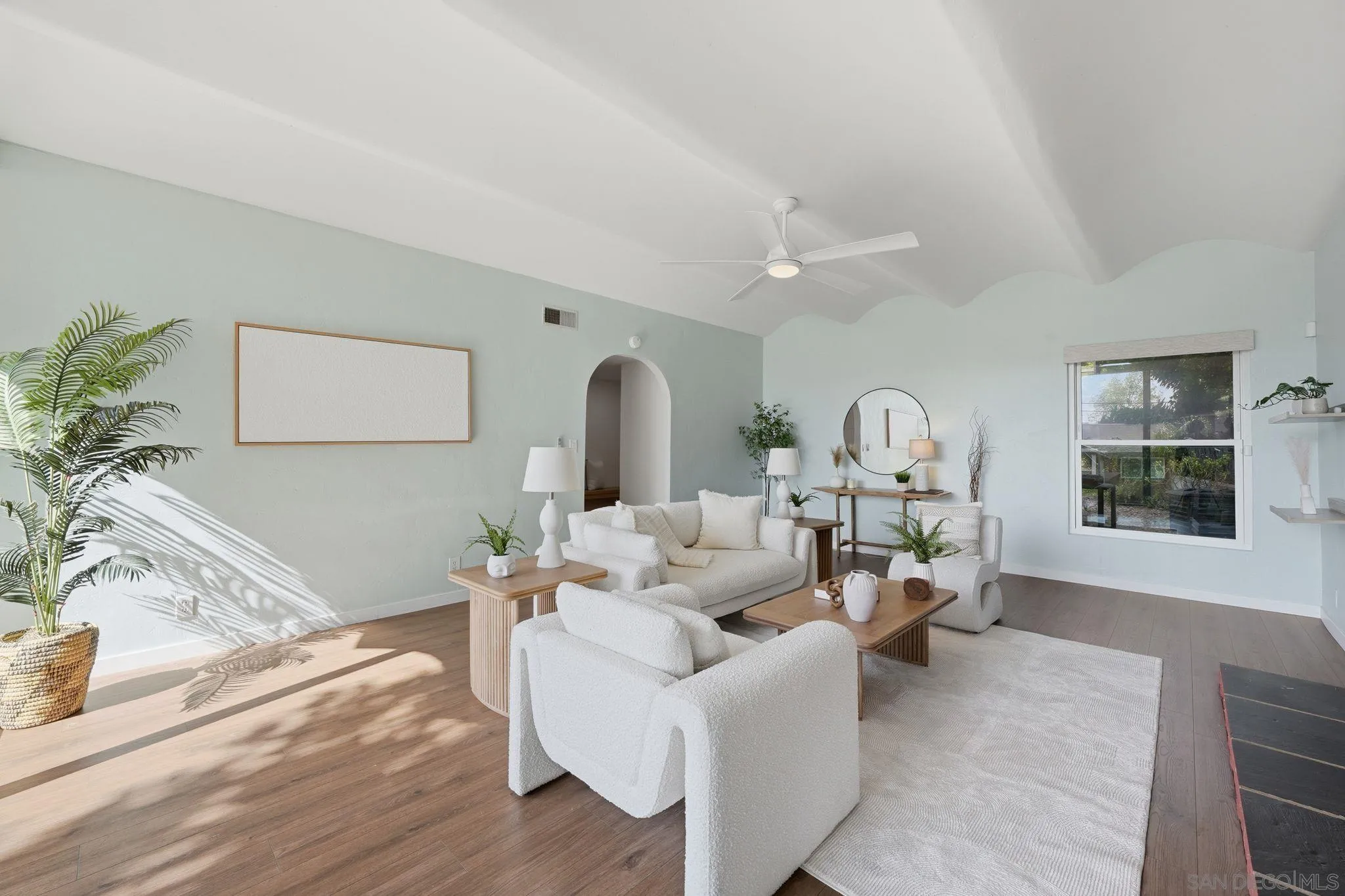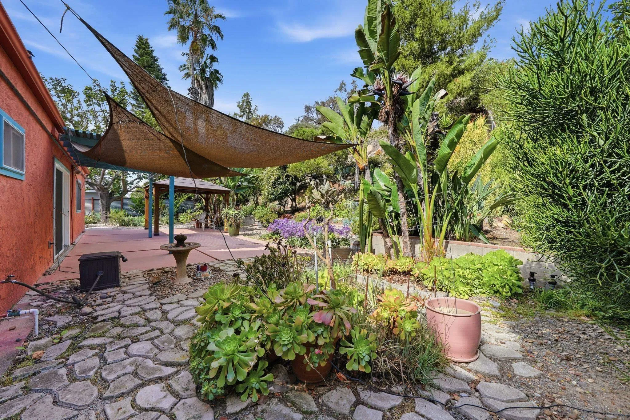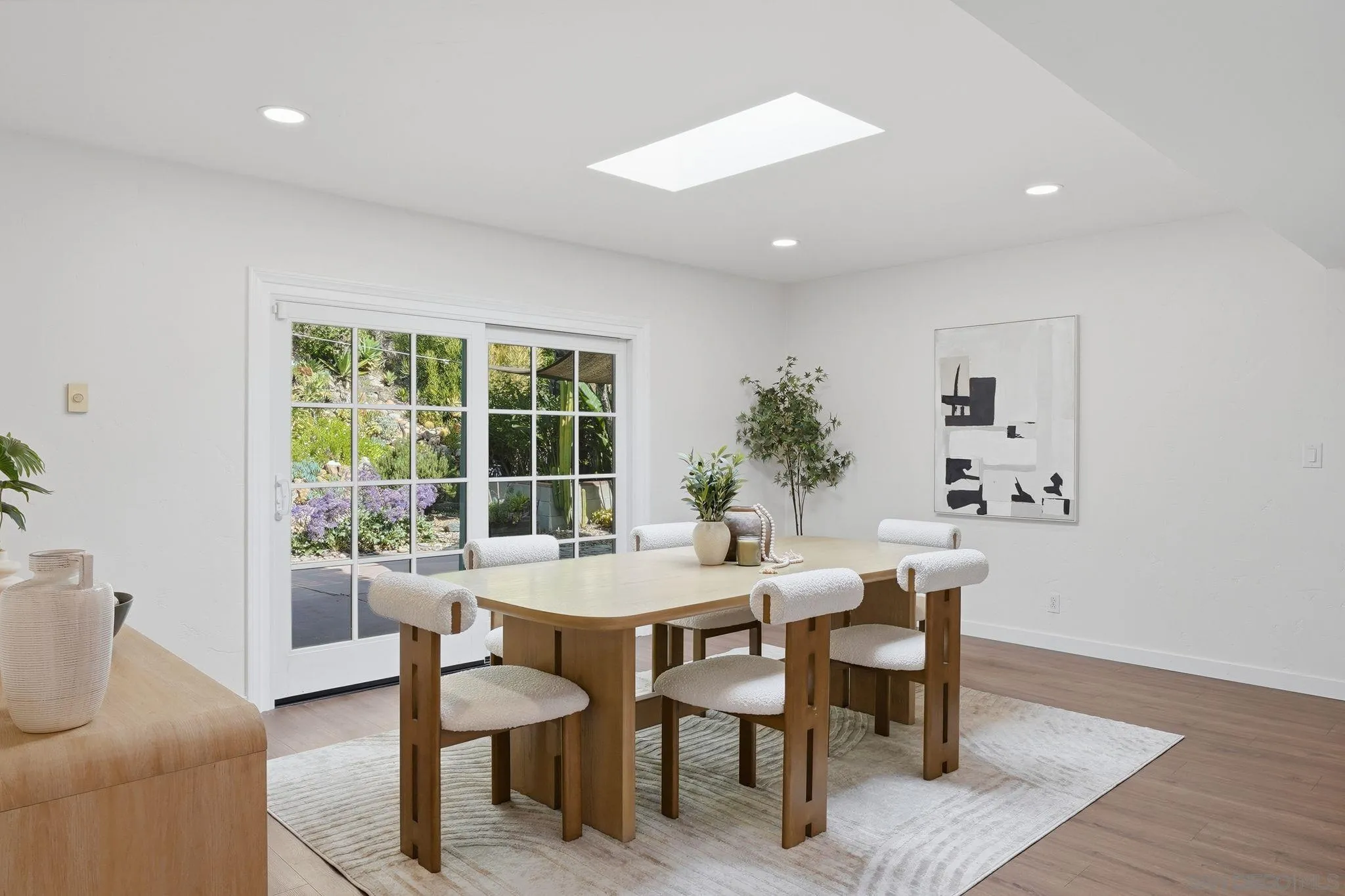 This beautifully upgraded residence showcases refined modern living with designer finishes and premium enhancements throughout. The expansive living room is a true statement space, highlighted by distinctive conclave ceilings and an abundance of natural light pouring through floor-to-ceiling windows. The open-concept kitchen seamlessly connects to a spacious dining area, creating an ideal setting for elevated entertaining. No detail has been overlooked, with recent upgrades including a new back sliding door, sophisticated recessed lighting throughout the main living areas, ceiling fans in every bedroom and the living room, and custom blinds and drapery adorning every window. The home features fresh interior paint and all-new flooring, complemented by a new roof and energy-efficient solar system with Tesla Powerwall 2. Additional enhancements include 2 new skylights, thoughtfully installed shelving in the kitchen and living room, flat-screen TV mounts in the primary bedroom, living room, and kitchen, as well as a new stove and designer kitchen faucet—delivering both style and functionality in every space. A private outdoor retreat designed for year-round enjoyment, featuring a beautifully crafted wood pavilion with a covered roof and ceiling fan—perfect for relaxing or entertaining in comfort. The yard is further complimented with stylish shade sails, while lush, mature landscaping and greenery create a tranquil, resort-like ambiance with ample space for outdoor living and gatherings.