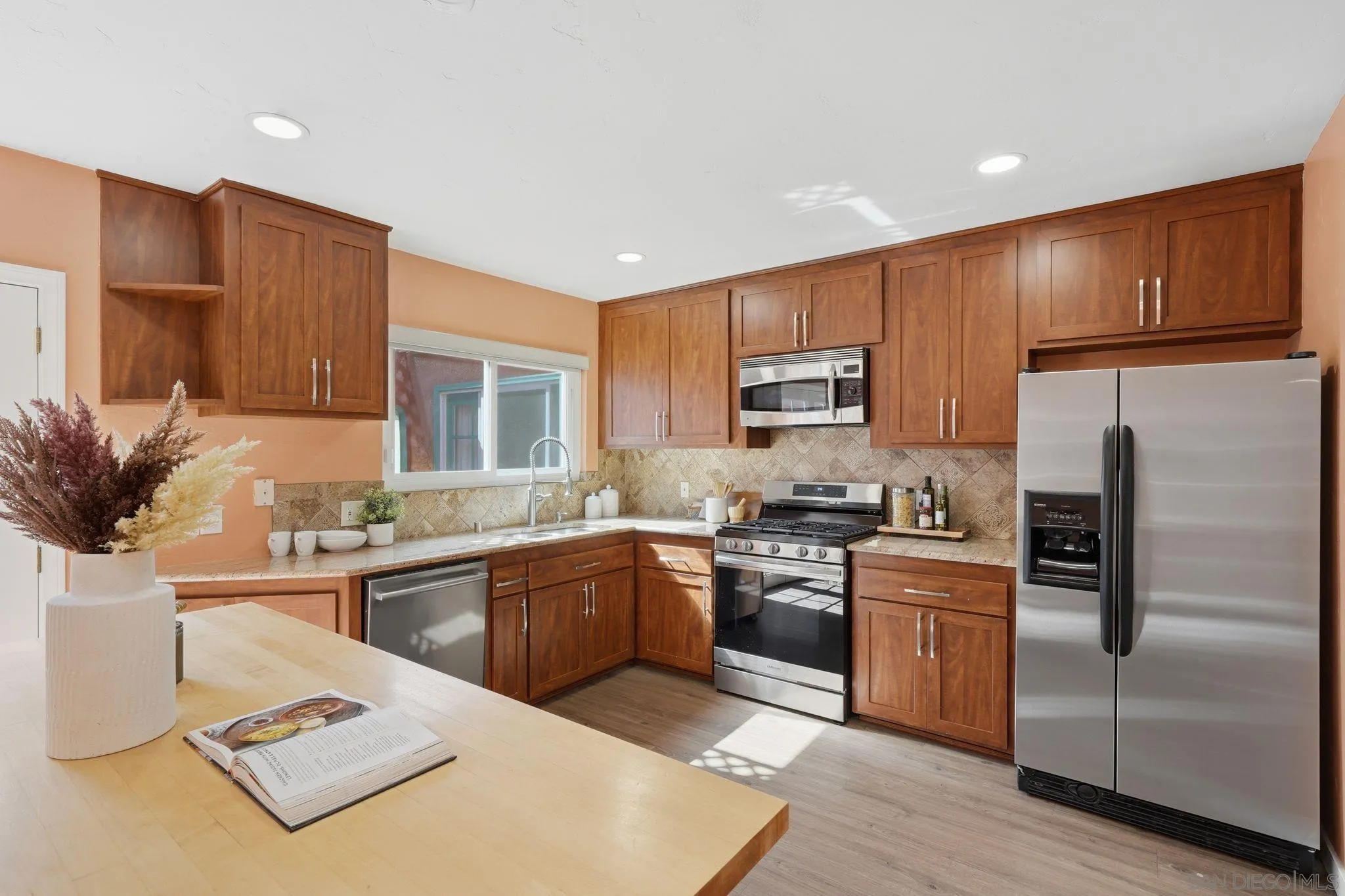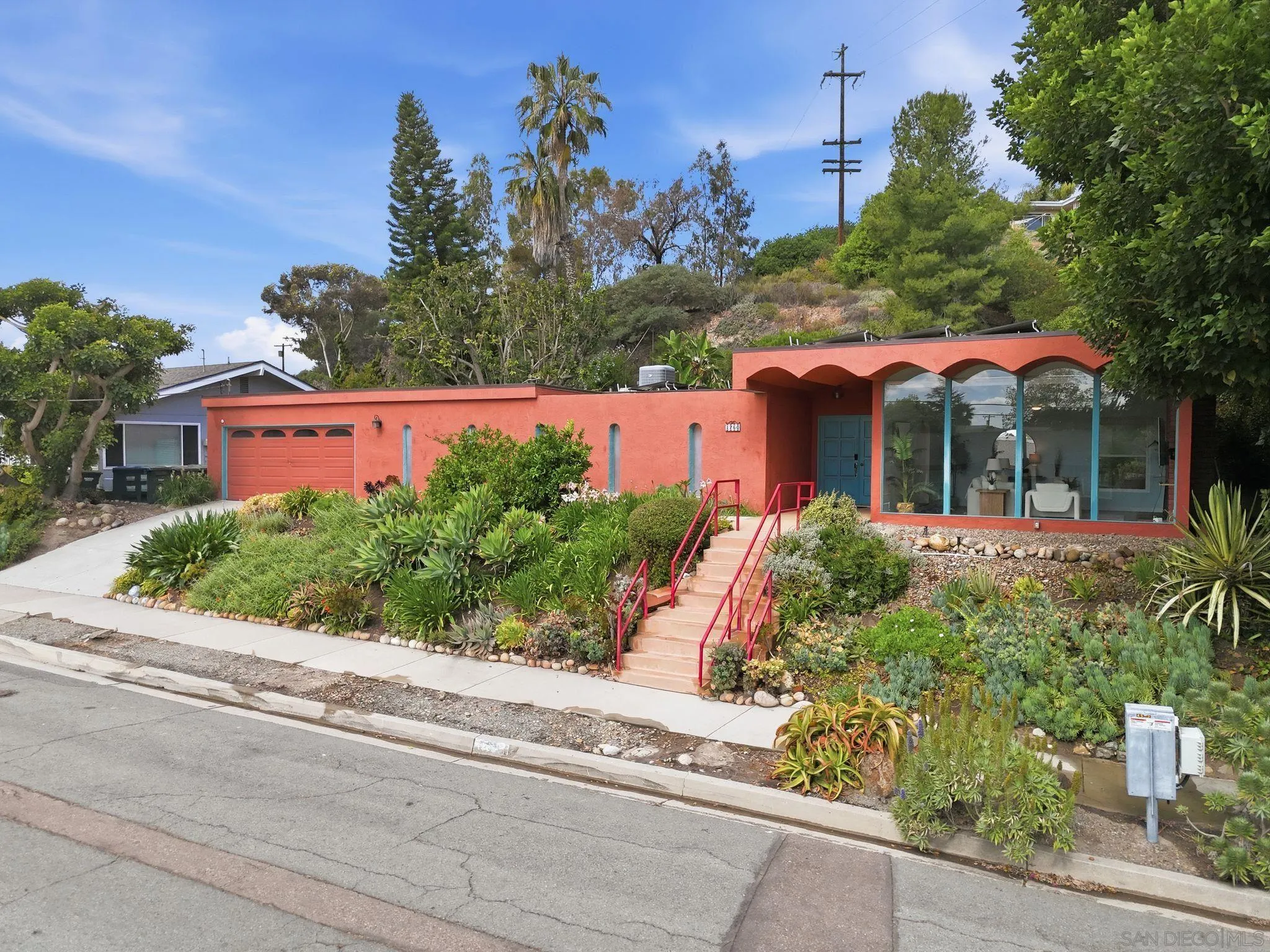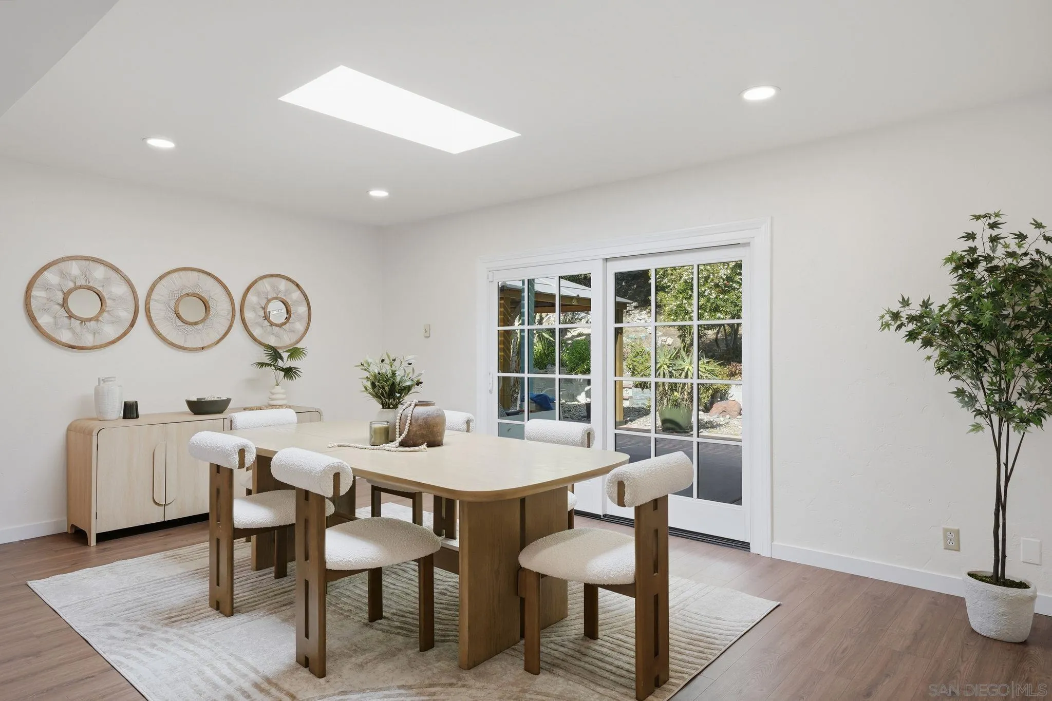This beautifully upgraded residence showcases refined modern living with designer finishes and premium enhancements throughout. The expansive living room is a true statement space, highlighted by distinctive conclave ceilings and an abundance of natural light pouring through floor-to-ceiling windows. The open-concept kitchen seamlessly connects to a spacious dining area, creating an ideal setting for elevated entertaining. No detail has been overlooked, with recent upgrades including a new back sliding door, sophisticated recessed lighting throughout the main living areas, ceiling fans in every bedroom and the living room, and custom blinds and drapery adorning every window. The home features fresh interior paint and all-new flooring, complemented by a new roof and energy-efficient solar system with Tesla Powerwall 2. Additional enhancements include 2 new skylights, thoughtfully installed shelving in the kitchen and living room, flat-screen TV mounts in the primary bedroom, living room, and kitchen, as well as a new stove and designer kitchen faucet—delivering both style and functionality in every space. A private outdoor retreat designed for year-round enjoyment, featuring a beautifully crafted wood pavilion with a covered roof and ceiling fan—perfect for relaxing or entertaining in comfort. The yard is further complimented with stylish shade sails, while lush, mature landscaping and greenery create a tranquil, resort-like ambiance with ample space for outdoor living and gatherings.