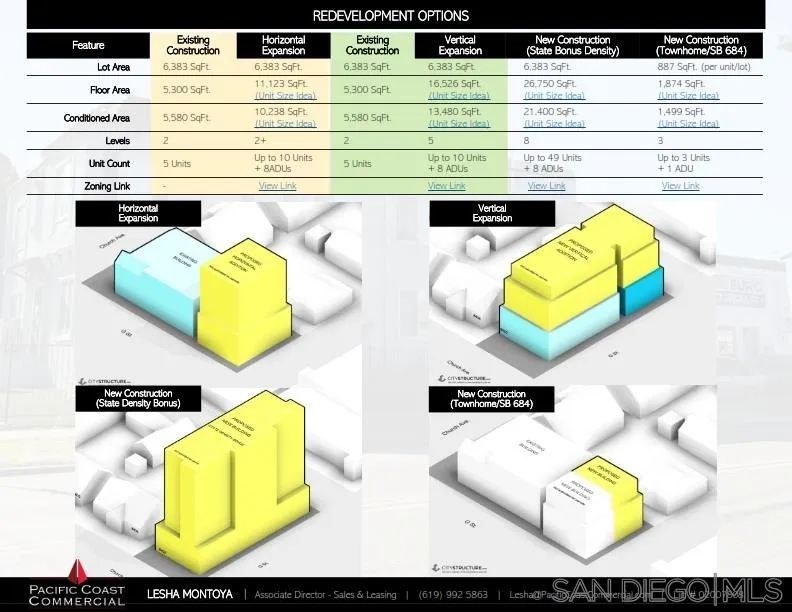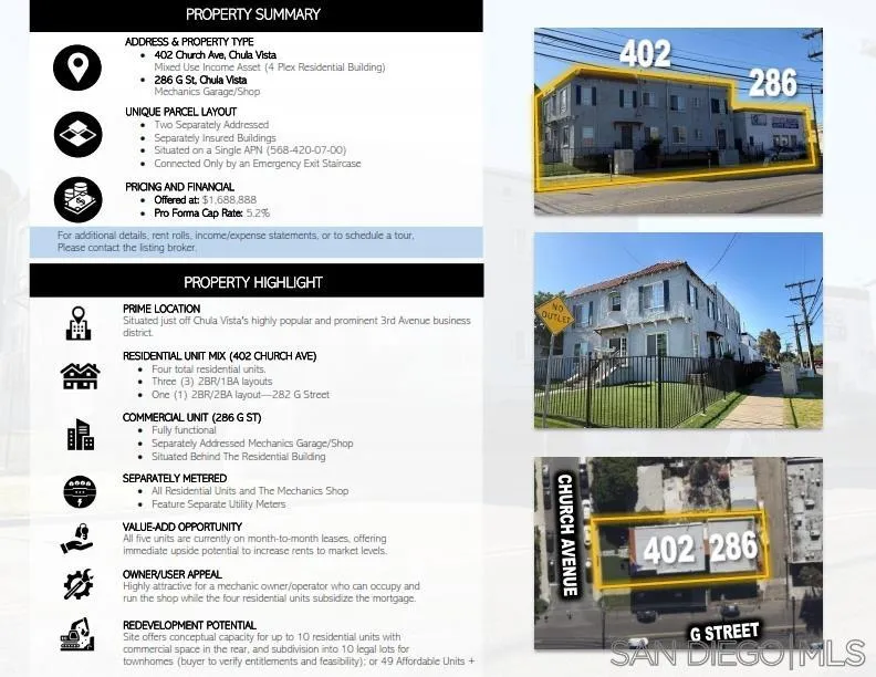 PRIME MIXED-USE REDEVELOPMENT PROPERTY!! Multiple redevelopment scenarios may be possible from 49 AFFORDABLE UNITS + 8 ADU's; OR 10 Lots/INDIVIDUAL TOWNHOMES; OR 10 Units + 8 ADU's; or build 2 TOWNHOMES OR 6 ADDITIONAL UNITS to replace commercial Mechanics Shop. Keep the four residential units in place while entitling and building out back two buildings for income. Or Mechanic Owner/User with 4 Residential Income Units on Front 2-Story building. This property has a variety of options and potential for a future investor or developer from small projects to large affordable units. Bring your developers large or small as SB684 paves the way. All tenants on M-M with lower than market rents for value add. 10 % increases will bring this to approx. TO A 5.22% CAP. Both buildings insured separately connected by emergency exit exterior 2nd- floor wooden staircase attached to both buildings. Gated property, on corner of Church Ave. and G St- WITH LEGAL ADDRESSES OF 402 CHURCH FOR UNITS #2(2B/1B $1870/m) , #3(2B/1B $1980/m) & #4(2B/1B $2200/m) + each pay utilities, except water; Unit #282 G ST. (2B/2B $2300/m + utilities, except water) AND MECHANICS SHOP #286 G ST. ($2500/m + all utilities including water)one block off 3RD AVENUE PROMENADE- FAMOUS Walking Retail, Restaurant & Commercial District with Mass Transit. MECHANICS SHOP SEPARATELY METERED; TENANT PAYS WATER & G&E. ALL FOUR RESIDENTIAL UNITS SEPARATELY METERED FOR SDGE. LANDLORD PAYS WATER ON 4 RESIDENTIAL UNITS. 2B/2B AT 282 G STREET HAS 2 POINT INGRESS/EGRESS AS WERE LEGALLY CONVERTED RESIDENTIAL UNITS ONCE OFFICES.
