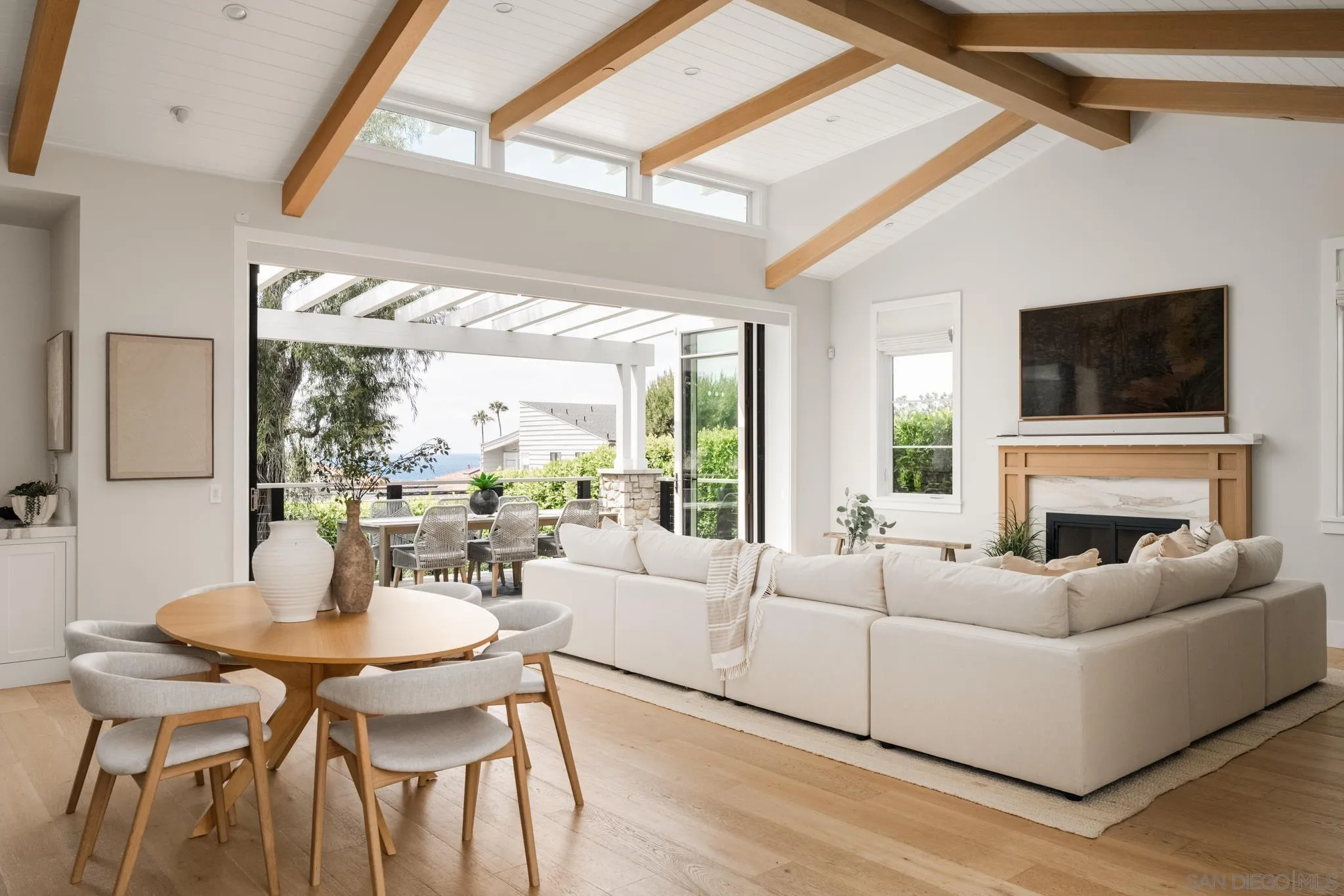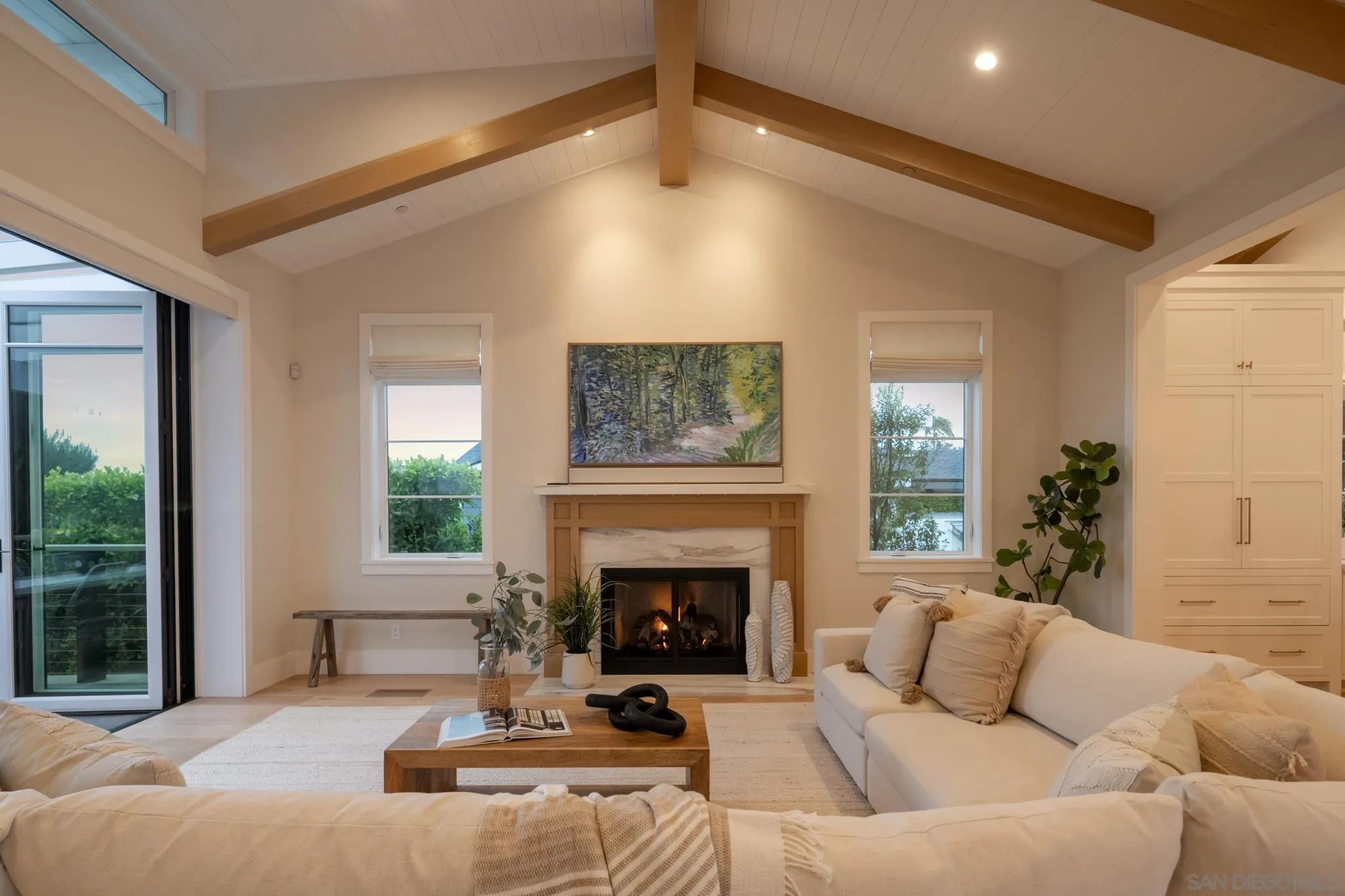 Set in Olde Del Mar just blocks from the beach, shops, and restaurants, this beautiful ocean-view home offers an exceptional coastal lifestyle. Built in 2022, the open 4-bedroom floor plan centers around an inviting great room with vaulted ceiling and retractable glass doors that open to an expansive porch, creating a seamless indoor-outdoor setting for sunset views. The chef’s kitchen features a generously sized island with marble countertops and luxury Miele 6-burner range with grill and double ovens. Two bedrooms are located on the main level, including a luxurious primary suite with balcony and spa-like bath. On the lower level, thoughtfully designed light wells and high ceilings enhance the bright, airy feel of the two additional bedrooms and bonus room. A detached ADU, hot tub, built-in BBQ, and covered outdoor living area with fireplace create an ideal setting for entertaining. Complete with paid solar and a 2-car garage with EV charger, this stunning residence presents a rare opportunity to own a newer build in a highly sought-after location west of the 101.