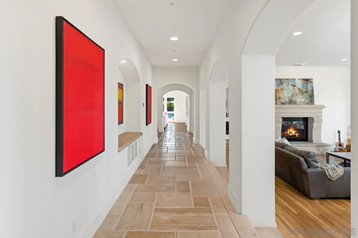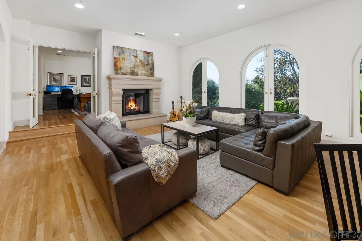 Light-filled and grand in scale, this soft contemporary estate sits on a quiet interior 1+ acre lot in the coveted guard-gated community of Fairbanks Ranch. Designed for both lavish entertaining and everyday comfort, the home offers soaring ceilings, expansive living spaces, and abundant natural light throughout. There are five generously-proportioned bedroom suites and two office spaces, one of which could easily be converted into a home theater. One bedroom suite is conveniently located on the main level. The upstairs primary retreat features dual en-suite baths, a large terrace, and lovely panoramic views, with three secondary bedroom suites just down the hall. The resort-style yard showcases a pool, spa, outdoor kitchen with bar seating, fireplace, and plenty of grassy lawn space for kids or pets to enjoy. A newer owned solar system adds efficiency. This home exudes quality craftsmanship, and is a wonderful opportunity to move in "as is" or update finishes to personalize a premier estate in one of Rancho Santa Fe’s most desirable communities.