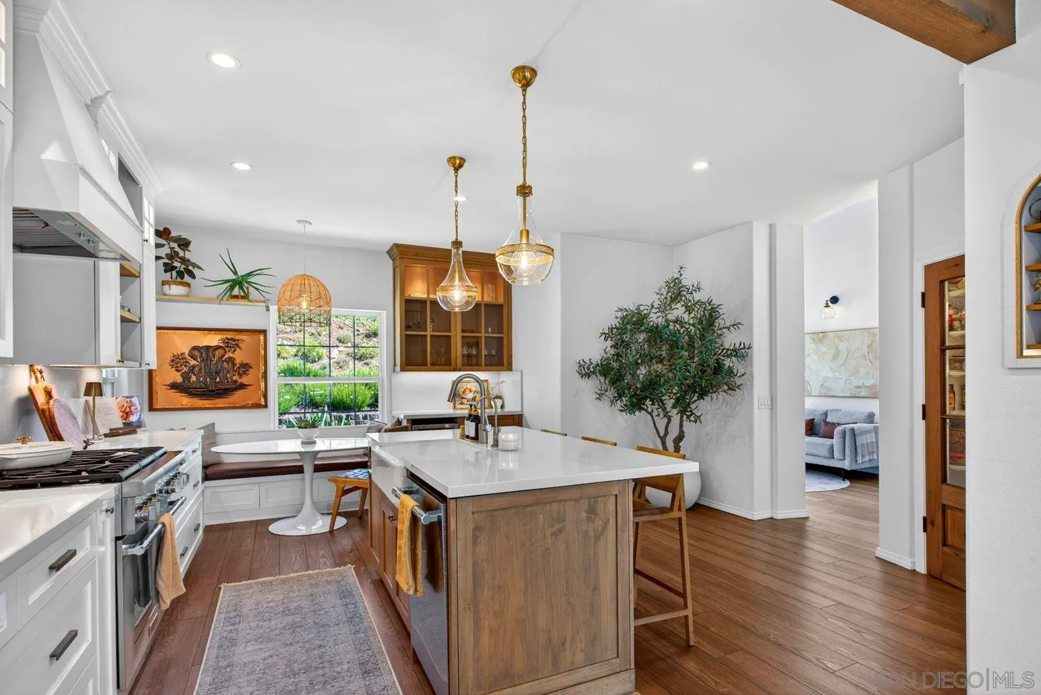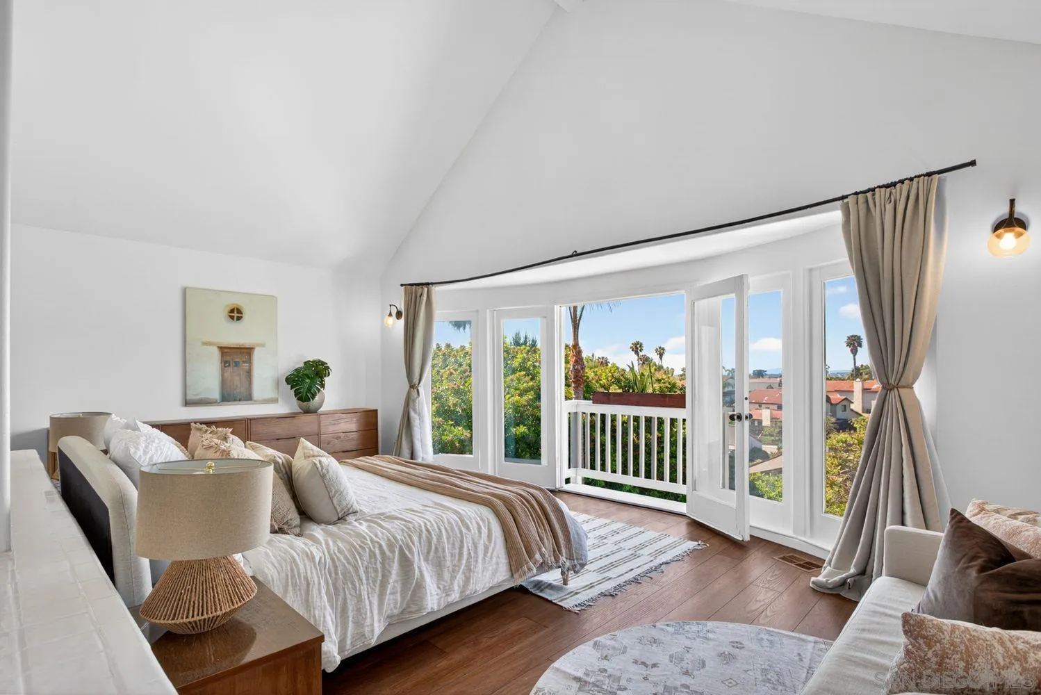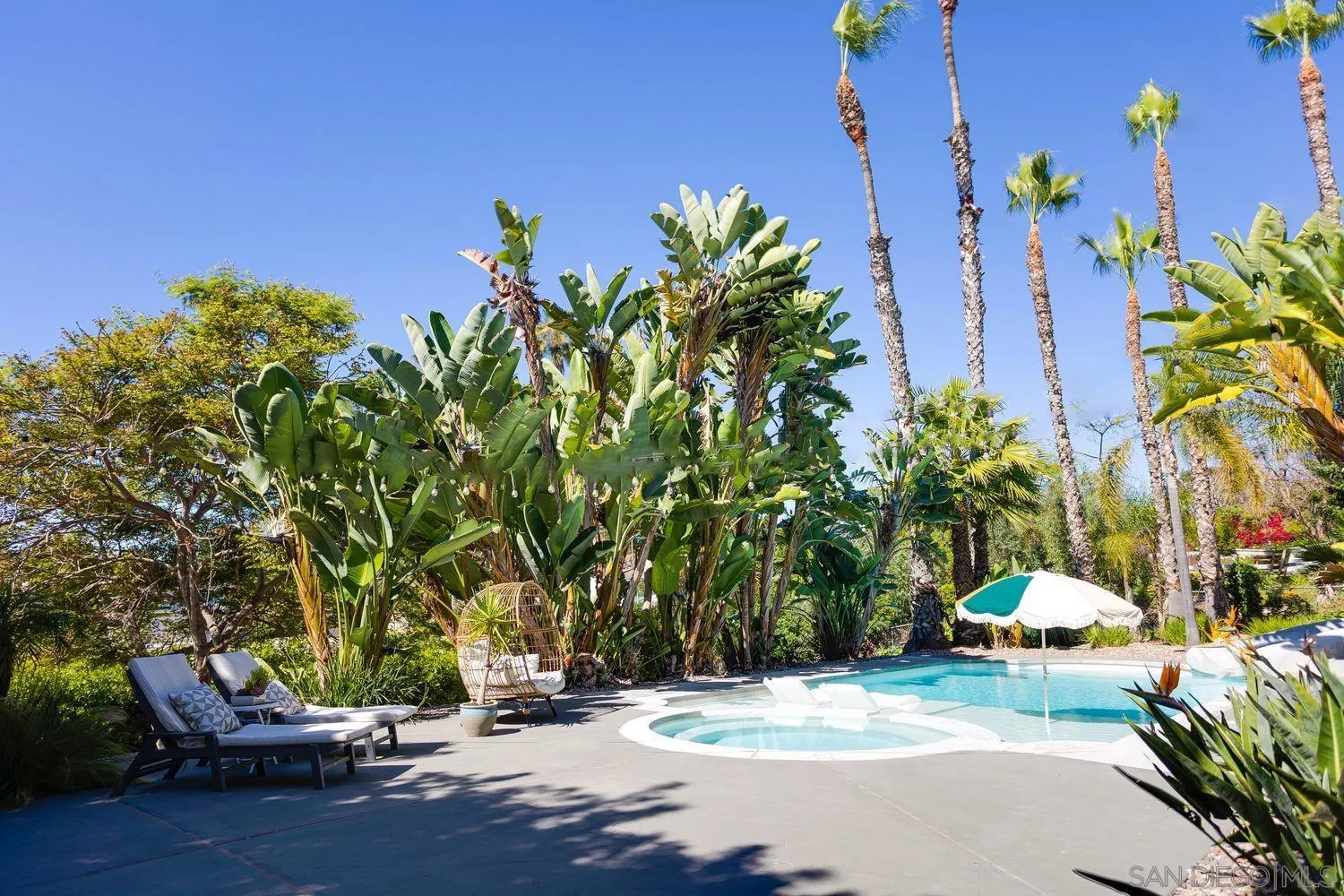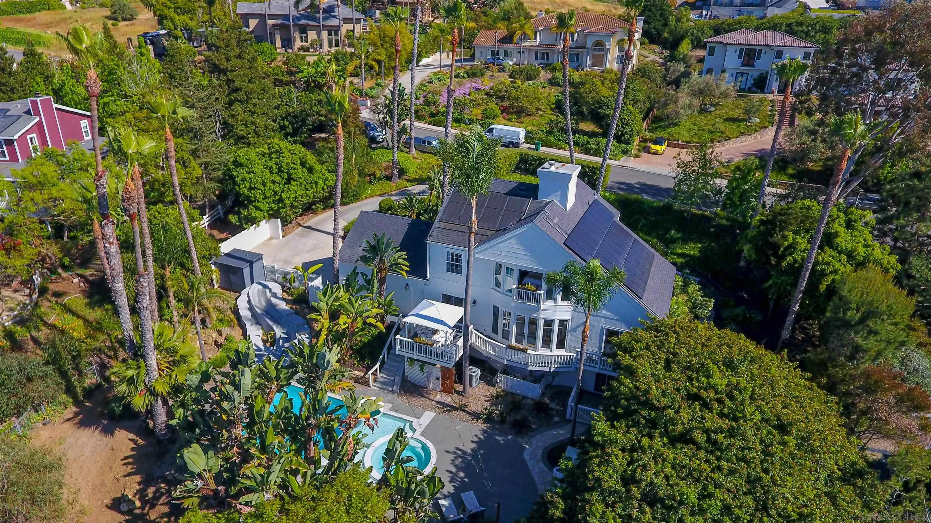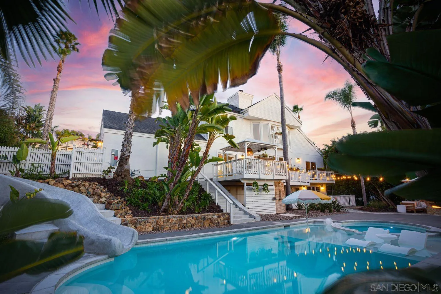 Set on an expansive half-acre lot in the heart of La Costa, this stunning custom estate offers a rare blend of design, privacy, and versatility. The home features 4 spacious bedrooms and 3 bathrooms, plus a fully permitted attached studio apartment with a private entrance, kitchenette, and full bath, ideal for guests, multi-generational living, or income potential. At the center of the home is a beautifully designed custom kitchen that flows seamlessly into the main living areas and out to the backyard, creating the perfect setting for entertaining or everyday living. Extensively updated throughout, the home boasts new flooring, fresh interior and exterior paint, new upstairs baseboards, a new garage door, refreshed bathrooms, a new security system, and lush privacy hedges. Dual HVAC systems with separate units for each level and fully paid solar for both the home and pool provide year-round comfort and efficiency. Inside, vaulted ceilings, floor-to-ceiling windows, oversized doorways, and custom built-ins fill the home with light and character. The backyard is a true private resort, featuring mature tropical landscaping, a sparkling pool with a 25-foot custom concrete water slide, fire pit, outdoor shower, zip-line with additional space to add a pickleball or sport court.