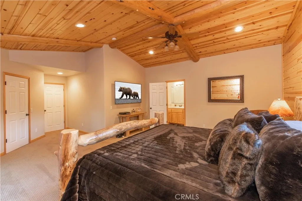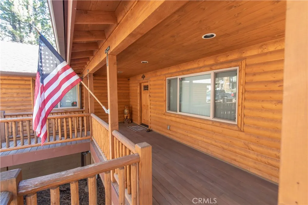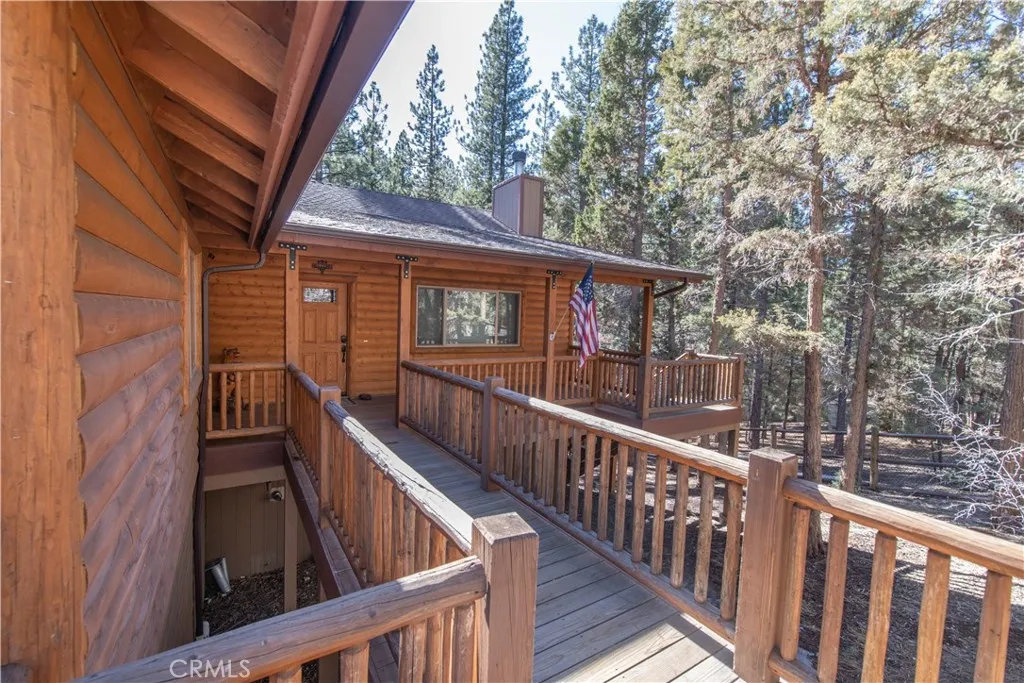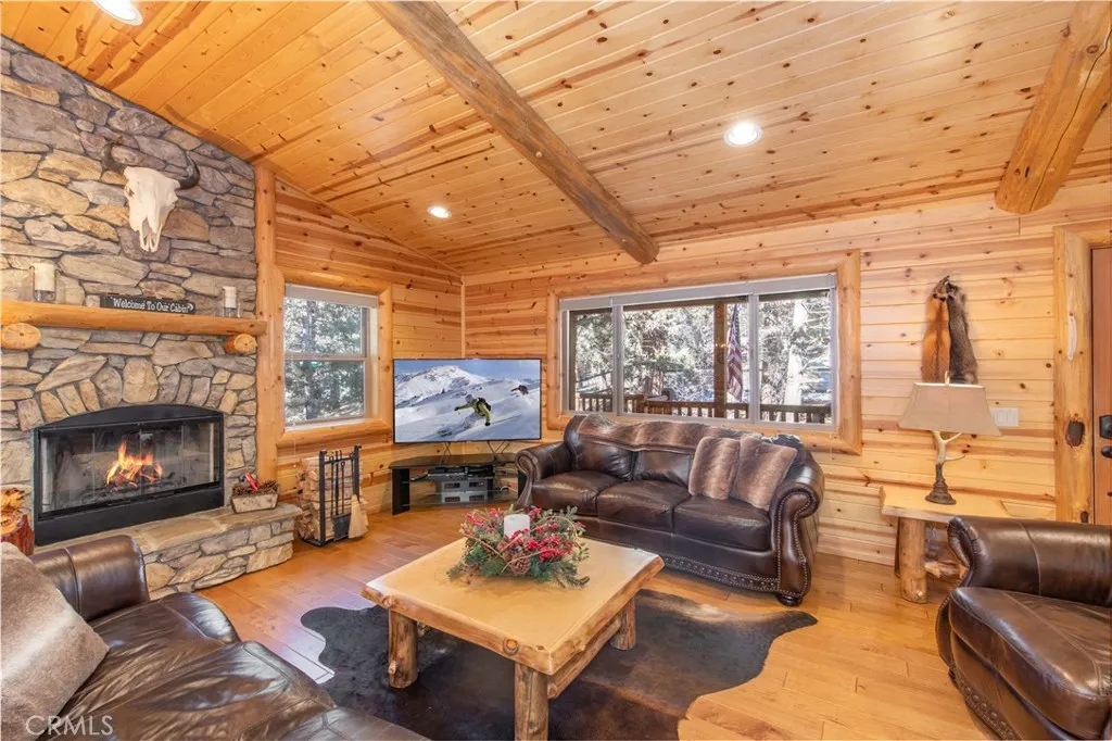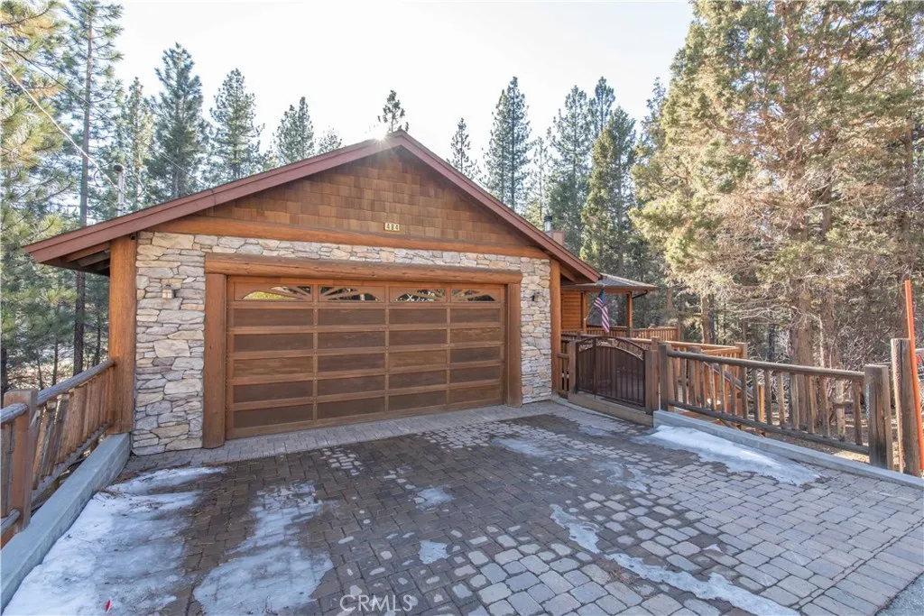 IMMACULATE, TURNKEY LOG SIDED HOME IN PRIME FOX FARM LOCATION & CLOSE TO ALL THAT BIG BEAR HAS TO OFFER! Wonderful treed setting, backing to new Rathburn Creek trail. Spacious great room living area with T&G knotty pine ceilings and log accents. Floor to ceiling stone fireplace. Adjacent dining space with easy access to rear deck. Open kitchen area has granite counters, breakfast bar seating, and newer Kitchen Aid stainless steel appliances. Distressed wood flooring. Huge rear deck is set up to entertain with seating area, BBQ, hot tub, TV and peek-a-boo ski slopes views. Large, private master suite has vaulted ceilings, walk-in closet and deck access. Updated lighting fixtures. Separate lower level bedroom suite could be a nice game room as well. Huge basement storage area with room for expansion & more square footage. Rathburn trail system provides easy access to the Moonridge commercial district & overflow ski parking. COMES FURNISHED RIGHT DOWN TO THE SNOW BLOWER!