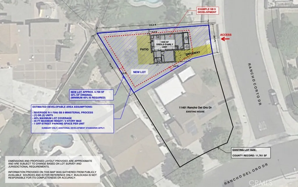 This is a rare opportunity to build a new home in the La Sierra neighborhood of Riverside! The owner has agreed to let a third party, BuildCasa, perform an urban lot split and legally subdivide the property into two separate parcels as authorized by SB9. Buyer can build single family home or duplex on newly subdivided lot. Buyer to verify uses with City. All utilities are nearby in street. New Lot will have access from Rancho Corto Drive. This property is close to Kaiser Permanente, Galleria at Tyler, La Sierra University, Rancho Loma Park, freeways, shopping, restaurants and SO MUCH MORE!