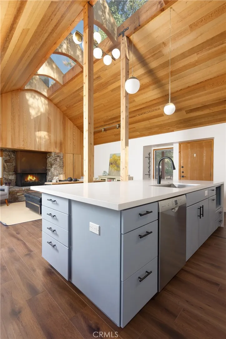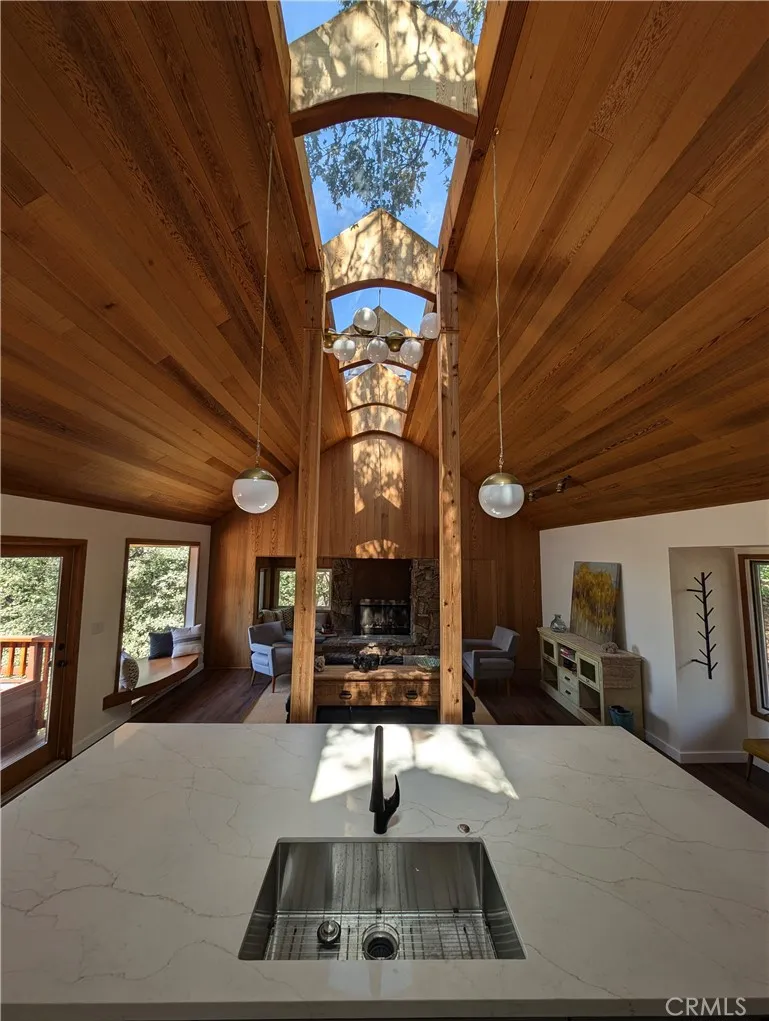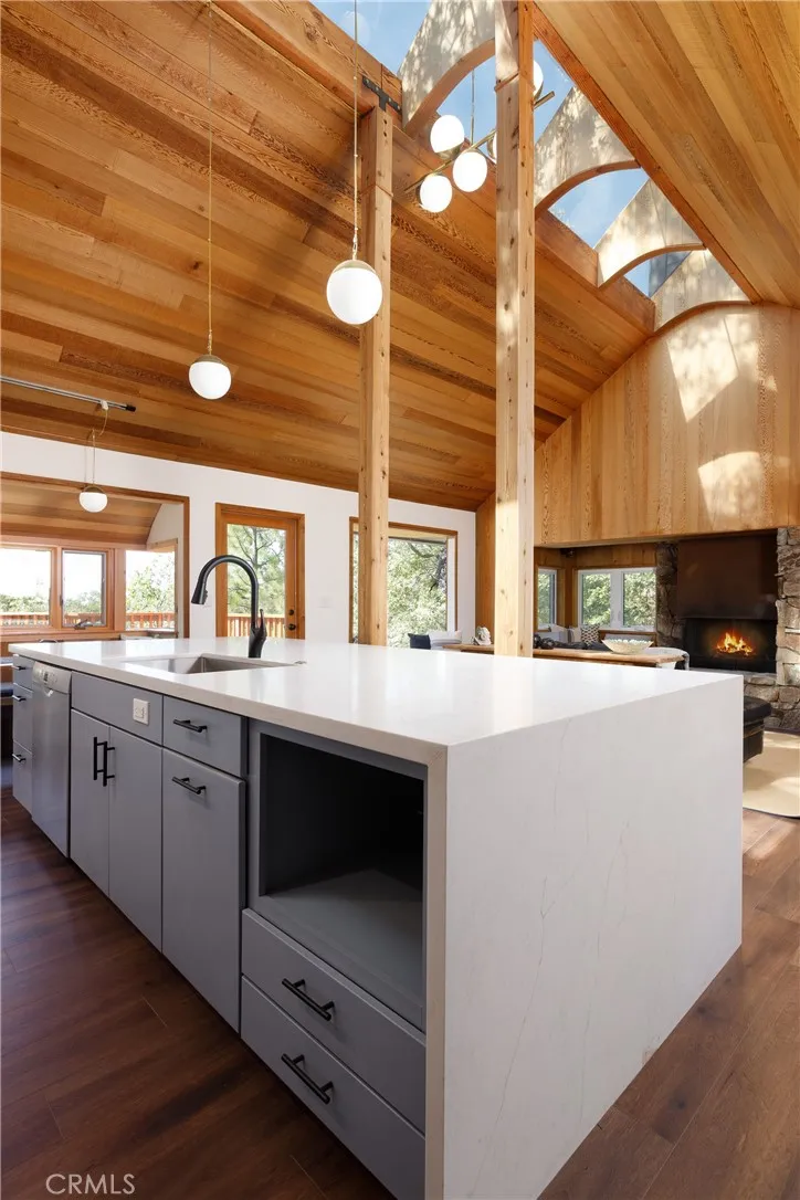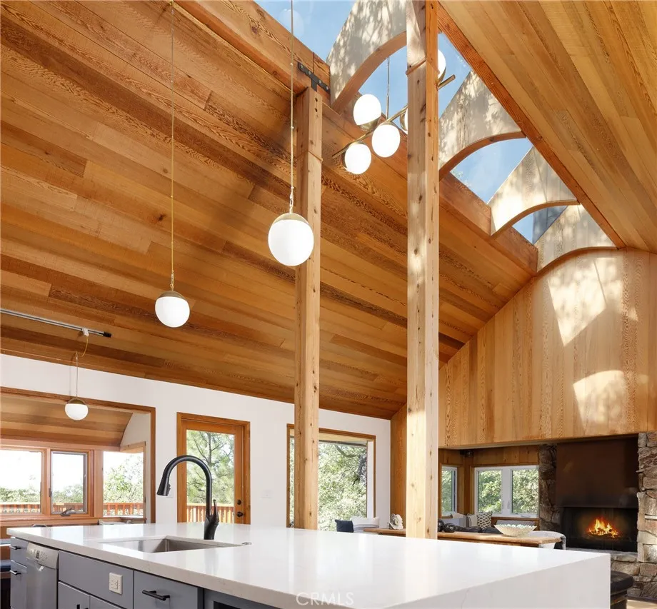 Sometimes the best surprises come in the smallest packages. That's certainly the case in the latest Brule-Cerwin remodel of this artistically unique hideaway. The only other owners are the ones who conceptualized, designed and built their dream cabin and the current owner/builders kept their concept alive, just took it to the upper limits of what it could be. The ceiling and walls of warm beautiful cedar are still there with hidden spaces that open with the touch of your hand, to house the TV and music system equipment in one and another is the laundry room! And the original owners idea of an open roof...or part of it...was kept in place, flooding the house with light from the more-than-a-skylight. Another original is the fireplace with metal hood and stone surround including a cuddly bench to curl up in. A wall was removed to open the living room and kitchen into one wide open space. A giant island in the kitchen offers seating on one side and high end appliances on the kitchen side. On the side of the kitchen is a built-in dining nook with a backdrop of windows. The living area has a spacious bay window to give you even more light. The two bedrooms are a perfect size with a loft area in each for office space or kid space, or extra sleeping space. A beautiful bathroom wth double sinks and tub/shower is conveniently near both bedrooms. A large deck in the back is a great place to barbecue and has built-in planter boxes for container gardening. Down a short set of stairs off the deck is space that could be turned into another bedroom and bath if needed, or it's just great st