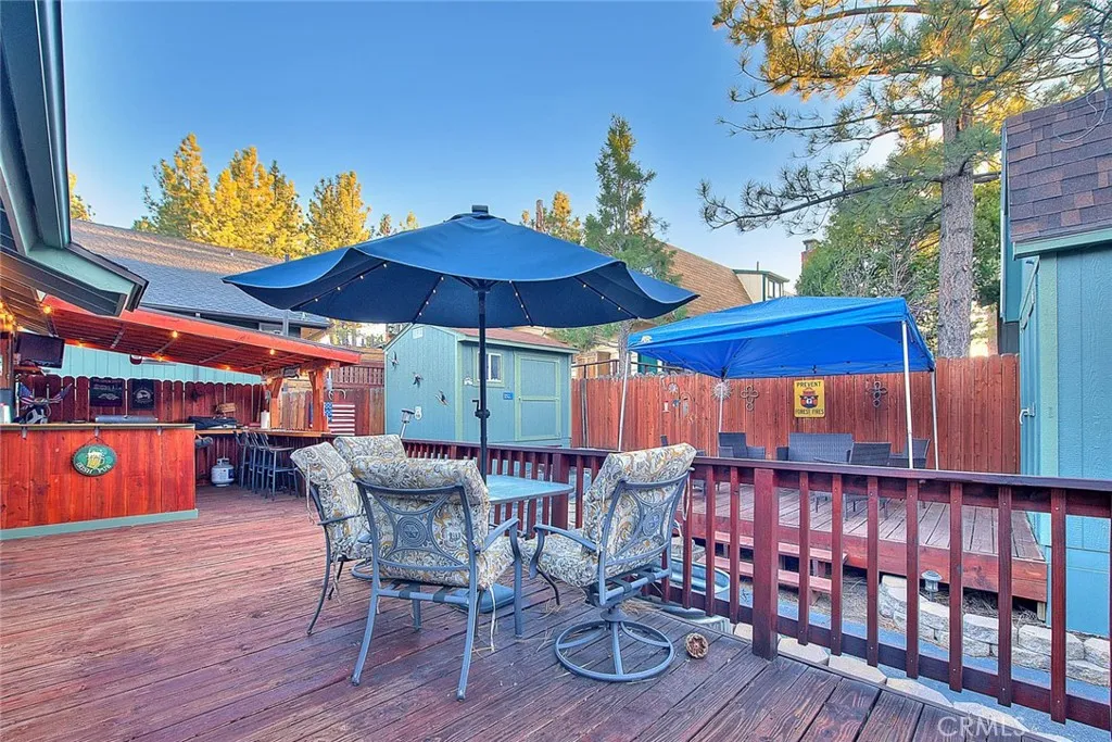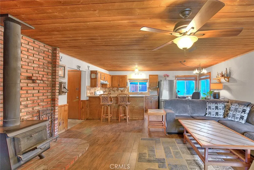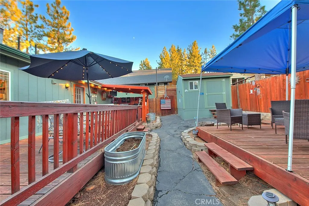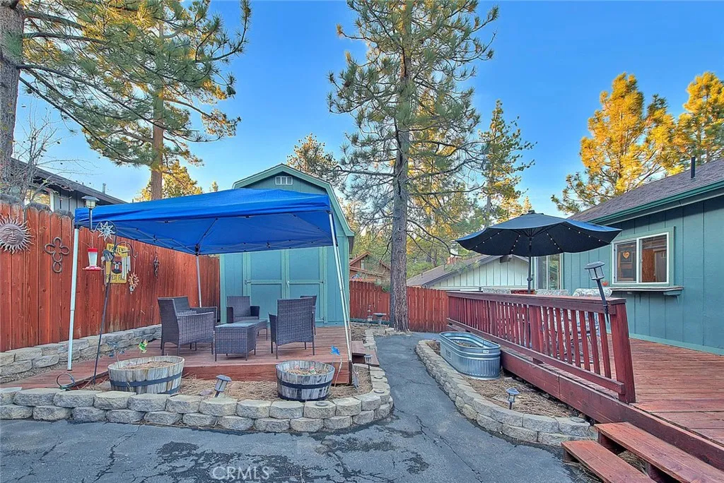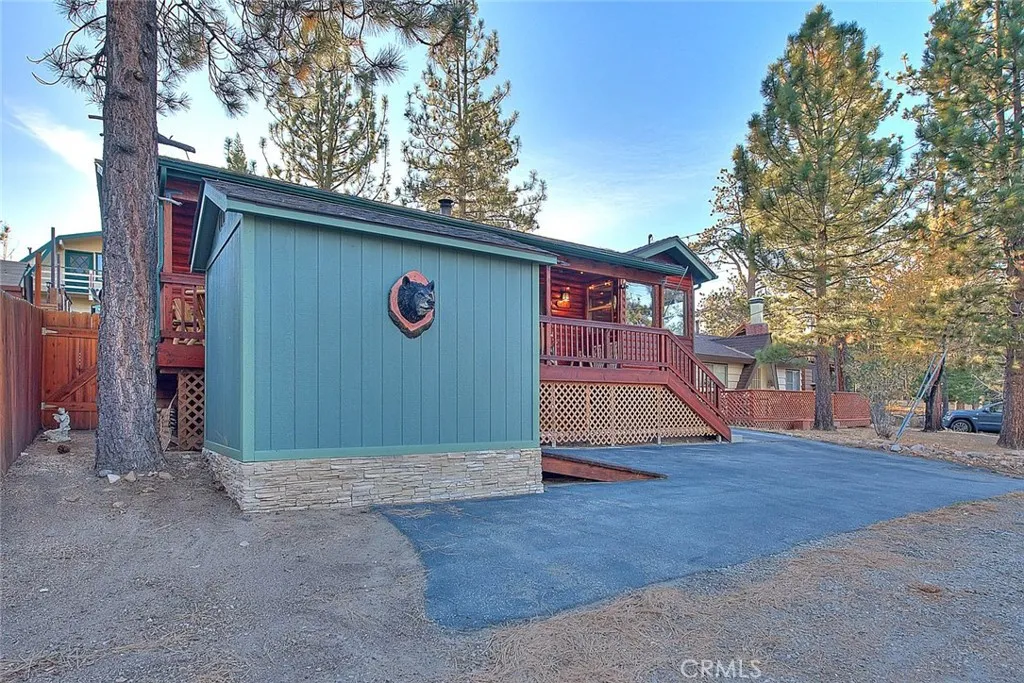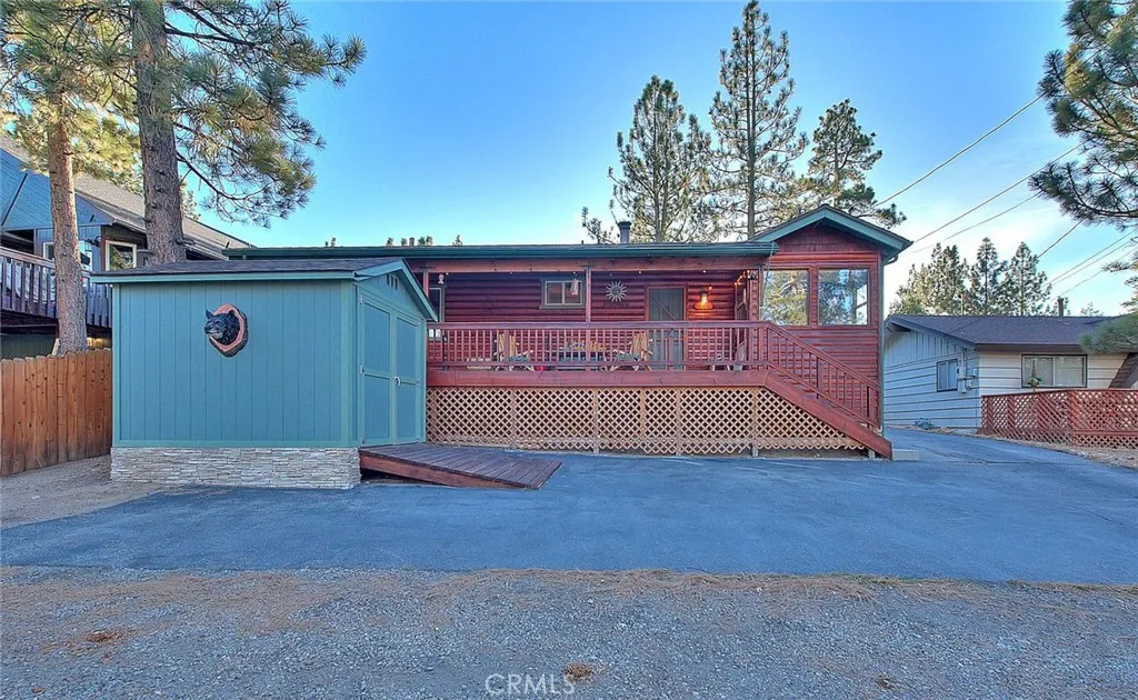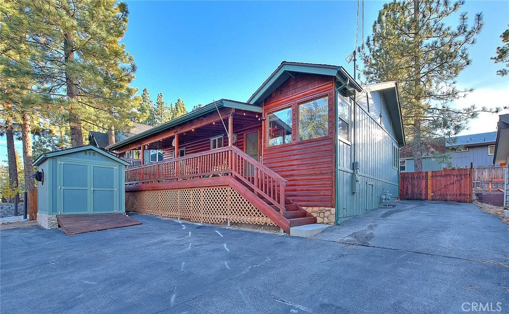 MOTIVATED SELLER: True Big Bear Cabin with 2 large bedrooms and beautiful upgraded bathrooms. This is a must-see, a true jewel. An inviting covered porch welcomes you home. Inside, the open-concept family and dining room centers around a wood-burning stoveperfect for cozy gatherings and game days. The adjacent galley kitchen is warm and functional, ideal after a day on the slopes or lake. The main suite features a large closet and a beautifully renovated bathroom with an open shower and refined tile and stone finishes. The guest bedroom offers comfort and storage, while the newly updated guest bath features modern stonework and a walk-in shower. A spacious utility/mud room adds convenience with laundry and extra storage. Out back, the expansive yard is made for entertainingwith a sunny porch, covered entertaining space, and room to host. Two of the three outbuildings sit in the rear yard, including one with electricityideal as a workshop, office, or creative retreat. With secure storage for gearbikes, skis, sleds, ATVsand parking for 35 vehicles plus RV space, this home is designed for full-time living or weekend escapes.