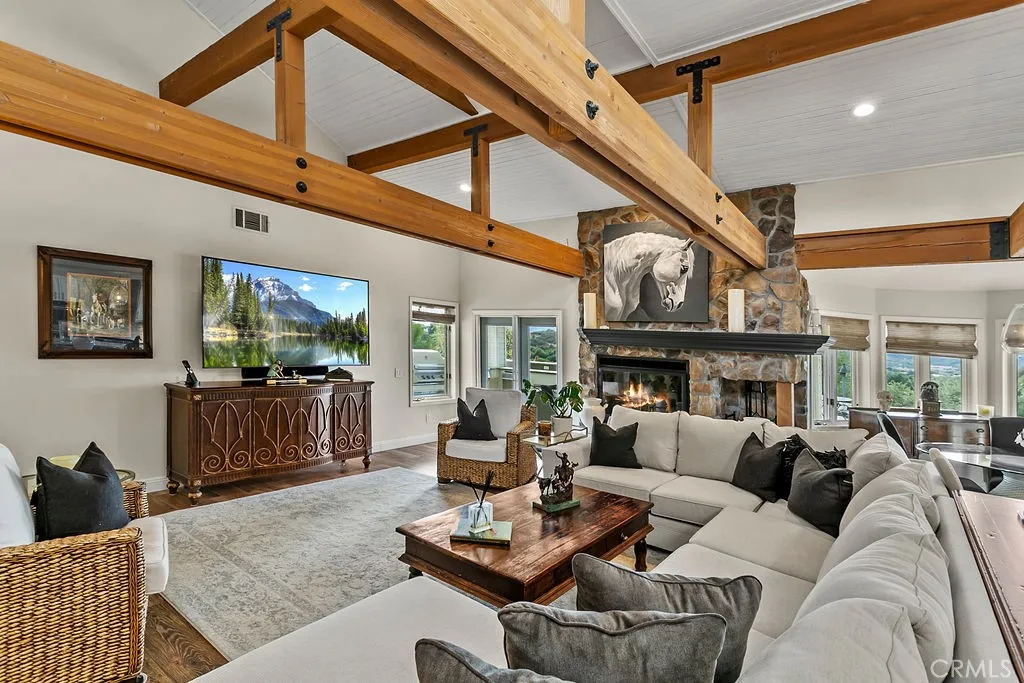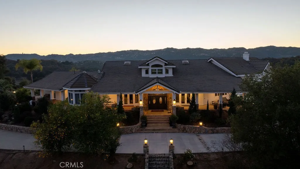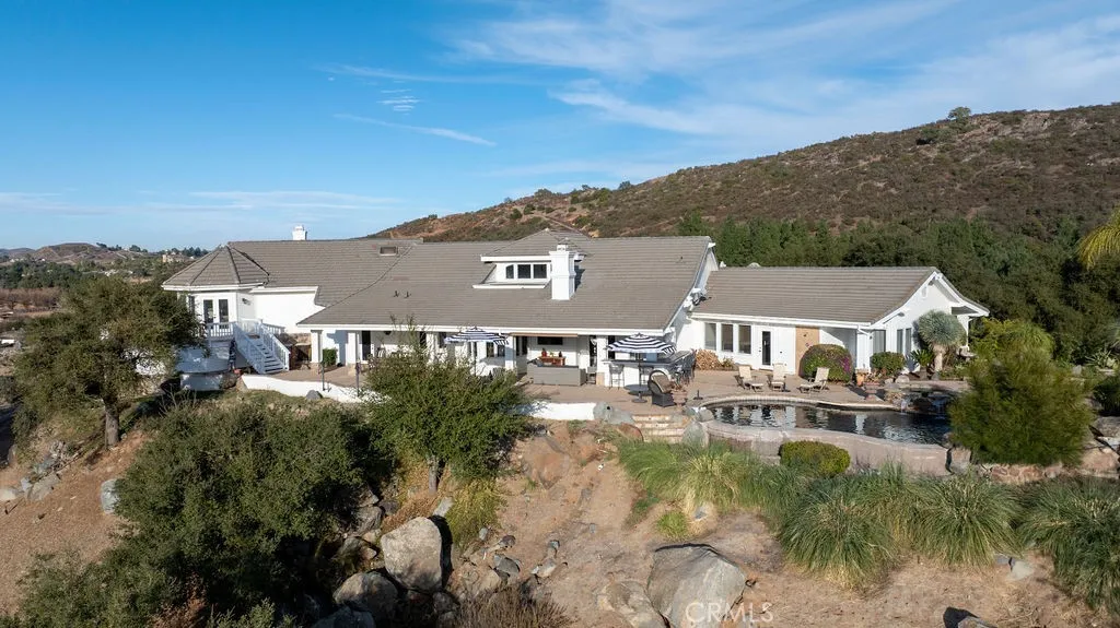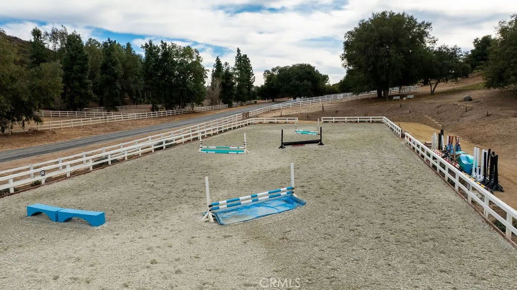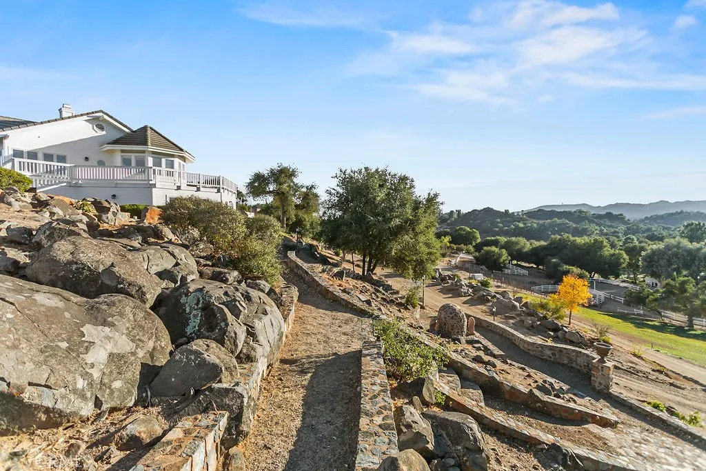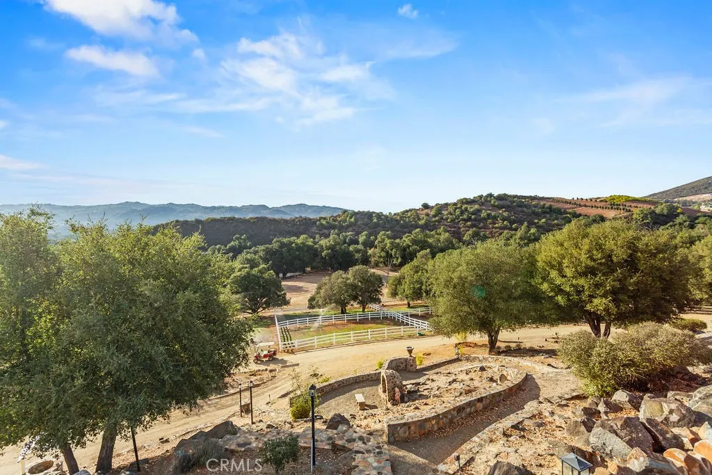 Stunning one of a kind equestrians dream view estate. just over an hour to Orange County and North San Diego. Enter through impressive gated entry up long private driveway. The estate is set up for the professional trainer or personal equine client . Two arenas, one GGT footing, the 2nd arena sand. Round pen, 8 turn outs, 6 with natural oak tree shade, waterers, some grass, white vinyl fencing. Centre Aisle 6 stall barn,auto waterers, fly system, cameras, rubber matting, lookouts, additional 3 stalls, grooming/bathing area. Tack shed and more. The estate has its own shaded riding trail and also access to many miles of riding trails within the area. Small Cabernet Sauvignon vineyard, corn hole and Bocci Ball court ,adjoining gazebo viewing area. Multiple sitting, viewing areas. Expansive Chicken house, Italian garden, Zen/prayer area. Many established oaks drape the property with shade and beauty. Three apartment/studios in the barn, parking for multiple vehicles, two automatic security gates.Shade trees, fruit trees and several entryways. Basically Single Story sprawling residence is recently updated with amazing gourmet kitchen with huge center island,2 dishwashers. gas stove, double ovens built in refrigerator and large pantry, opens to grand great room with seoaring ceilings, hand crafted beams, and crackling fireplace, French doors, views from every window. Primary bedroom, 2 walk in closets, fireplace, soaring ceilings and sitting area. Primary bath is stunning , 2 auto toilets, fireplace, romantic tub, grand shower area. Formal dining area has a wall of cabinets and
