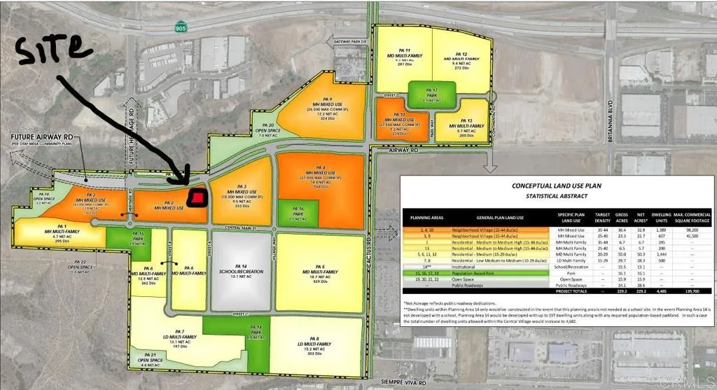 Prime Land for Sale, Incredible Opportunity! Vacant Land Parcel adjacent to Otay Mesa Central Village. Great investment in the New "Otay Central Village" Development zone. Level Lot. 39,640 S/F (.91 Acres) Lot 46 APN# 646-092-07-00. Zoned CC-3-6. This allows for "development with a high intensity, pedestrian orientation and permits a maximum density of 1 dwelling unit for each 1,000 square feet of lot area" allowing around 40 units for development, Mixed use, Commercial, etc.. Additional Permitted Uses include: Parking, Retail Sales, Groceries, Food & Beverage, bars, restaurants, offices and much more... Street access within 200' of property (see arrow in image).