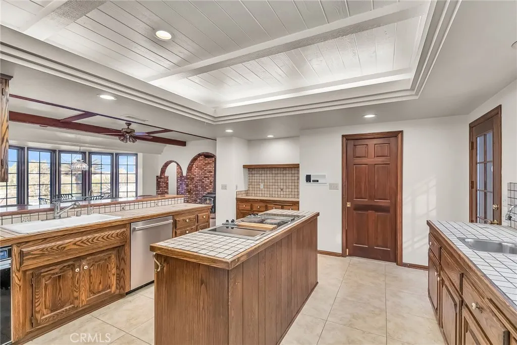 VICTORIA WOODS SOUTH- KNOB HILL ESTATES- stunning custom built Santa Barbara style Spanish Colonial home nestled on this elevated hillside site: Commanding views of Palm Tree lined Victoria Avenue, city lights, Mount Rubidoux, the downtown Riverside skyline and the snow capped mountains beyond. Timeless style and character abound in this thoughtfully configured home; Massive formal living room with dramatic wood beamed ceiling and large Palladian window and wood-burning fireplace; Generous formal dining room with coved ceiling; Expansive island kitchen with walk-in pantry, breakfast bar and all built-in appliances opens to the spacious family room with large circular walk-a-bay window and Inglenook Fireplace with wood stove; Ascend the wide stairs to the upper level bedrooms separated by the upper landing; Two family bedrooms each with a private ensuite bath are located at rear south end of the upper level; The primary suite enjoys the seclusion of the north front of the second floor where views are enjoyed from the adjoining terrace; Additional primary suite amenities include the luxurious bath and walk-in closet with direct access to the upper level laundry room; Also sharing the upper floor but accessible from the back stairs is the guest suite or bonus room with kitchenette, private bath and access to the laundry room; Oversized, attached three-car side loaded garage and large driveway parking area; The grounds are beautifully landscaped with mature shade and multiple varieties fruit trees and plantings amid multiple patios on varying levels affording ample outdoor recr