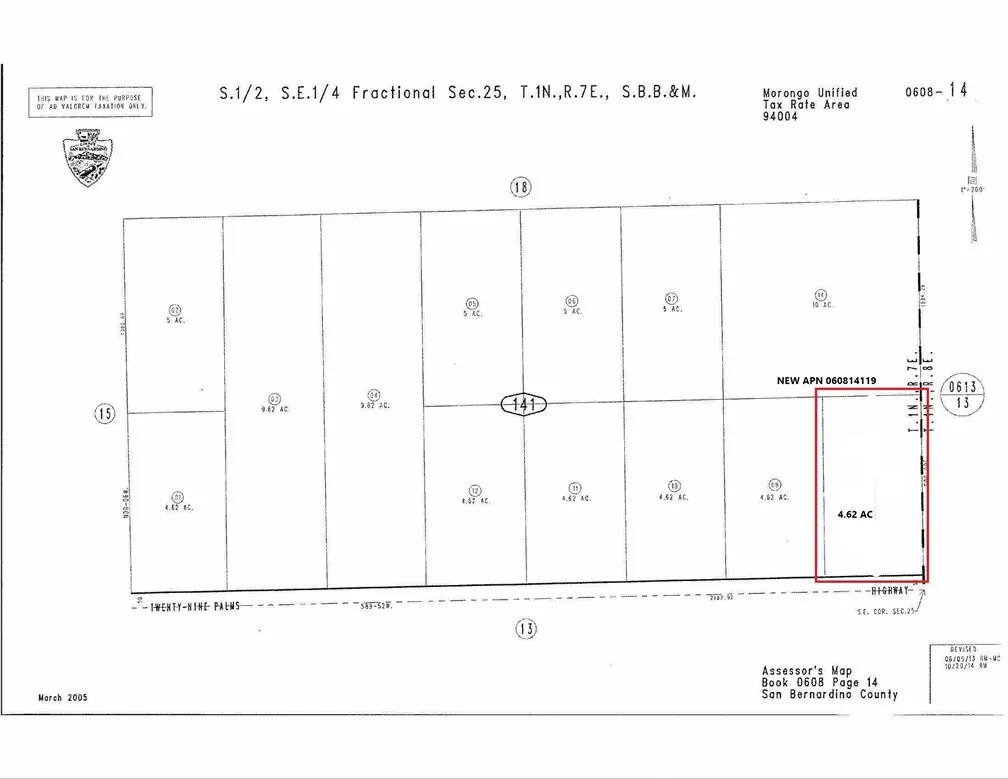 Discover an extraordinary opportunity with this remarkable 4.64-acre lot in Joshua Tree, boasting an impressive 330 feet of frontage along the iconic 29 Palms Highway. This rectangular parcel, measuring approximately 330 by 613 feet, is strategically positioned on the northern side of 29 Palms Highway at the intersection with Lee Road. As the first parcel encountered when entering Joshua Tree from the east, or the last when traveling west, it serves as a prime gateway to this enchanting area. Lee Road acts as the boundary between Joshua Tree and 29 Palms, enhancing its accessibility. Conveniently situated midway between the western and eastern entrances to Joshua Tree National Park, this lot offers unparalleled potential. With unobstructed vistas of the majestic mountains of Joshua Tree National Park to the southincluding Queen Mountain, Quail Peak, and Eureka Peakas well as Copper Mountain to the north, the possibilities for development are limited only by your imagination. Power lines run along 29 Palms Highway, and water services may also be available in the vicinity. This parcel falls within the jurisdiction of the Joshua Basin Water District, ensuring essential utilities are within reach. **Street number has not been assigned. Numbercial reference is part of the APN**
