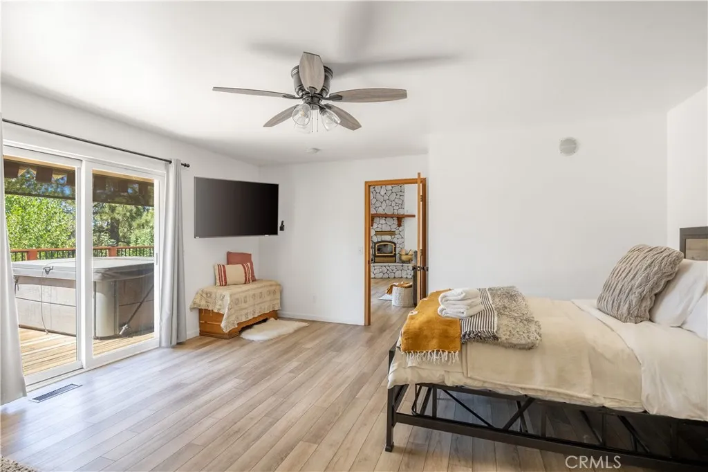 With a freshly updated floorplan (November 2025), come over and see this stunning Eagle Point home which embraces over 4,000 sq ft of comfortable and spacious living. This lovely home sits majestically on an over-sized yet level lot, this home has been lovingly updated by the current owners who have rented the home short term between family vacations with excellent rental results. The level driveway has two entrances, one side of the home boasts a 2 car garage while the other has an over sized - single car garage and access to a new EV charger. The layout allows for separate living spaces for larger groups, or multiple families sharing the home on vacation. Upon entry there's a very open and spacious kitchen and dining area, with sliding doors leading out to the first deck. On this level there is the primary bedroom with vaulted ceilings, updated ensuite bathroom, and two additional bedrooms that are generously sized. There is a central, updated bathroom in the hall, a tv den with daybed and a reading library, and at the end of the hall is the laundry area. Upstairs leads to a great room with an additional deck, this level has a hot tub with lake and mountain views. High ceilings create a very open and bright living area with room for a huge dining table too. Another oversized bedroom with additional kids room/ nursery, huge ensuite bathroom where the bathtub overlooks Big Bear Lake. On the top floor is large game room loft with desk, pool table, games and more stunning lake views. Lake access is just the next street away. The back yard is fenced in and spacious yet private