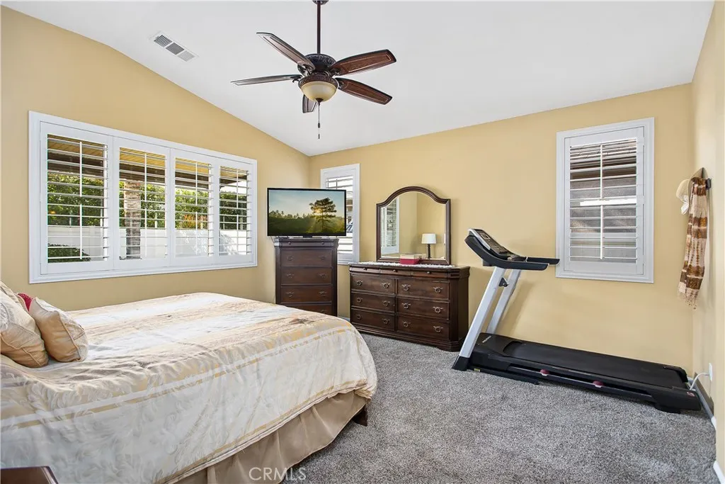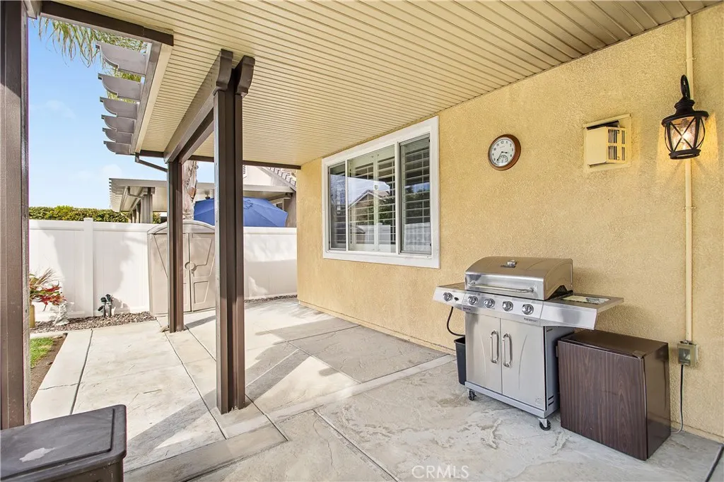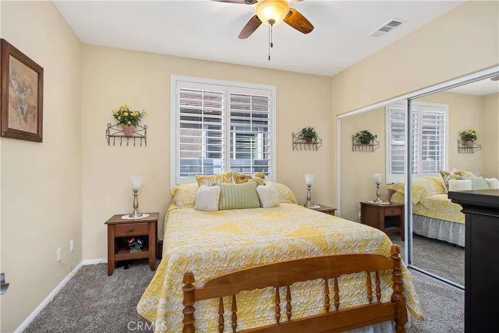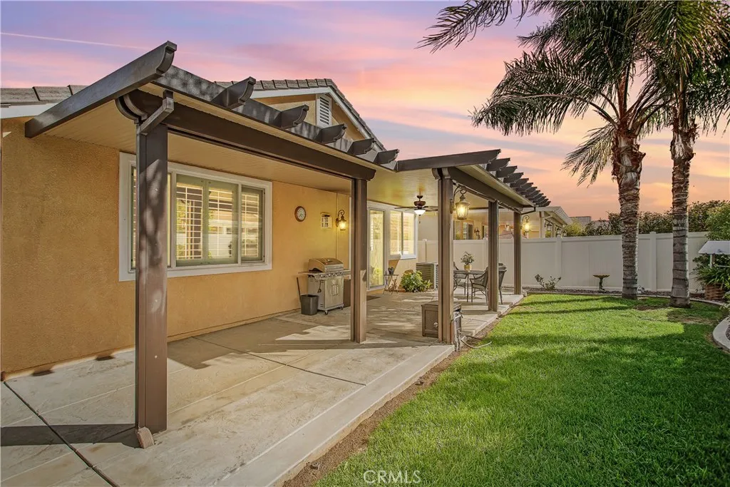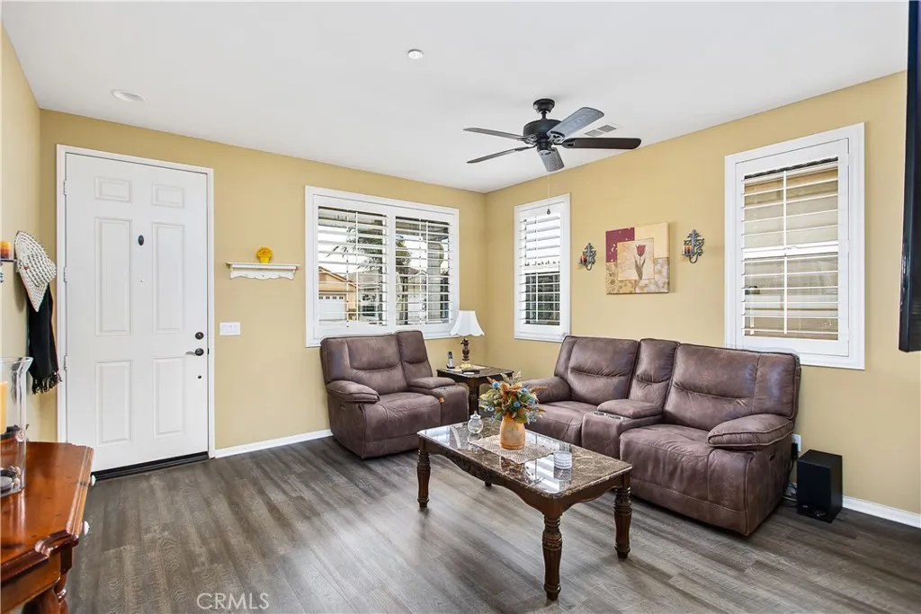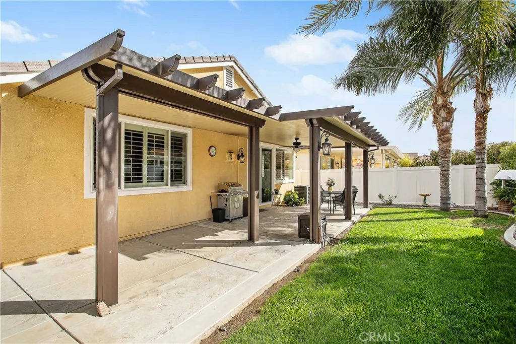 Beautiful, move-in ready home in the 55+ gated community of Orchid at Pacific Menifee. This single-story home on an interior cul-de-sac street features 2 bedrooms, a den/office, and 2 full bathrooms. The remodeled front yard includes an expanded porch area, an enlarged driveway for 3 vehicles, a raised brick planter, artificial turf, stone pavers, and electrical outlets under the eaves for convenient outdoor lighting use. Inside youll love the high ceilings, window shutters, quartz countertops, ceiling fans, and engineered hardwood floors throughout with carpet reserved for both bedrooms. At the heart of this home is a chefs delight kitchen. Featuring stainless steel appliances, loads of cabinet and counter space, endless quartz countertops, and a massive kitchen island with breakfast bar seating. This kitchen flows seamlessly into the dining area and a large family room for an open concept feel. A gas fireplace and custom media built-in anchor this space well. The primary suite includes a walk-in shower, soaker tub, dual sink vanity, and a spacious walk-in closet. The secondary bedroom includes mirrored closet doors and plenty of space. An inside laundry room with sink and additional storage, plus a whole house water softener system is also nice. In the rear yard youll find the perfect blend of stamped concrete, lush green grass, low maintenance plants, and a full-length aluminum patio cover providing shelter as you enjoy this tranquil retreat. Outdoor lantern sconces and a ceiling fan elegantly illuminate the nights. Its the best yard to unwind and relax. White vinyl fenc