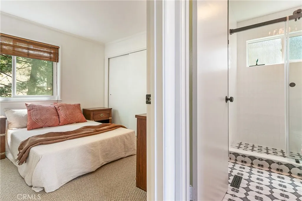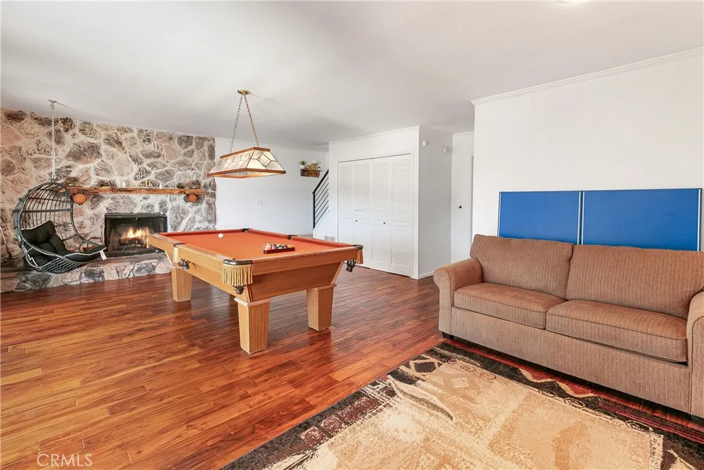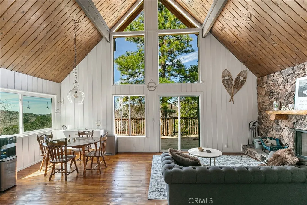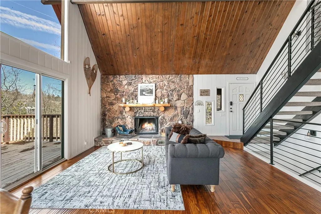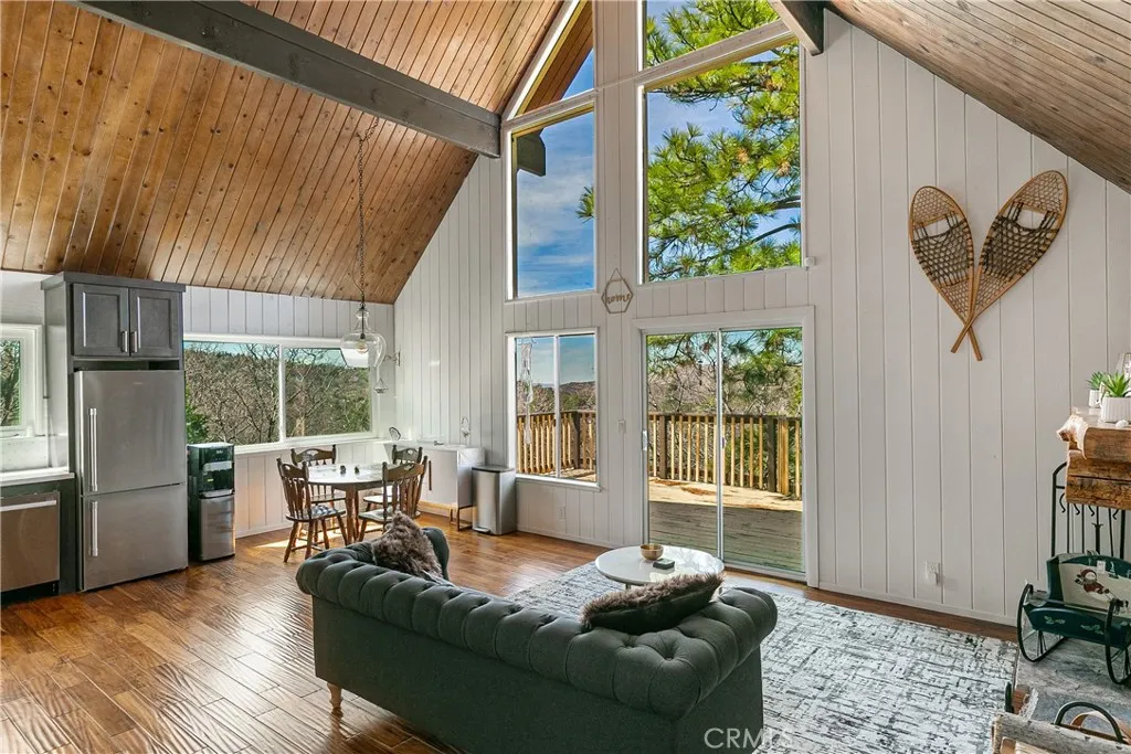 Treehouse Vibes with Lake Rights & Unbelievable Views! Welcome to your peaceful mountain escape in the coveted Lake Arrowhead lake rights area! Nearly level entry with just one easy step to the front door, situated on a paved and maintained road. This home feels like a private treehouse retreat, nestled among towering pines with no visible neighbors in sightjust endless natural beauty. Enjoy the convenience of a huge driveway that can comfortably accommodate 34 cars, depending on sizeplenty of room for guests or multiple vehicles. Step inside to soaring A-frame beamed ceilings and a spacious open-concept living area featuring a stunning rock fireplace. The living room and kitchen are perfectly positioned to take in jaw-dropping panoramic views of national forest, dramatic boulders, rolling hills, and vibrant greeneryso surreal they look like a painting. The updated kitchen offers modern cabinetry, sleek countertops, and a stylish backsplash, flowing seamlessly into a large dining area that easily seats eight. Two bedrooms are located on the main level, each with views of the forest and their own closets. The updated bathroom on this floor features chic tile, a modern vanity, and a walk-in shower. Upstairs, the airy loft bedroom boasts two oversized closets and awe-inspiring views through the A-frame windows that match the ones seen from the expansive upper deck. Downstairs is a spacious bonus living area, currently used as a TV and game room with a second rock fireplaceperfect for entertaining or converting into a fourth bedroom. A serene additional bedroom with bold blue l