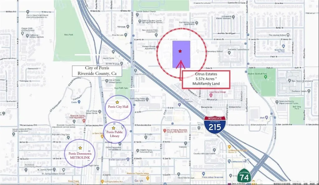 A fantastic opportunity for a Developer / Investor to build a new Townhome community in a great and growing area of Perris with easy freeway access for commutes to Riverside, Orange and San Diego counties and located near shopping, schools, rail lines and other city amenities. This property lies within the boundaries of the CITY OF PERRIS Redevelopment Project Area. The land consists of 4 parcels totaling the 5.57 acres that is unobstructed, level land of MFR-14 zoning, with the city stating they wpuld be open to a zoning change to MFR-24 to accommodate the proposed project. . Seller has prepared preliminary architectural plans, Phase1, Soil, Geographic, Capacity and others including plans for a 125 unit Townhome project. Don't let this opportunity pass you by!