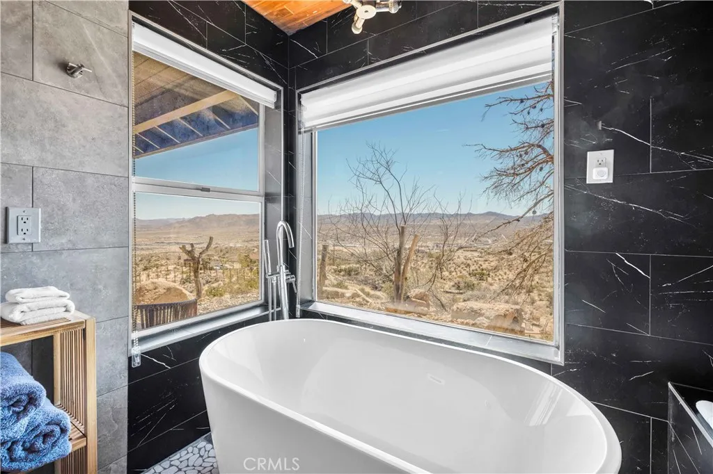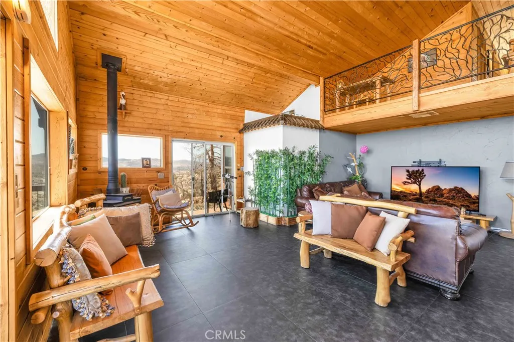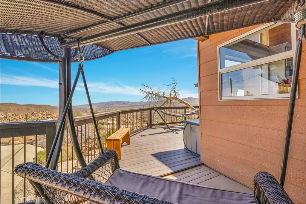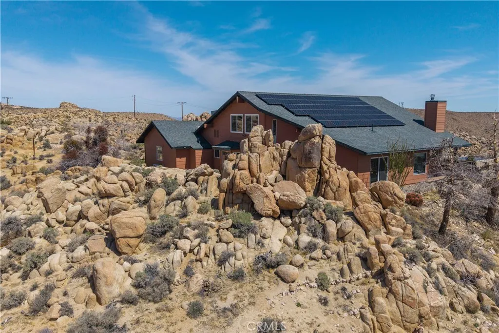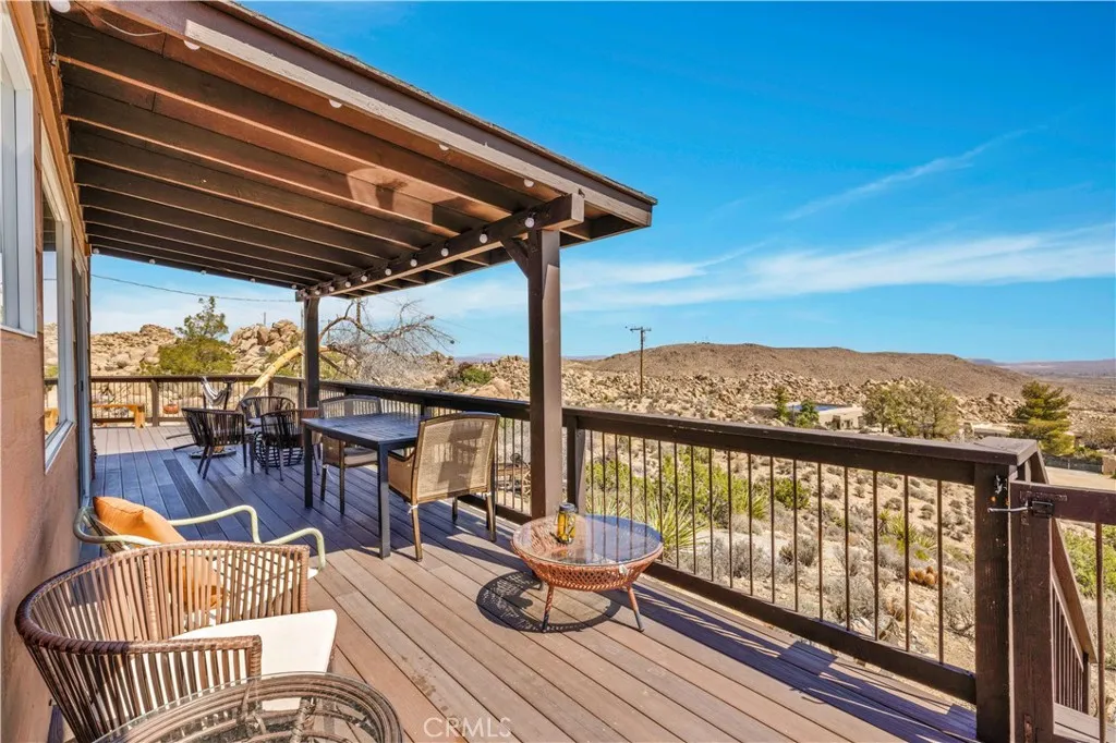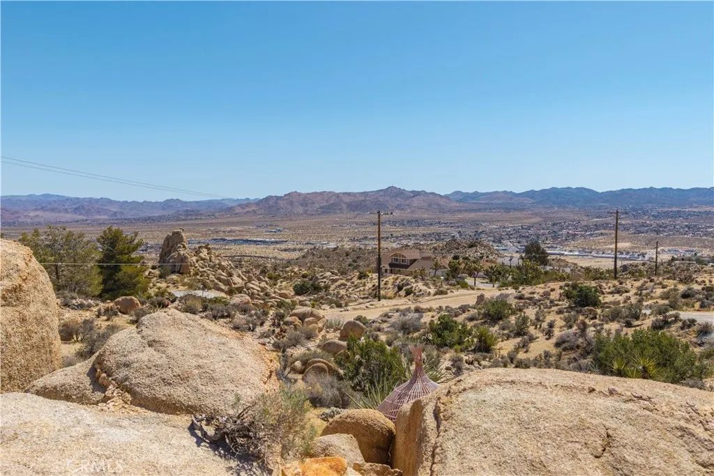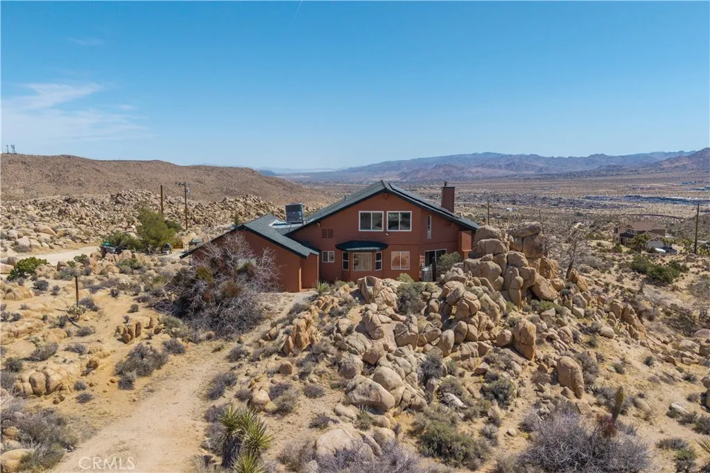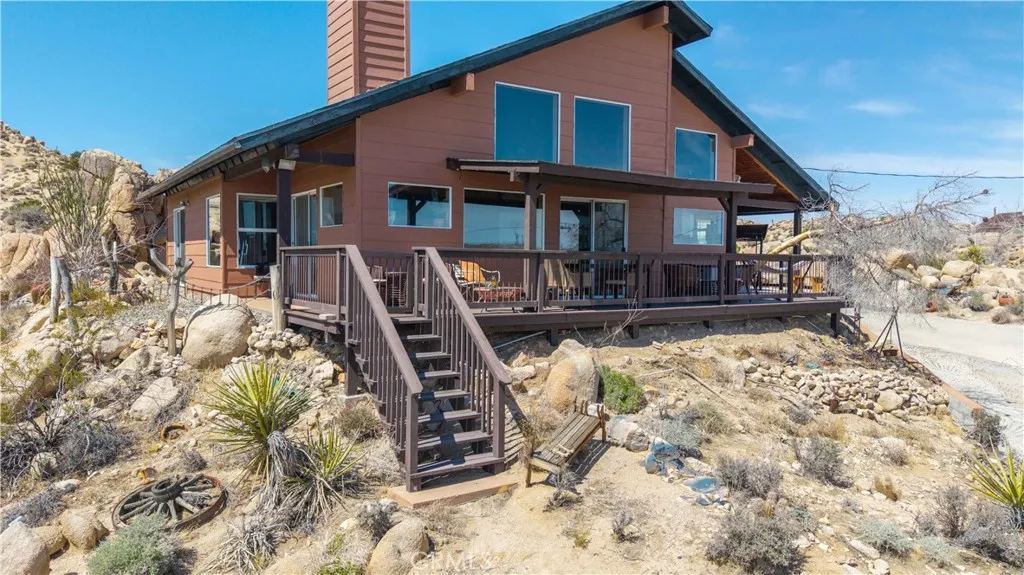 Permitted Short-Term Rental with Panoramic Views, Boulder Formations and Perched high above Yucca Valley, this stunning 2-story home offers unmatched views, incredible privacy, and a rare combination of natural beauty and income potential. As you arrive, youll immediately appreciate the secluded hillside location surrounded by massive boulder formations and sweeping views of the valley below. Step inside to be welcomed by gorgeous custom woodwork throughout and a spacious open-concept main living area featuring soaring vaulted ceilings and large windows that flood the home with natural light. The fully remodeled kitchen is the heart of the homestylish, functional, and open to the living space for effortless entertaining. Just outside, the wrap-around deck is where youll want to spend all your time, soaking in the breathtaking views, starry nights, and serene desert sunsets. Downstairs, you'll find two large bedrooms, each with their own remodeled ensuite bathrooms, including the primary suite, which features multiple closets, modern finishes, and expansive windows with stunning views. Theres also a third full bathroom downstairs for added convenience. Upstairs offers multiple sleeping areas, a private bedroom, and a half bath, making it perfect for hosting guests or maximizing rental income. The finished garage has been converted into a game room, adding even more space for entertainment and relaxation. One of the biggest perks? The land itself is truly special, dotted with impressive rock formations and offering some of the most elevated and unobstructed views in the area.
