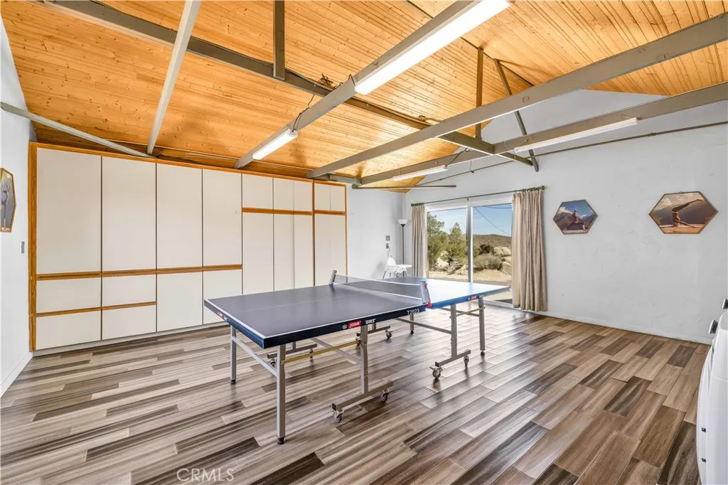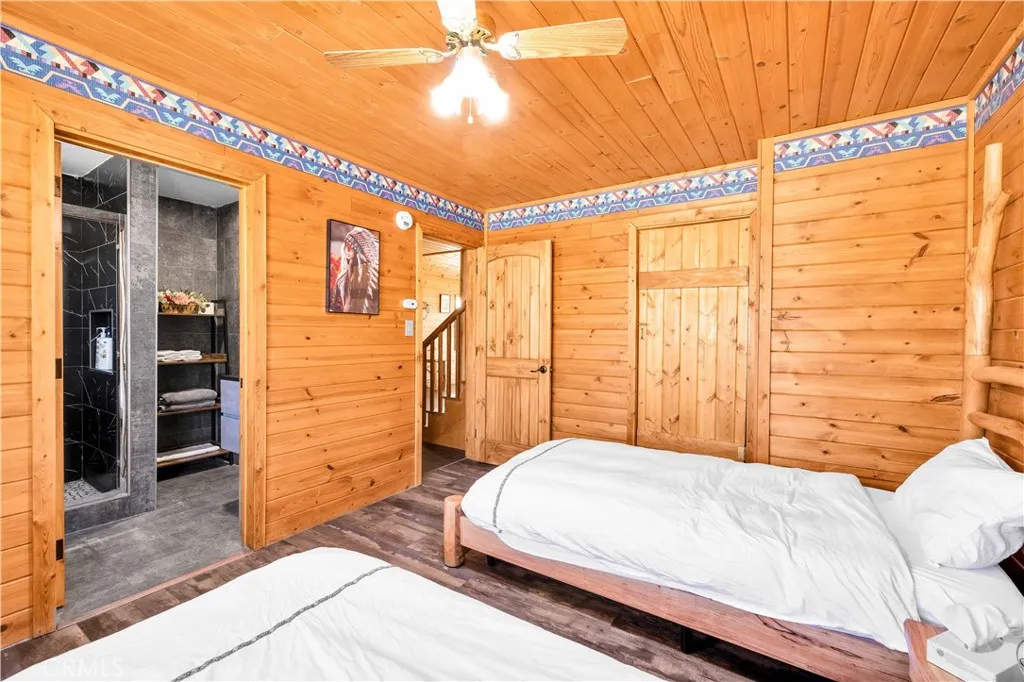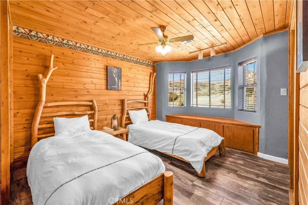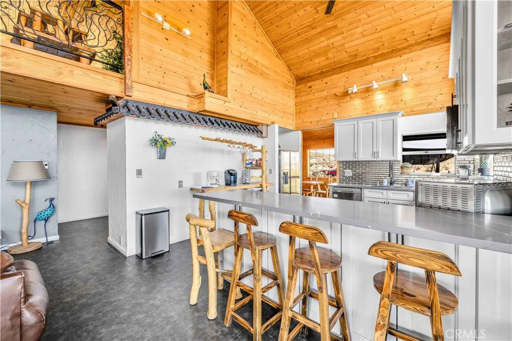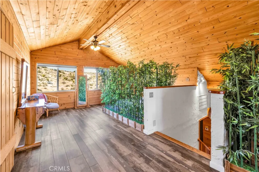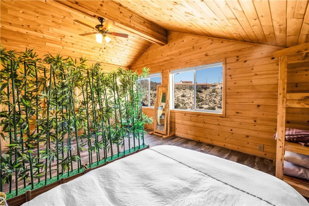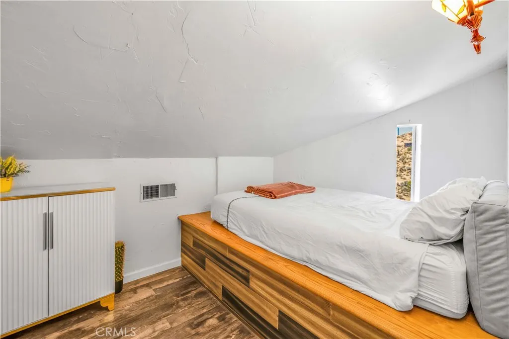 Permitted Short-Term Rental with Panoramic Views, Boulder Formations and Perched high above Yucca Valley, this stunning 2-story home offers unmatched views, incredible privacy, and a rare combination of natural beauty and income potential. As you arrive, youll immediately appreciate the secluded hillside location surrounded by massive boulder formations and sweeping views of the valley below. Step inside to be welcomed by gorgeous custom woodwork throughout and a spacious open-concept main living area featuring soaring vaulted ceilings and large windows that flood the home with natural light. The fully remodeled kitchen is the heart of the homestylish, functional, and open to the living space for effortless entertaining. Just outside, the wrap-around deck is where youll want to spend all your time, soaking in the breathtaking views, starry nights, and serene desert sunsets. Downstairs, you'll find two large bedrooms, each with their own remodeled ensuite bathrooms, including the primary suite, which features multiple closets, modern finishes, and expansive windows with stunning views. Theres also a third full bathroom downstairs for added convenience. Upstairs offers multiple sleeping areas, a private bedroom, and a half bath, making it perfect for hosting guests or maximizing rental income. The finished garage has been converted into a game room, adding even more space for entertainment and relaxation. One of the biggest perks? The land itself is truly special, dotted with impressive rock formations and offering some of the most elevated and unobstructed views in the area.