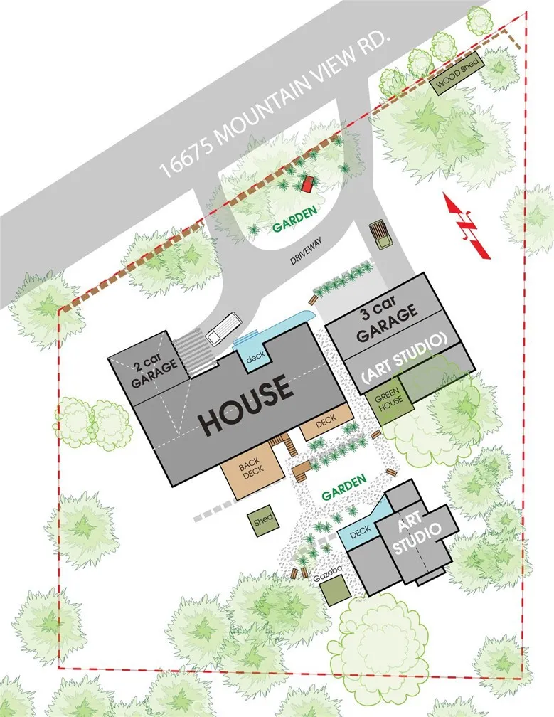 CLAIM YOUR PRIVATE MOUNTAIN RETREAT. This unique .69 acre property boasts three primary structures. HOUSE. (4 bed/3 bath, 1960sq.ft.), with an attached 2 car garage. Step into the formal entry and admire the forest through expansive windows. The open-concept living space features a vaulted ceiling, walk-out covered porch, a bright open kitchen with a center island stove, perfect for entertaining. A roomy master bedroom with walk-in closet lures you into the serenity of a beautifully tiled en-suite, complete with walk-in shower and jetted tub. Down the hall is a central bath and three more bedrooms, one with it's own private bath and one with built in cabinets and separate entrance to the garage currently serving as a spacious laundry room. ART STUDIO: (960 sq. ft.) Styled like an English cottage, this permitted studio/future ADU unit, features floor-to-ceiling bow windows, loft, and light drenched three season sun room with full basement for more workspace and storage. DETACHED 3 CAR GARAGE/WORKSHOP: (28'x36', 1008 sq. ft.). This is an artist or hobbyist's dream space with two of the three bays drywalled for easy heating/cooling, or, use the entire garage to store your favorite toys. A pull through driveway with RV access offers plenty of parking. PROPERTY: The fully fenced yard backs up to a 41 acre parcel of wildlife-rich forest, adding privacy as you enjoy the sun in one of two gardens. Relax under a covered gazebo or tinker in the green house or garden shed flush with grape vines. The home is conveniently close to local markets, coffee shops, restaurants and golf course