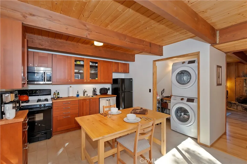 Beautiful gambrel style home located on a cul-du-sac road. Great neighborhood and close to HWY 38. This property sits on a fully fenced 7,200 sq ft lot. The lot has 2 APNS for a lot of potential. Newer flooring throughout the home. Nice living area with a wood burning fireplace. The kitchen has been beautifully updated. It has plenty of storage and very spacious. The laundry area has extra space for a pantry or more storage. The kitchen has access to the backyard for those summertime BBQ's. Large full sized bathroom downstairs. Upstairs you will find a half bath and 2 large bedrooms. The 1 bedroom has a balcony to enjoy those morning coffees. Lots of wood accents throughout for the cozy cabin feel. Newer exterior paint. The lot is filled with pine trees for the woodsy feel. Big lot for the extra space and only 10-15 minutes to many places to explore. Enjoy this cabin today.