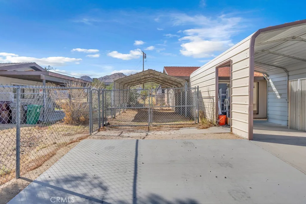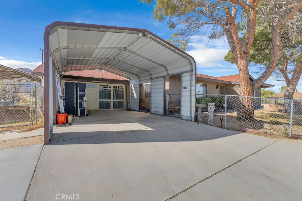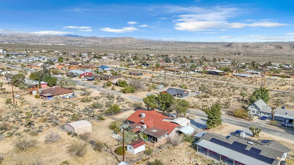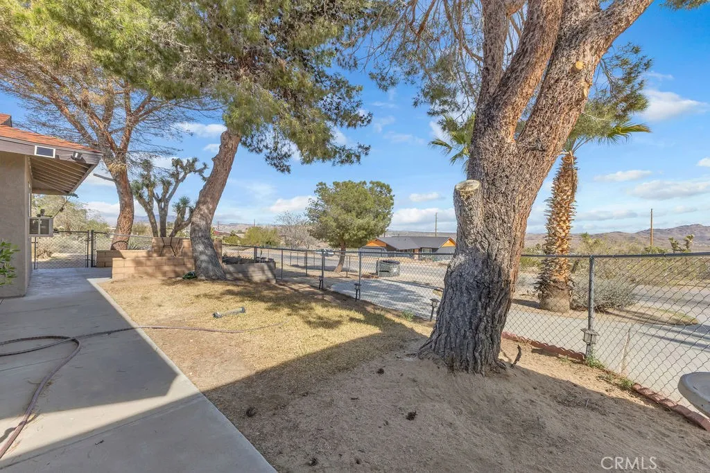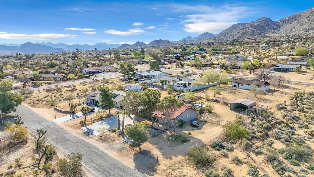Nestled in the desirable Upper Friendly Hills neighborhood of Joshua Tree, this charming two-bedroom, two-bathroom home blends comfort and convenience just minutes from the Joshua Tree National Park entrance. Perched on a spacious lot, the property features a long driveway, a fenced front and rear yard, a carport, and a two-car garage with a roll-up door. Freshly painted and framed by mature pine and fan palm trees, the home boasts an inviting exterior with a gated front yard. Inside, natural wood doors add warmth to both bedrooms, while central HVAC and an additional window AC unit ensure year-round comfort. The bathrooms retain their original tile countertops and are complemented by a newer water heater and a convenient hall coat closet. The primary suite offers an en-suite bath with a walk-in shower. For added convenience, laundry hookups are located in the garage. A highlight of the home is the enclosed sunroom, complete with a spa for relaxation. The back patio features a swamp cooler, while the rear yard includes RV hookups, a pad for a small RV or carport, a storage shed, and two double gates for easy access. With its unique features and generous outdoor space, this home is the perfect desert retreat. Do not let this incredible opportunity pass you by!