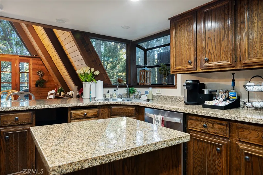WOW, WOW, WOW!!! Looking for a Super Cool RUSTIC CABIN with a GREAT MOUNTAIN VIBE to Escape to? YOU WILL ABSOLUTELY LOVE this One with it's A-Frame Windows, Woodburning Stove and Cutesy Mountain Touches Throughout! You Won't Feel Cramped Here with Five Bedrooms Generously Spaced Apart, including an En Suite Bedroom on the Main Level! The Oversized Family Room is Sooo Dreamy with a Cozy Wood Burning Fireplace and HUGE WINDOWS Everywhere to Watch the Snow Fall! Did I mention Snow? Just a 10 Minute Drive to Snow Valley Ski Resort (Woot, woot!) and 15 Minutes to the Lake Arrowhead Village! The Island Kitchen with Breakfast Bar for the Kiddos has Oodles of Storage Space & Looks out to the Wall of Windows that Opens to the Amazing Back Deck Area! The Decking Runs the Length of the House and Has Multiple Sitting Areas that Overlook the Forest. PERFECT FOR ENTERTAINING!!! So Peaceful and Serene!!!! The 5th Bedroom Has a Separate Entrance Down Below. Recently this Home Has Been a Very Successful Air Bnb, Bringing in Approx $500/night!! Totally Level Entry into this Home too and a Big Backyard Makes this a Perfect Full time Home too! Come & See!!