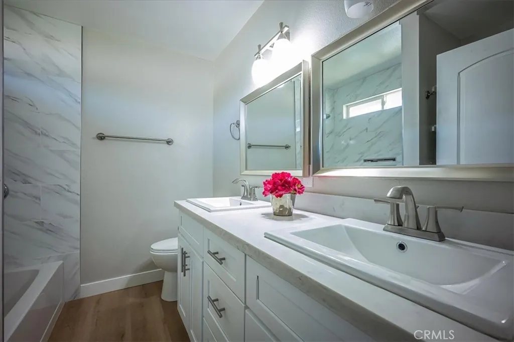 Great home on a cul-de-sac street! Recently upgraded. Improvements include new kitchen cabinets and quartz counter tops. New flooring throughout. New recessed lighting. New appliances, new range/oven will be installed before close of escrow. New interior and exterior paint. New interior doors. New sod in front yard. Large living room. Family room is close to kitchen with a slider to the back. 3 good size bedrooms with ceiling fans. Full bathroom in hallway with new vanity, new light fixture and new toilet, new tub, new shower wall tile. Nice size Primary bedroom with primary bathroom with double sink vanity, new faucets and light fixtures. Interior laundry. 2 car garage. No back neighbor! Central air and heat. Tile roof. All of this at a great price! Hurry this one will not last...