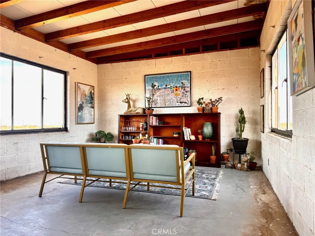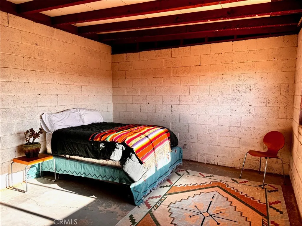 ***THUNDER ROAD*** Built in 1958 by Swedish emigre Sigrid Larsen, this mid-century classic sits on 5 acres and features concrete floors, original steel windows, cement block construction and bullnosed window sills. The original blond exposed beam ceilings extend from the main living area into the bedroom. The ample windows wash the interior with light. The ingenious L-shaped floor plan makes the most of the square footage with a large open living space/kitchen area with private bedroom and bath. Step out the living room door to an ample concrete patio with epic views of the Pinto Mountains of Joshua Tree National Park. From the bedroom, incredible sunset views over the snow-capped San Gorgonio Mountain. It is 5 miles from the Joshua Tree National Park visitors center, 29 Palms Inn, Kitchen in the Desert and Grndsqrl. There is a power pole to the cabin and Southern California Edison paperwork has been started to reconnect electricity. Classified as a "single family residence," this home can be upgraded without the extreme requirements of making improvements to a property classed as a "recreational cabin." It is a project and requires a creative eye to see the potential, but when finished, it will be a very unique true mid-century gem.