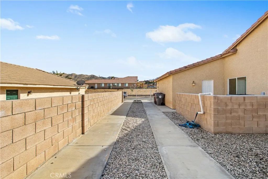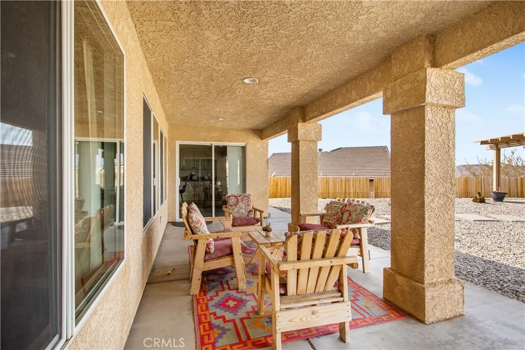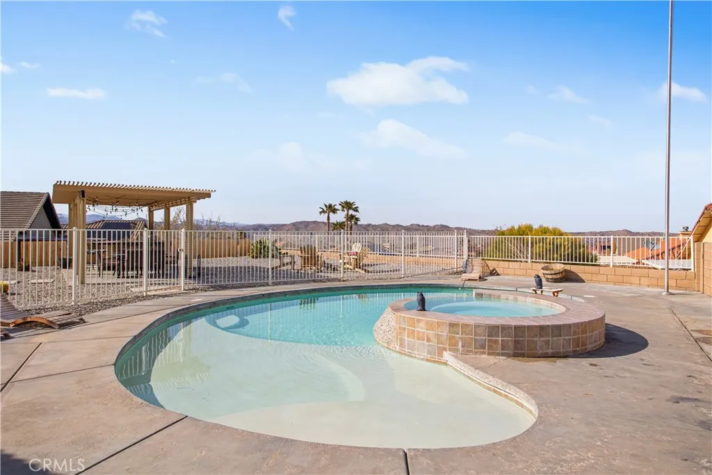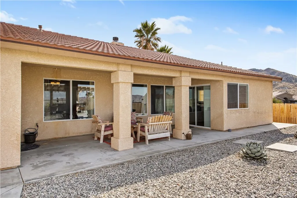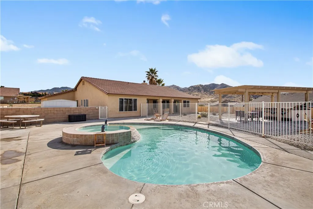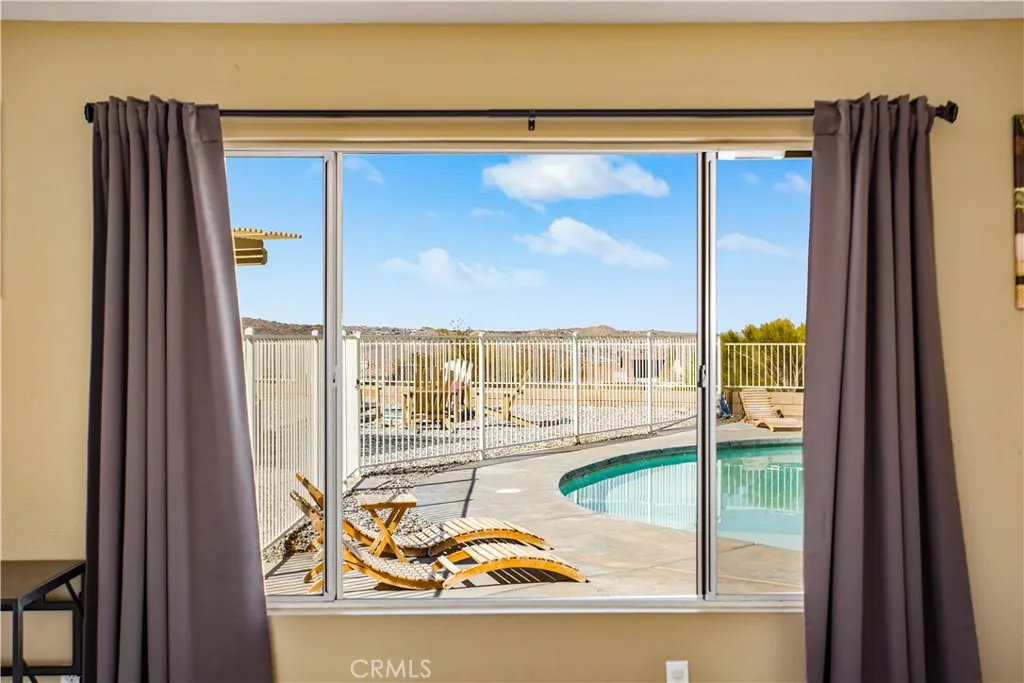 Outstanding Single Level Pool Home w/RV Parking in the prestigious Copper Hill community, and just minutes from Joshua Tree National Parks West Entrance. Featuring 4 bedrooms (3 of them w/attached full bathrooms), a 3-car garage with large circular driveway, gated RV parking with a 50-amp service connection, panoramic mountain views, and a backyard youll absolutely love. Built in 2006, this home was designed for both comfort and style. A double-door entry welcomes you into a wonderful layout featuring high ceilings, elegant architectural details, and an open, airy feel. The formal living and dining areas provide a refined touch, while the family room with a dual-sided fireplace adds warmth and charm. The spacious kitchen features granite slab counters, a double-oven, stainless steel appliances, an island w/storage, and a breakfast nook. A well-positioned window above the sink, and a sliding door off the formal dining room invite you to experience beautiful West facing views and sunsets. A 2nd sliding door off the kitchen opens to an outdoor covered seating area, which is also accessible from a 3rd sliding door found in the primary bedroom. This home masterfully blends indoor and outdoor living for maximum enjoyment. The primary suite is extra spacious, complete with both a walk-in and standard closet, a dual sink vanity, a jetted tub with separate tiled shower, and direct access to the covered patio and fenced pool area. The secondary bedrooms are generously sized, and Youll Love the Direct Bathroom Access for 3 out of the 4 bedrooms. An inside laundry room is convenient an