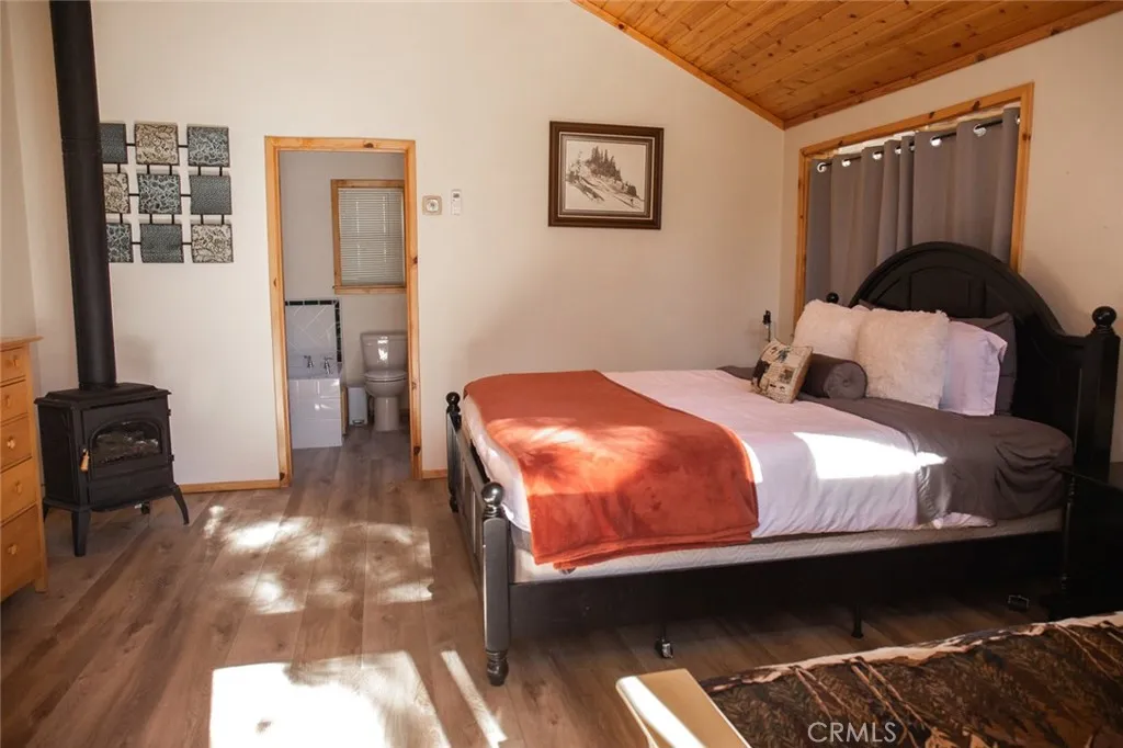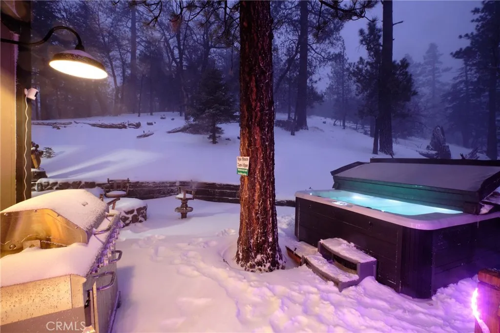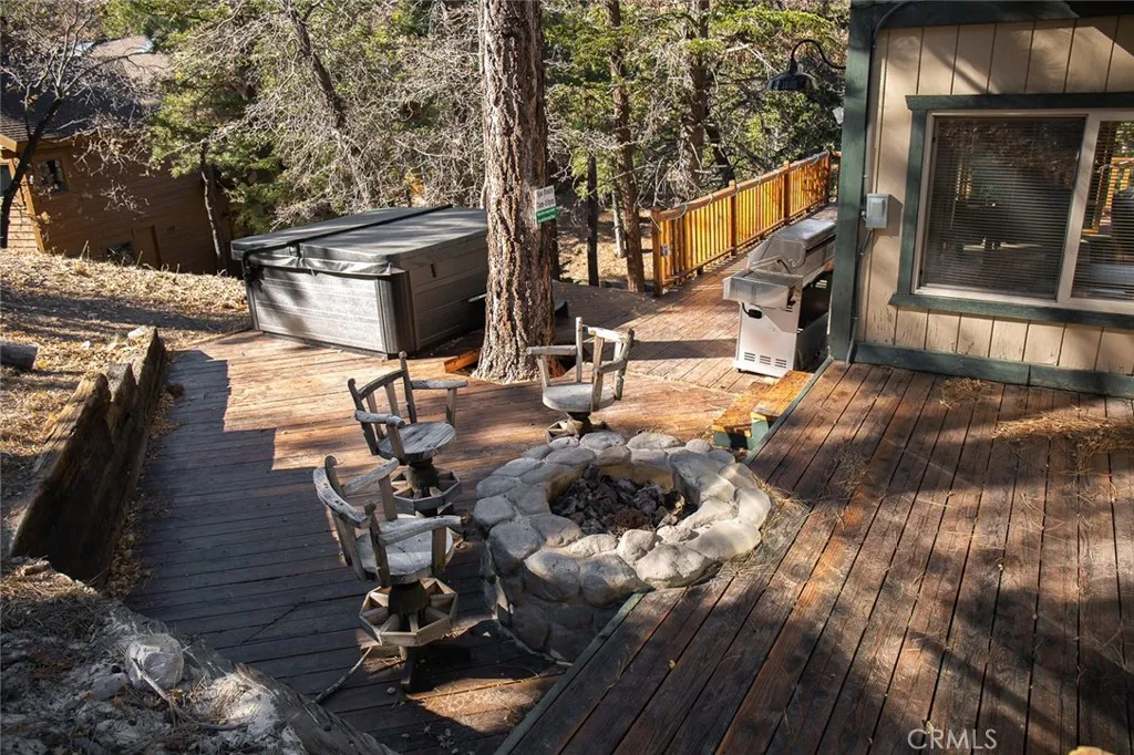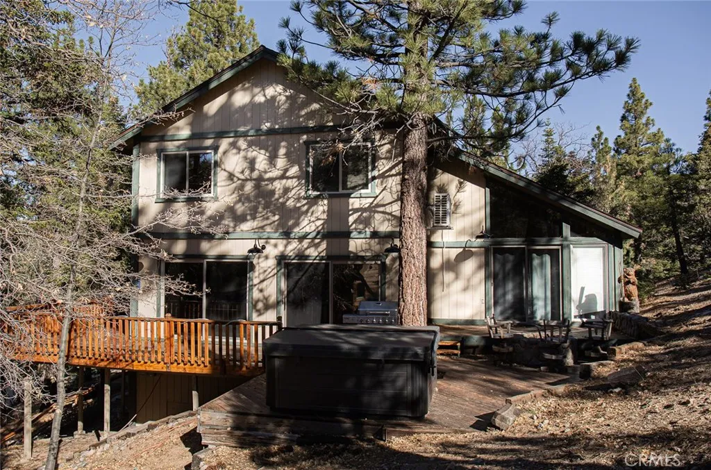 24,532 square foot lot ! At the end of a quiet cut-de-sac. 4 bedrooms, 3 full bathrooms, many trees around, central heating, a/c in 2 rooms, large spa, gas fire pit, gas bar-b-q, newly refinished deck, internet controlled e-lock, new 200A main electric panel with generator hookup, enclosed build-up, new induction cooktop, newer G.E. Monogram Stainless fridge, additional fridge in laundry area, dishwasher, New LG washer/drier stackable laundry center, silent exhaust fan in 2 bedrooms, gas heater in master bedroom, wood fire place with gas starter in living room, 2 TV sets, 2 parking spaces (4 total). This property have been a very successful holiday rental. Lot line bordering the national forest, and hiking trails, Minutes from Bear Mountain ski slopes, and the lake.. Ideal location to escape, and breath fresh mountain air. Beautiful home located in desirable upper Moonridge. Exceptional combination of location and living quality. The view is Stunning! It is exceptional. Fully furnished, everything included.